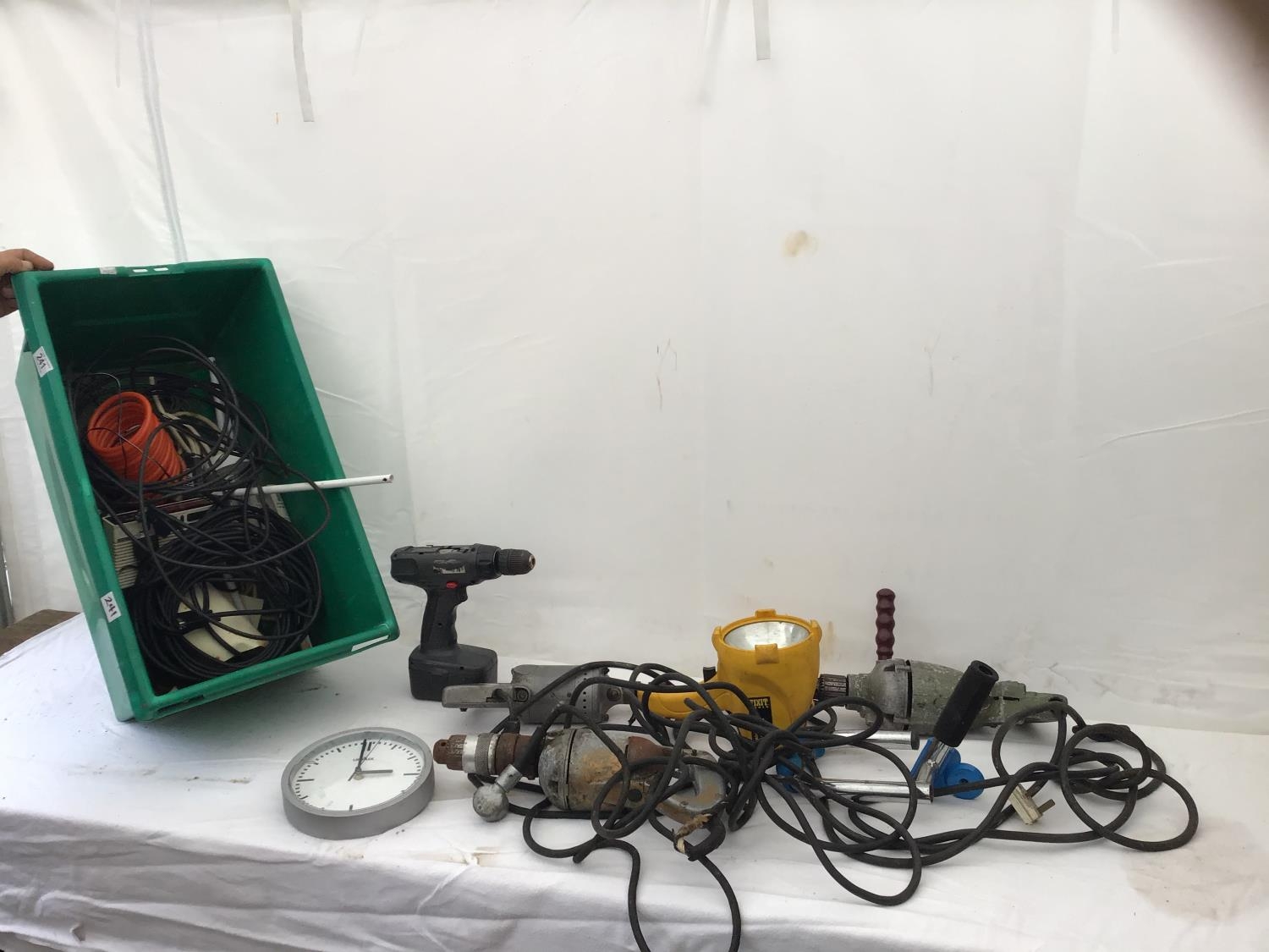 BOX OF VARIOUS POWER TOOLS CABLES ETC