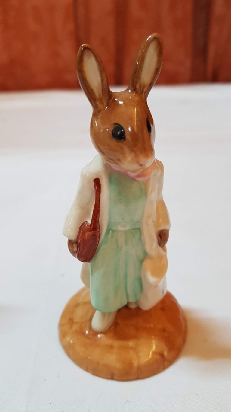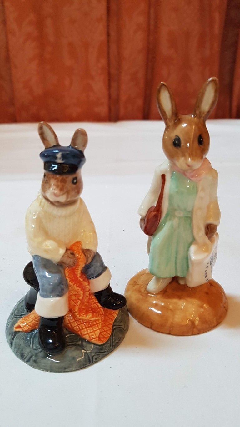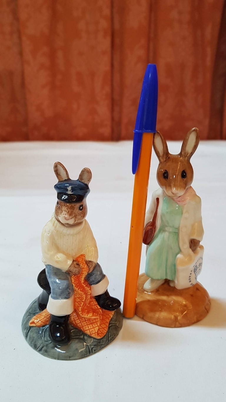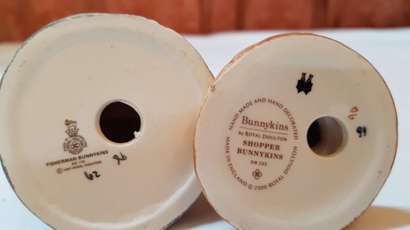 Vintage 2x Royal Doulton Bunnykins Porcelain Figurines; 'Shopper Bunnykins' DB233, Approx. H: 11.5cm and 'Fisherman Bunnykins' DB170, Approx. H: 10cm, Hand Made and Hand Decorated. (2)