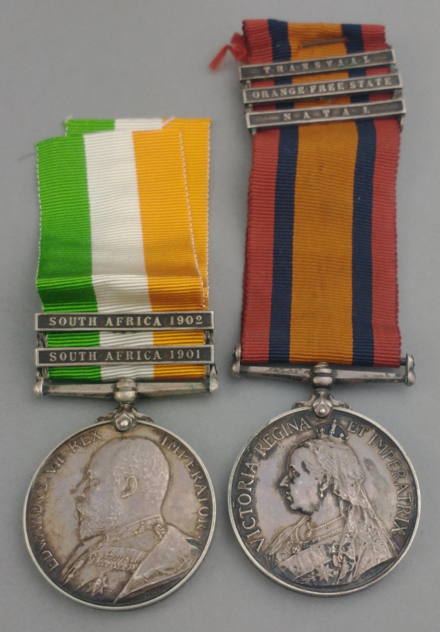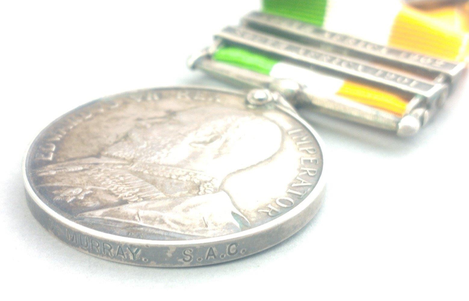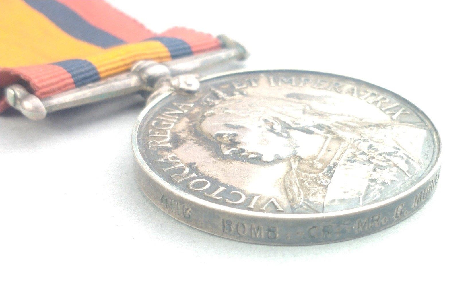 VICTORIA BOER WAR medal pair RFA / SAC comprising Queen's South Africa Medal with Natal Orange Free State and Transvaal clasps and King's South Africa medal with South Africa 1901 and South Africa 1902 clasps. The Queen's Medal is awarded to 4113 Bomb. C. R. Mister G. Murray 86th Bty. RFA and the King's Medal to 1354 Tpr. G. Murray SAC