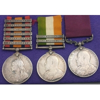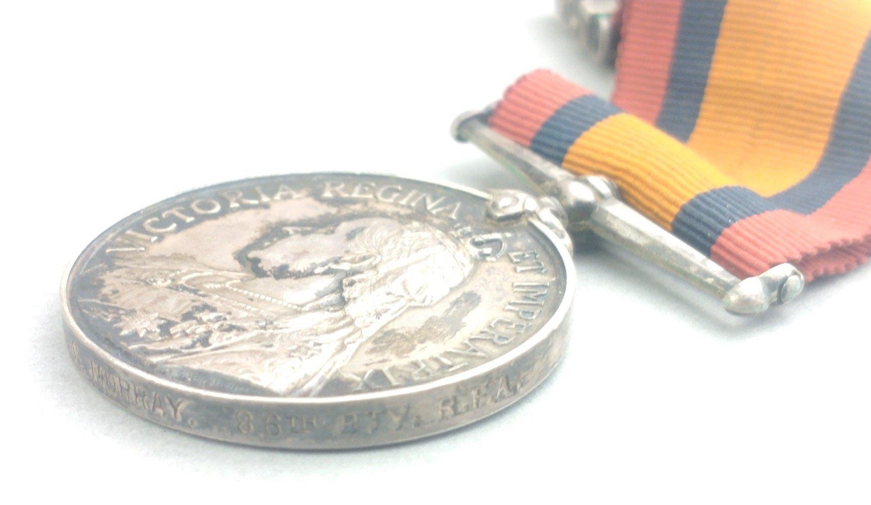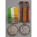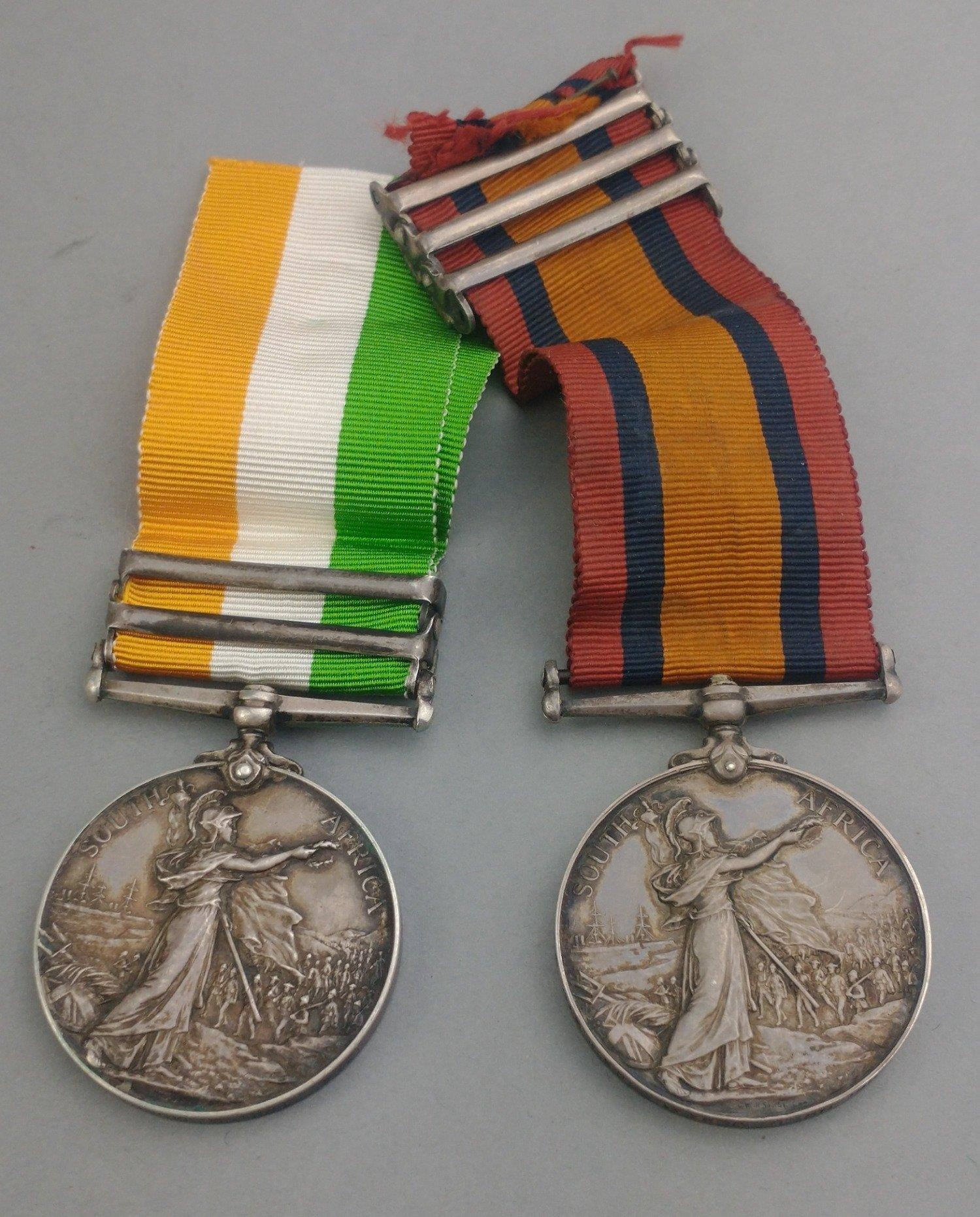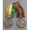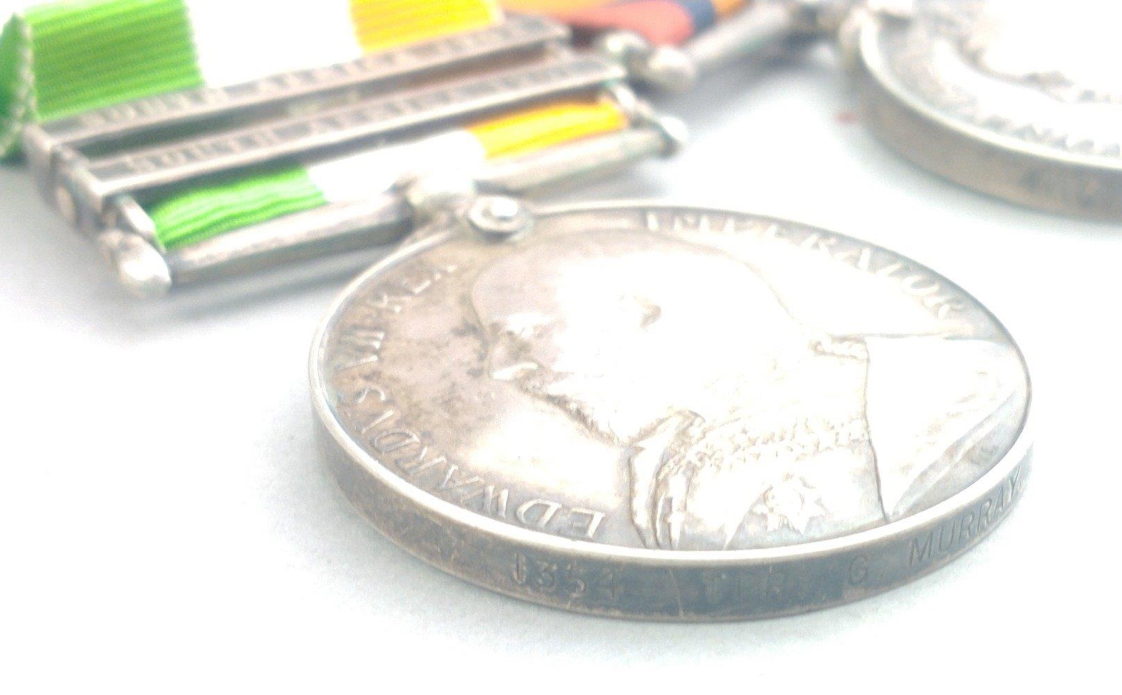 VICTORIA BOER WAR medal pair RFA / SAC comprising Queen's South Africa Medal with Natal Orange Free State and Transvaal clasps and King's South Africa medal with South Africa 1901 and South Africa 1902 clasps. The Queen's Medal is awarded to 4113 Bomb. C. R. Mister G. Murray 86th Bty. RFA and the King's Medal to 1354 Tpr. G. Murray SAC