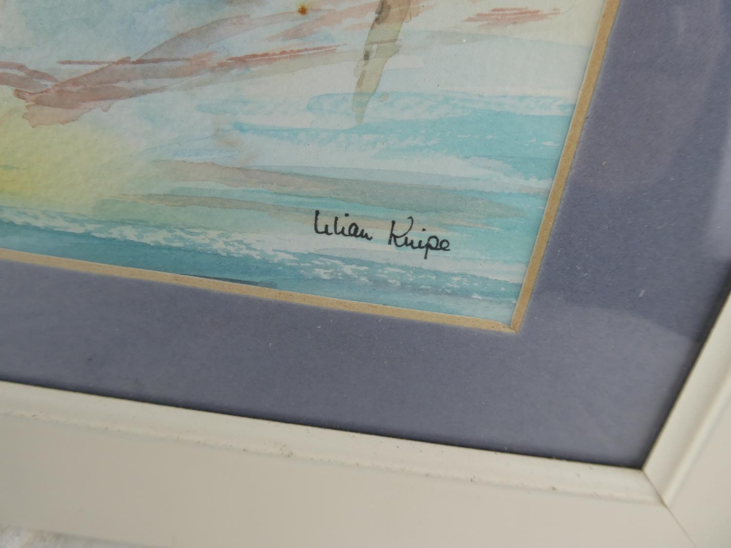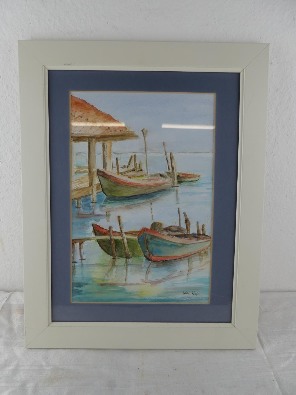 A framed watercolour of a boat scene signed, Lilian Knipe.