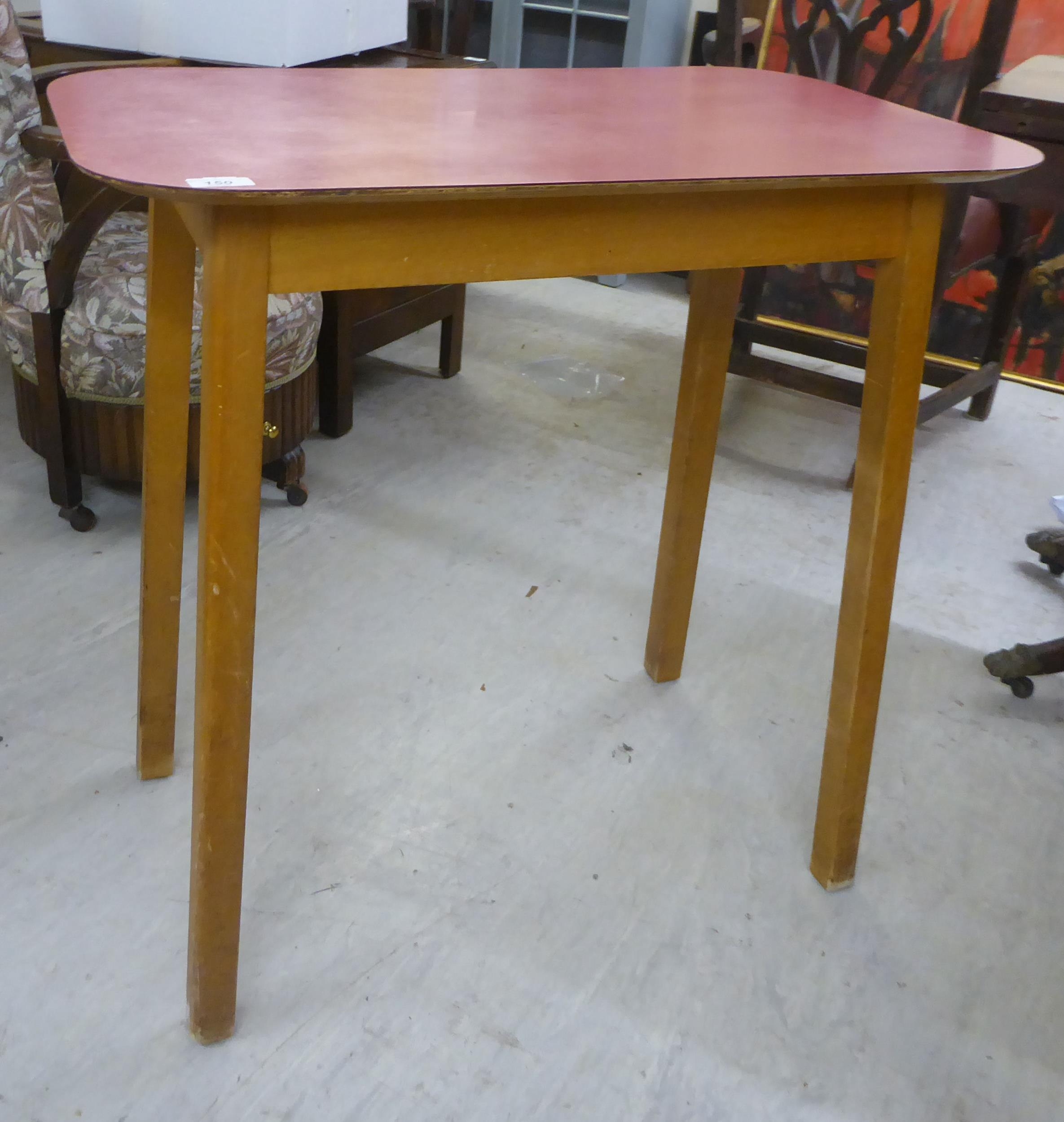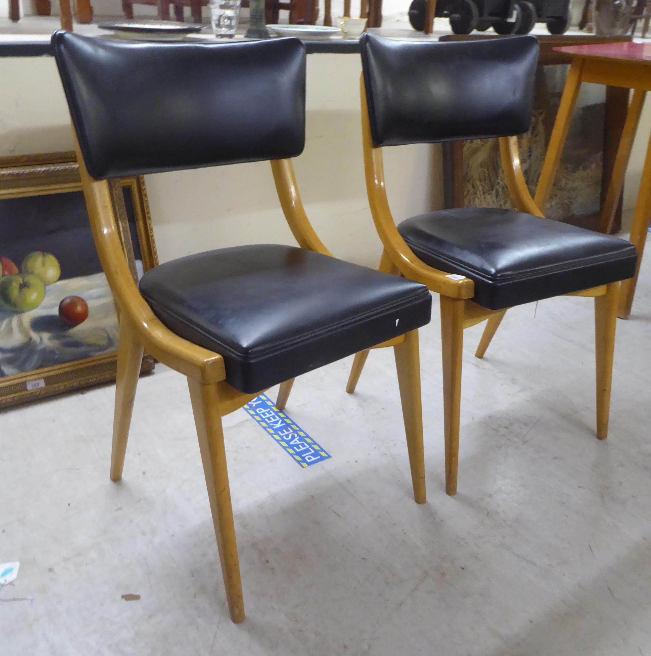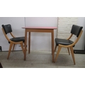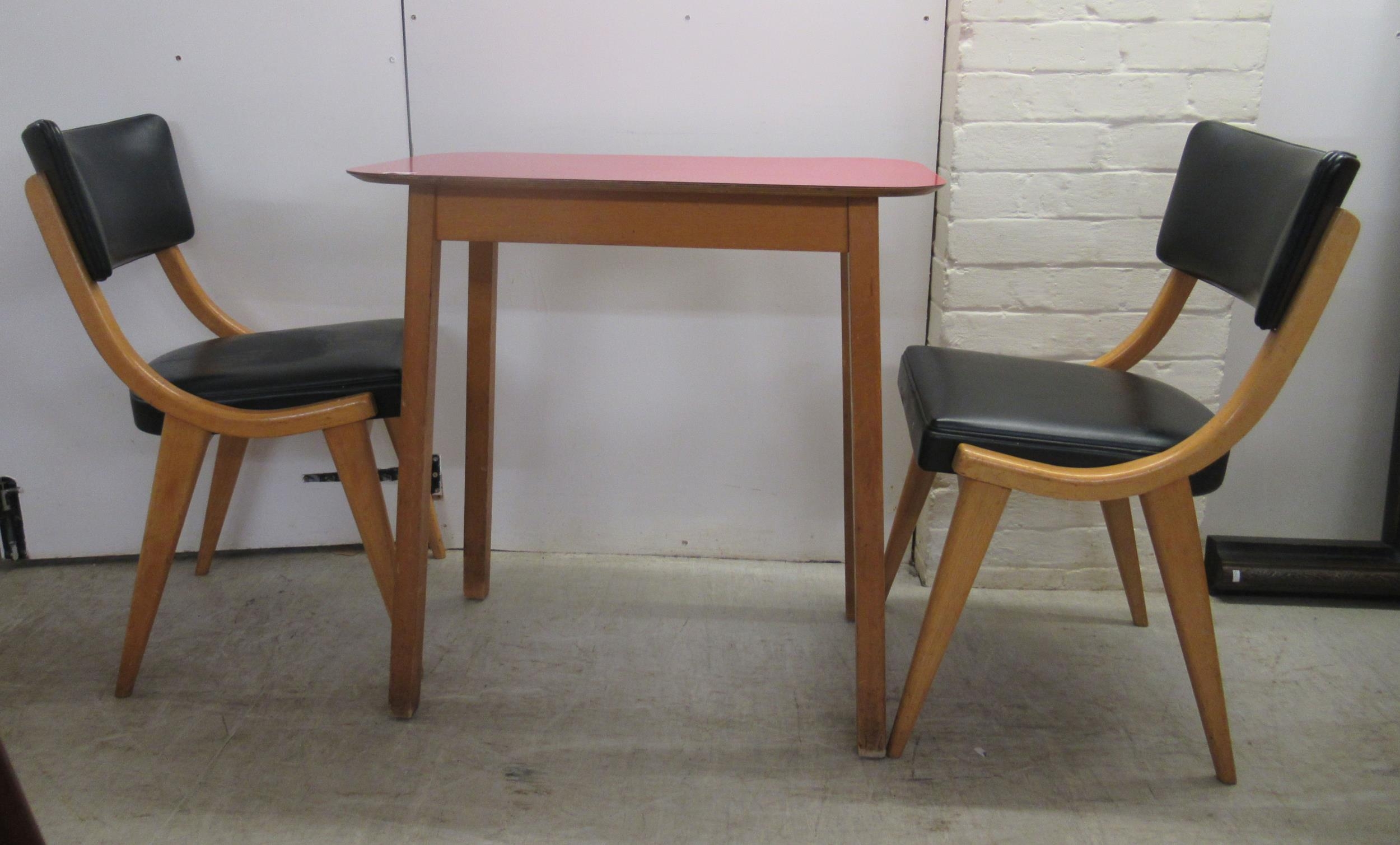 A pair of 1950s/1960s Benchairs of Stowe beech framed dining chairs, each with a faux black hide back and seat raised on tapered legs; and a 1950s PHG & Sons Guildform beech and laminate top kitchen table, raised on square, tapered legs 30"h 29"w