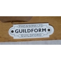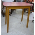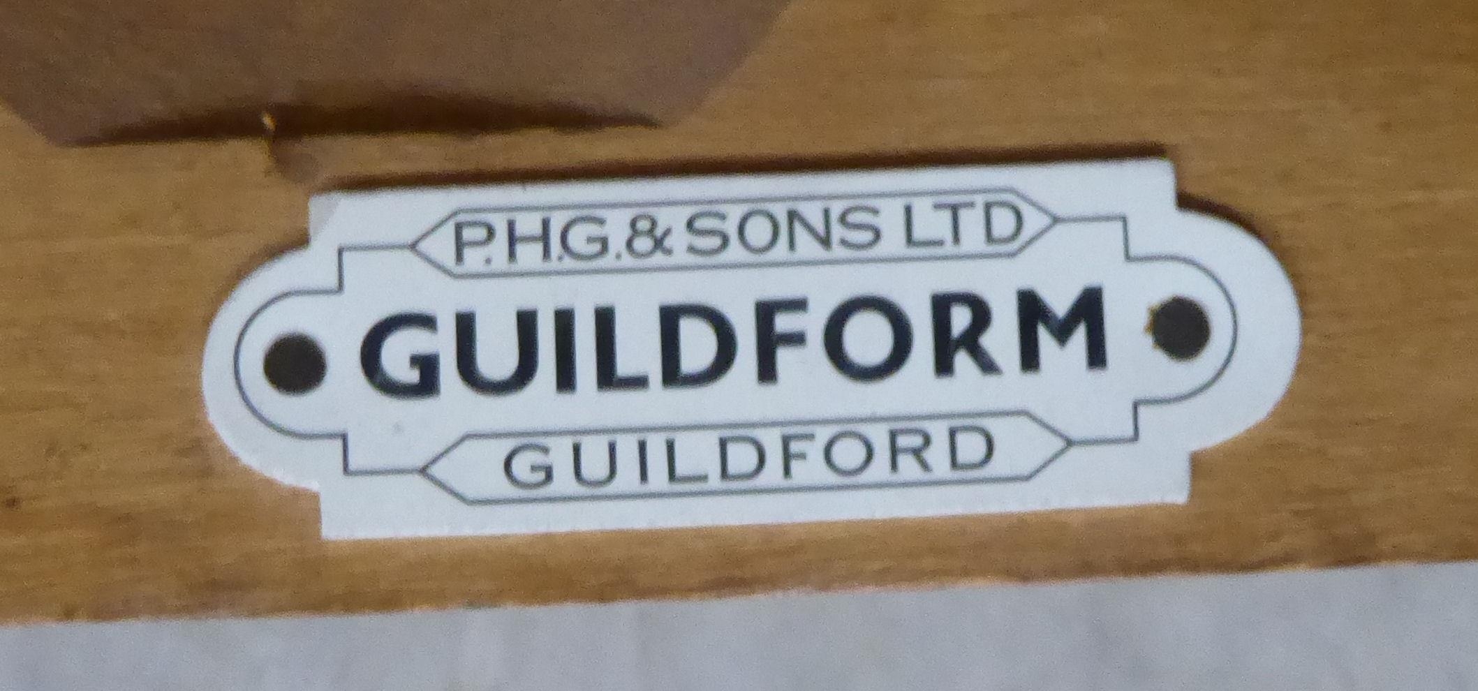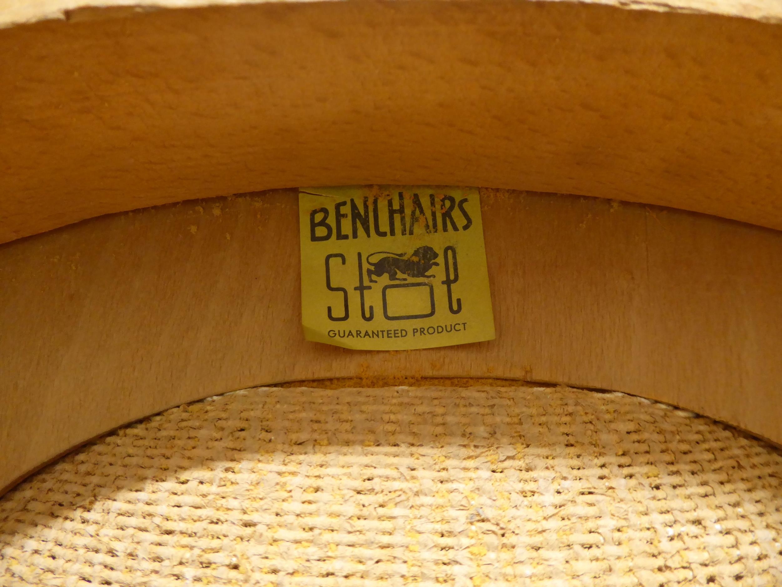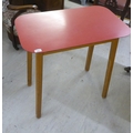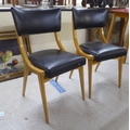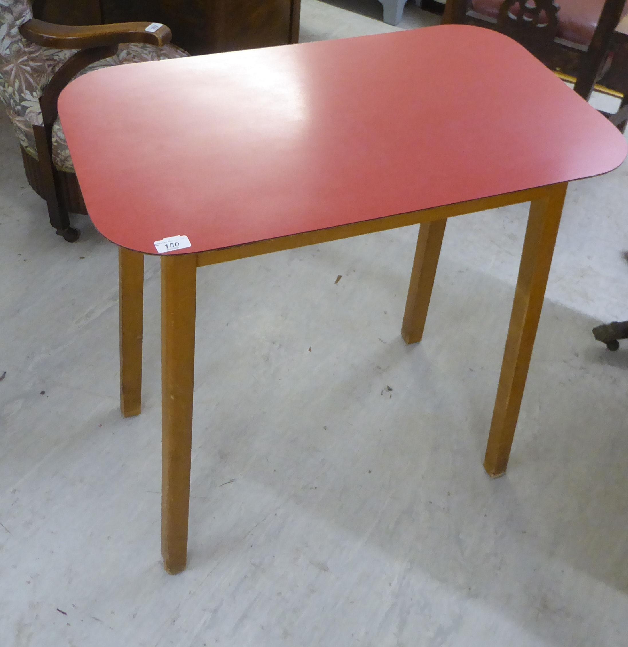 A pair of 1950s/1960s Benchairs of Stowe beech framed dining chairs, each with a faux black hide back and seat raised on tapered legs; and a 1950s PHG & Sons Guildform beech and laminate top kitchen table, raised on square, tapered legs 30"h 29"w
