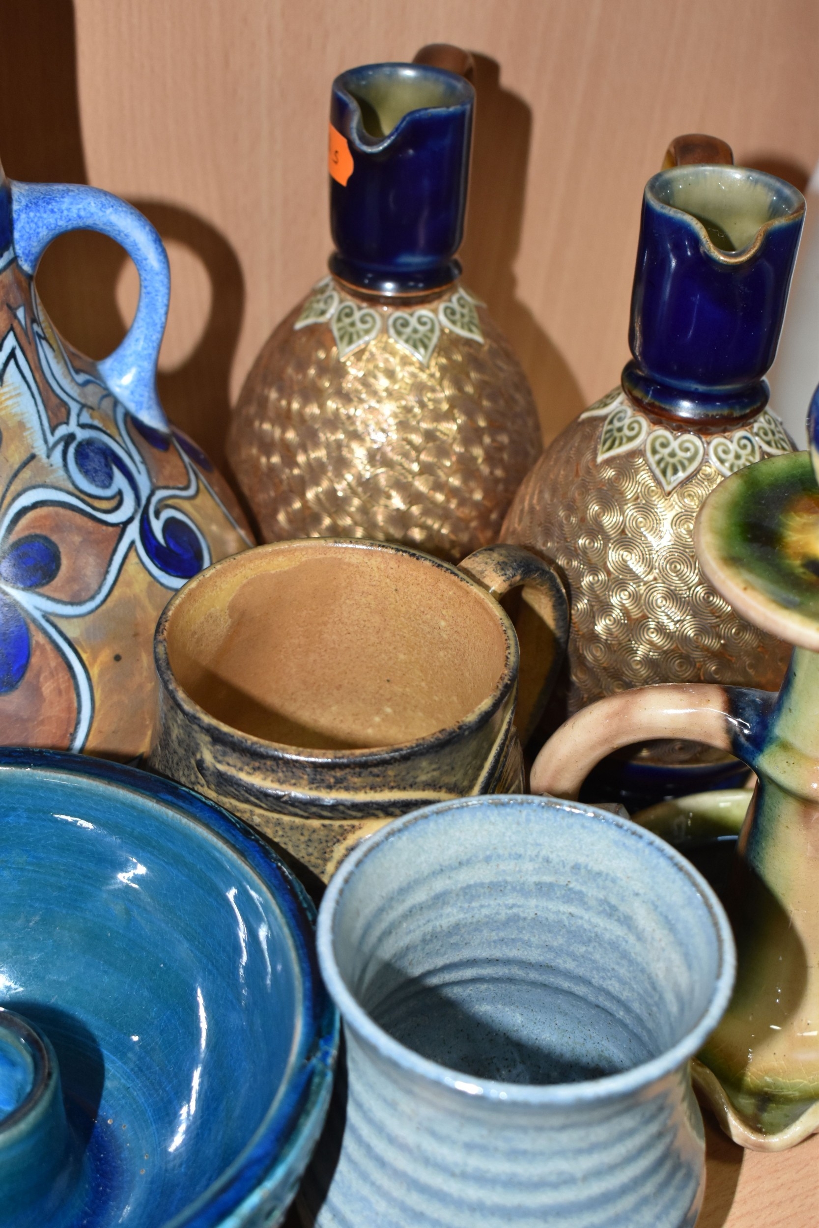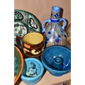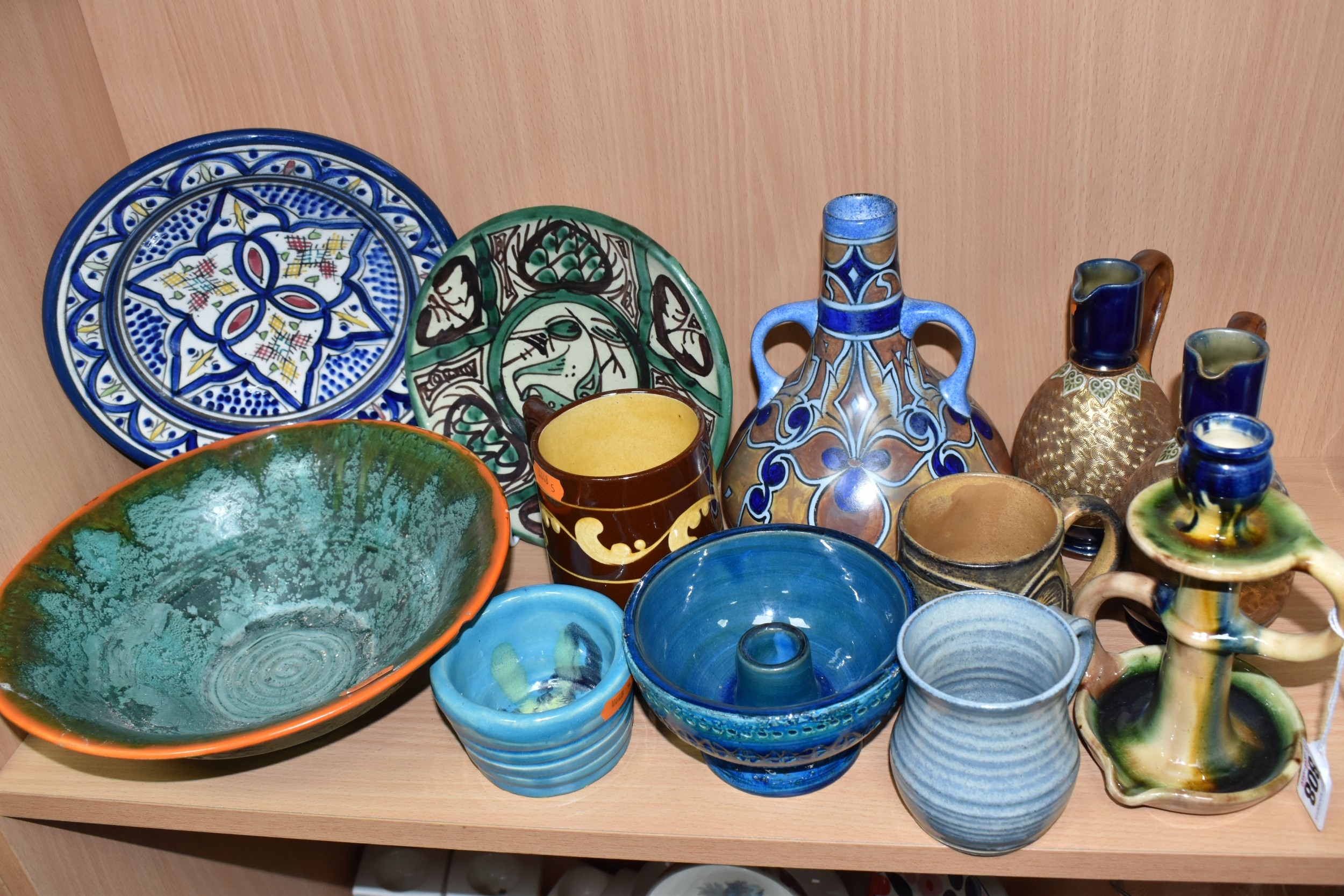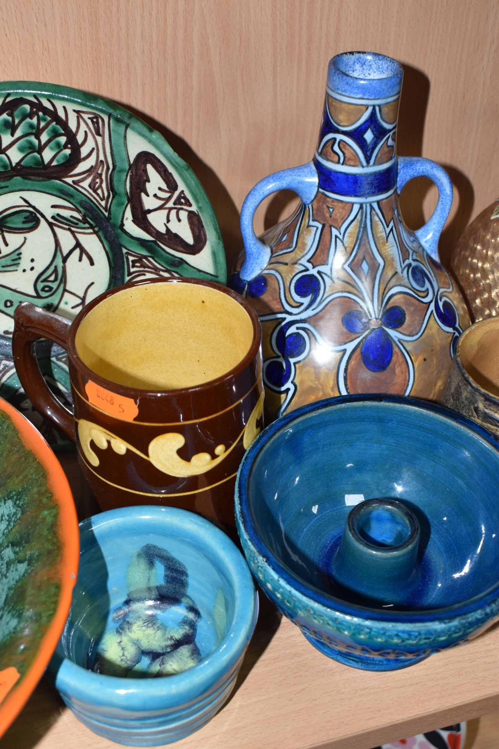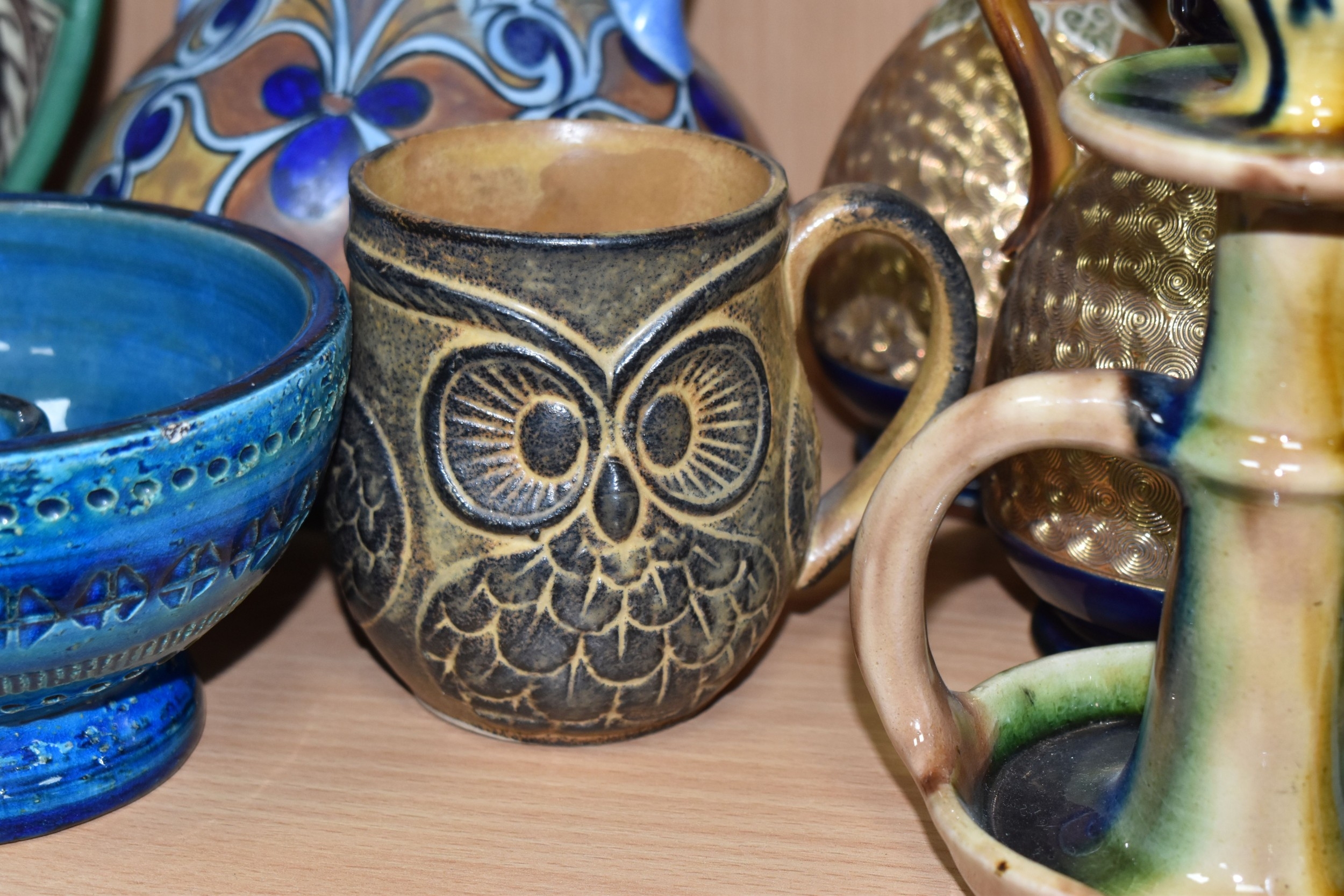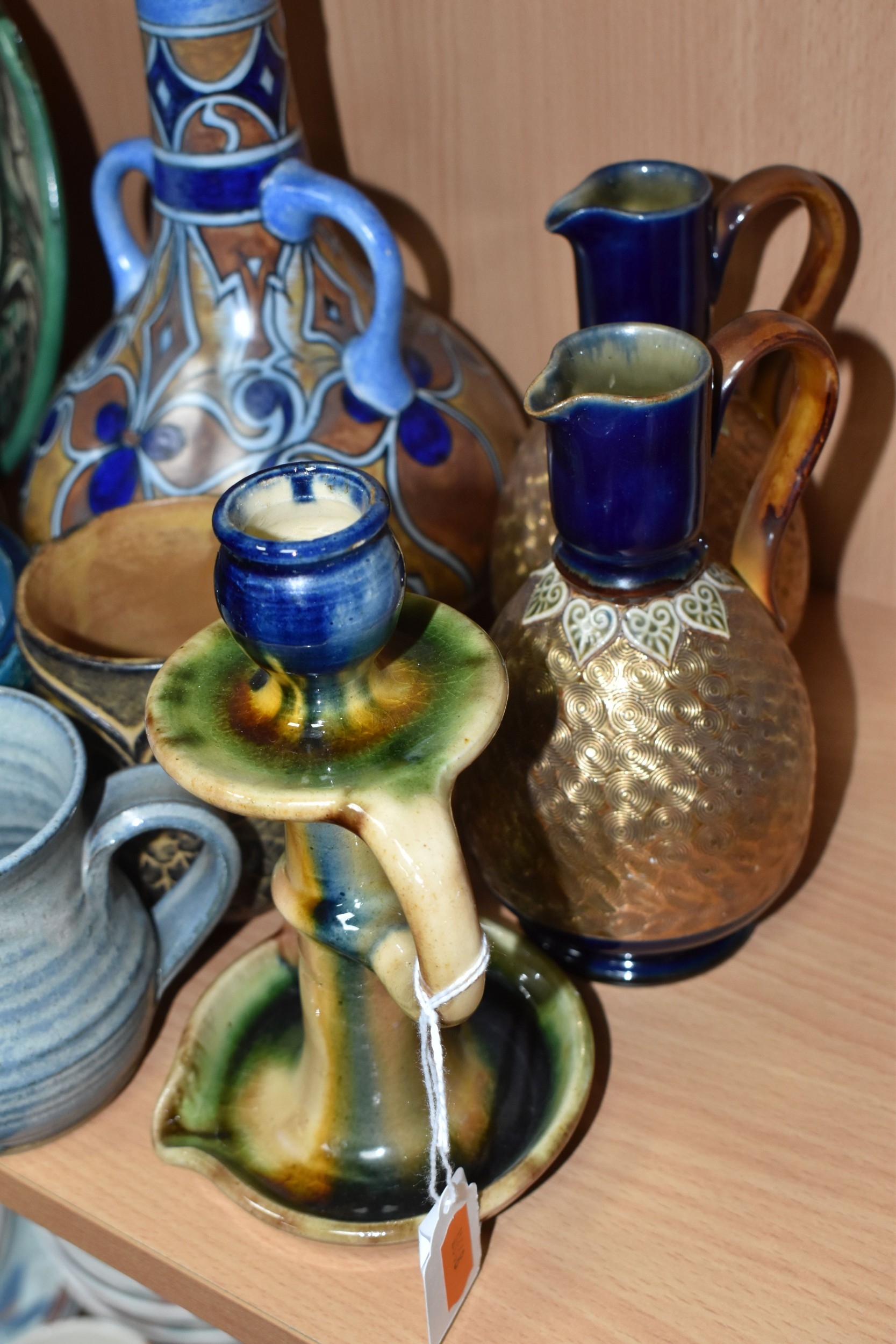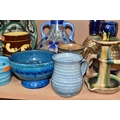 A GROUP OF STUDIO ART POTTERY ITEMS, comprising, Bitossi Rimini Blue 735, candlestick, marked Italy on the base, diameter 13cm, (small chip to the rim) two Royal Doulton Slater gold swirl ewer jugs, makers marks to the base and the number 6619, height 15.5cm, a hand painted plate by Spanish artist Domingo Punter, featuring a bird motive, diameter 19.5cm, signed on the back, Dissing Danish pottery bowl in a green drip glaze with vibrant orange rim, (has had restoration and has a chip out of the edge of the rim), an art deco vase in blues and browns, by George Clewes & Co. Chameleon Ware, (some nibbles in places) and some pottery mugs etc. (qty), (Condition Report: see main description for damage, overall ok)