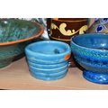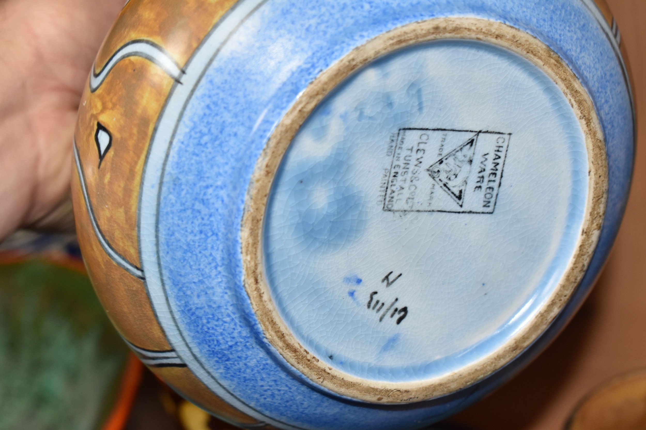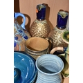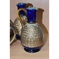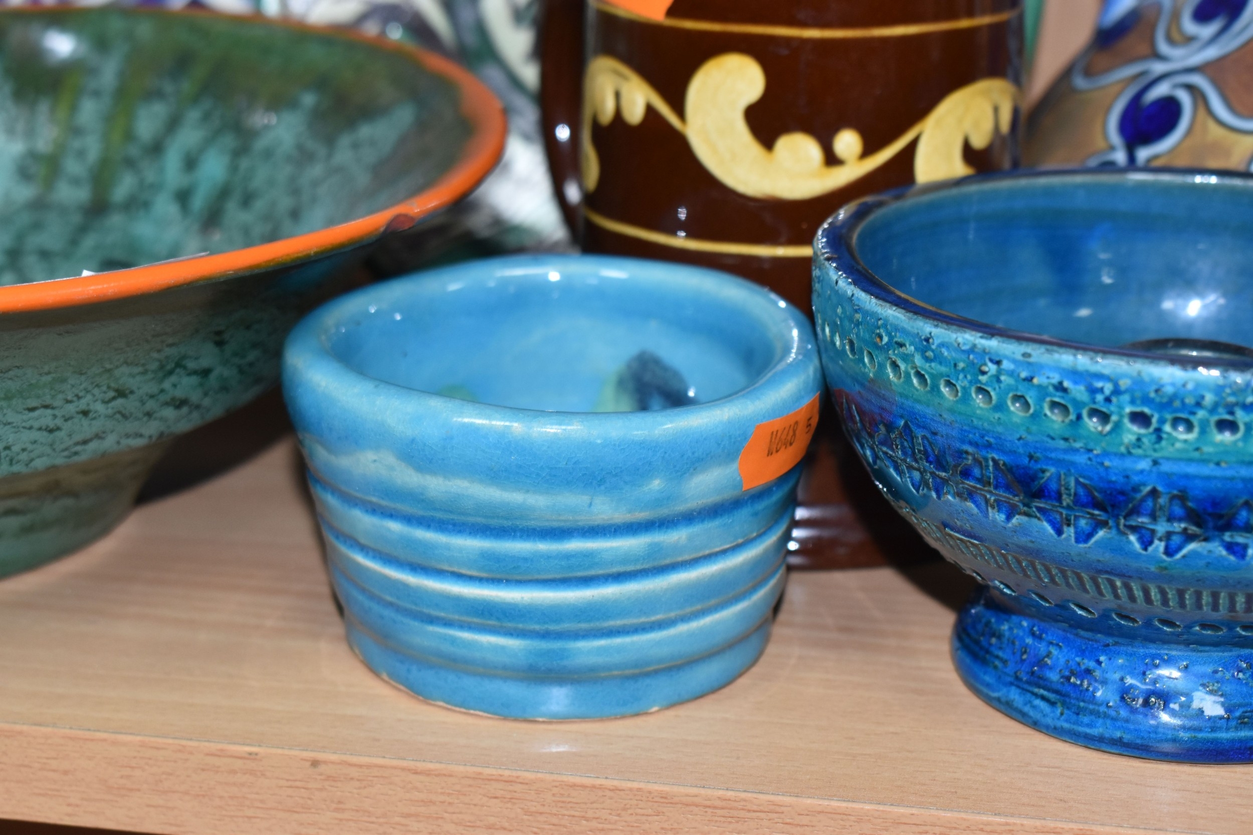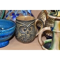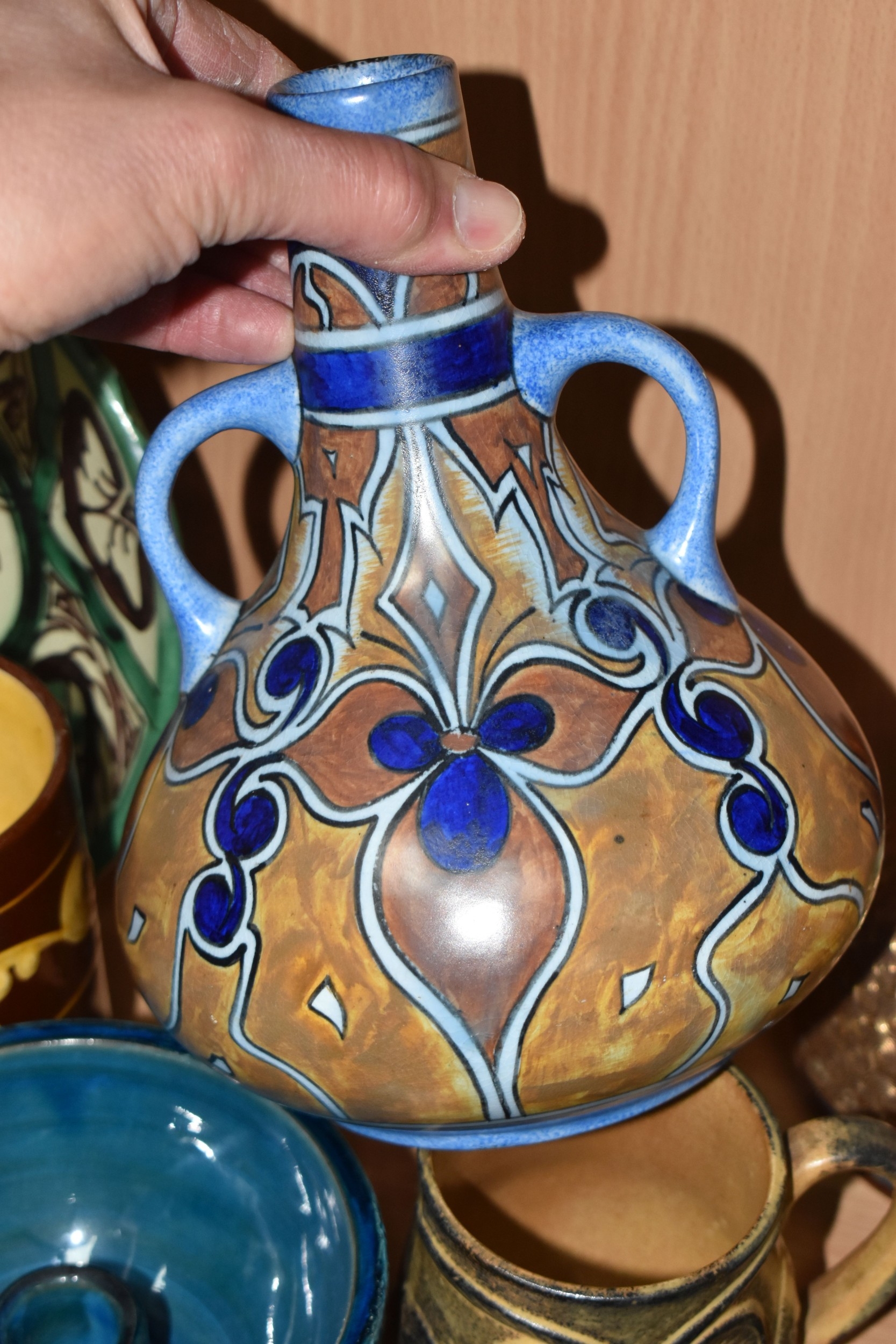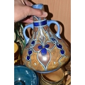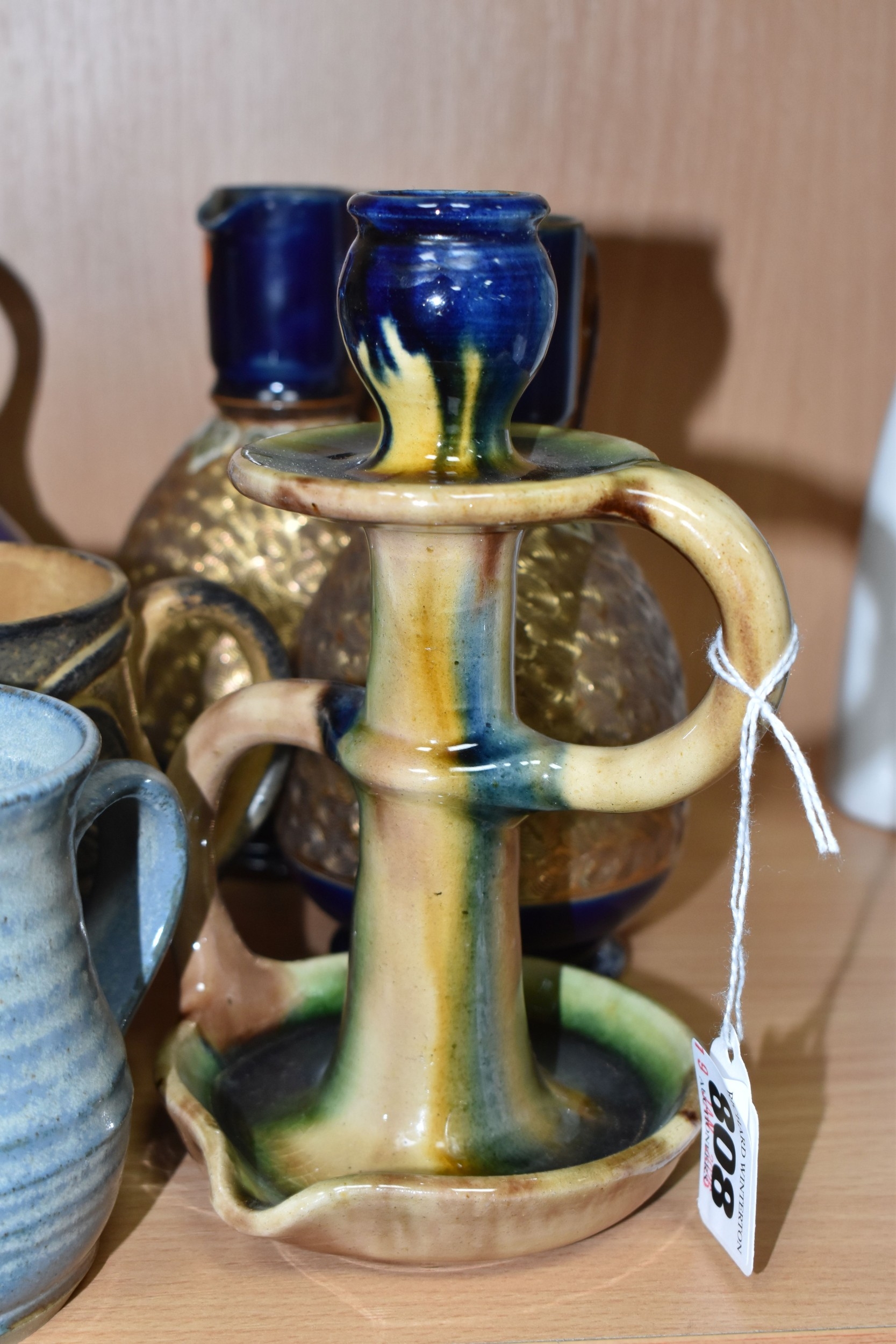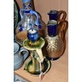 A GROUP OF STUDIO ART POTTERY ITEMS, comprising, Bitossi Rimini Blue 735, candlestick, marked Italy on the base, diameter 13cm, (small chip to the rim) two Royal Doulton Slater gold swirl ewer jugs, makers marks to the base and the number 6619, height 15.5cm, a hand painted plate by Spanish artist Domingo Punter, featuring a bird motive, diameter 19.5cm, signed on the back, Dissing Danish pottery bowl in a green drip glaze with vibrant orange rim, (has had restoration and has a chip out of the edge of the rim), an art deco vase in blues and browns, by George Clewes & Co. Chameleon Ware, (some nibbles in places) and some pottery mugs etc. (qty), (Condition Report: see main description for damage, overall ok)