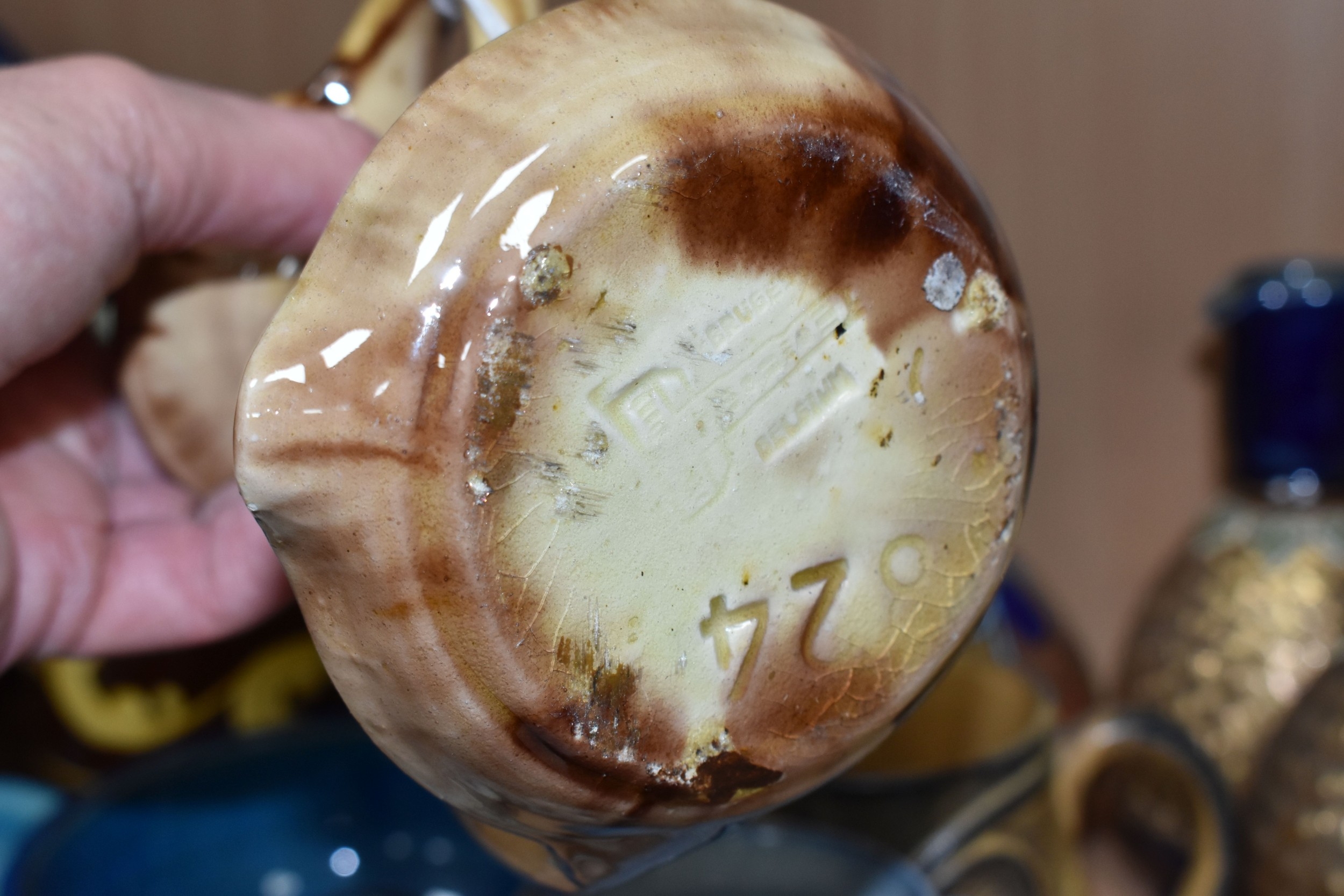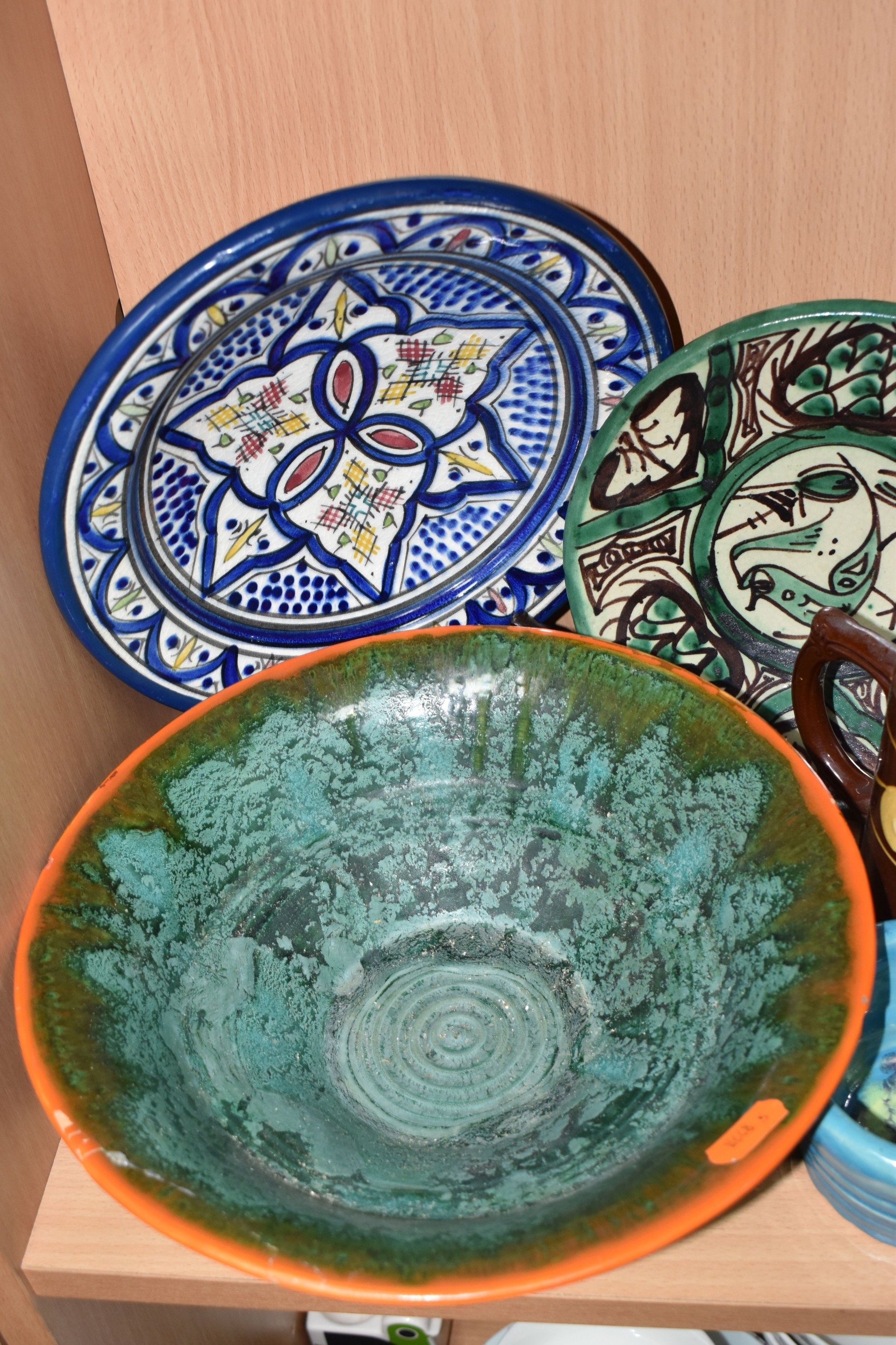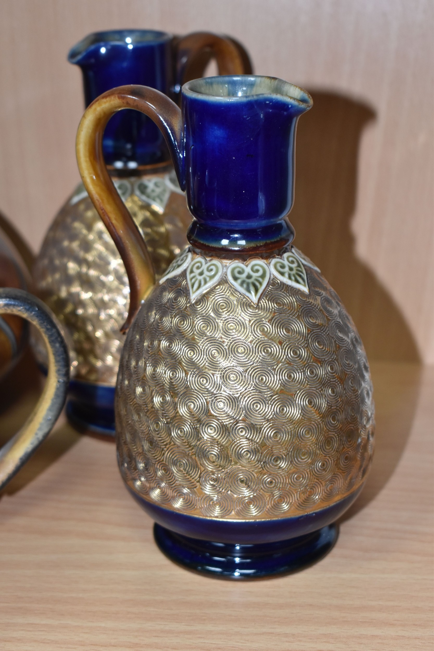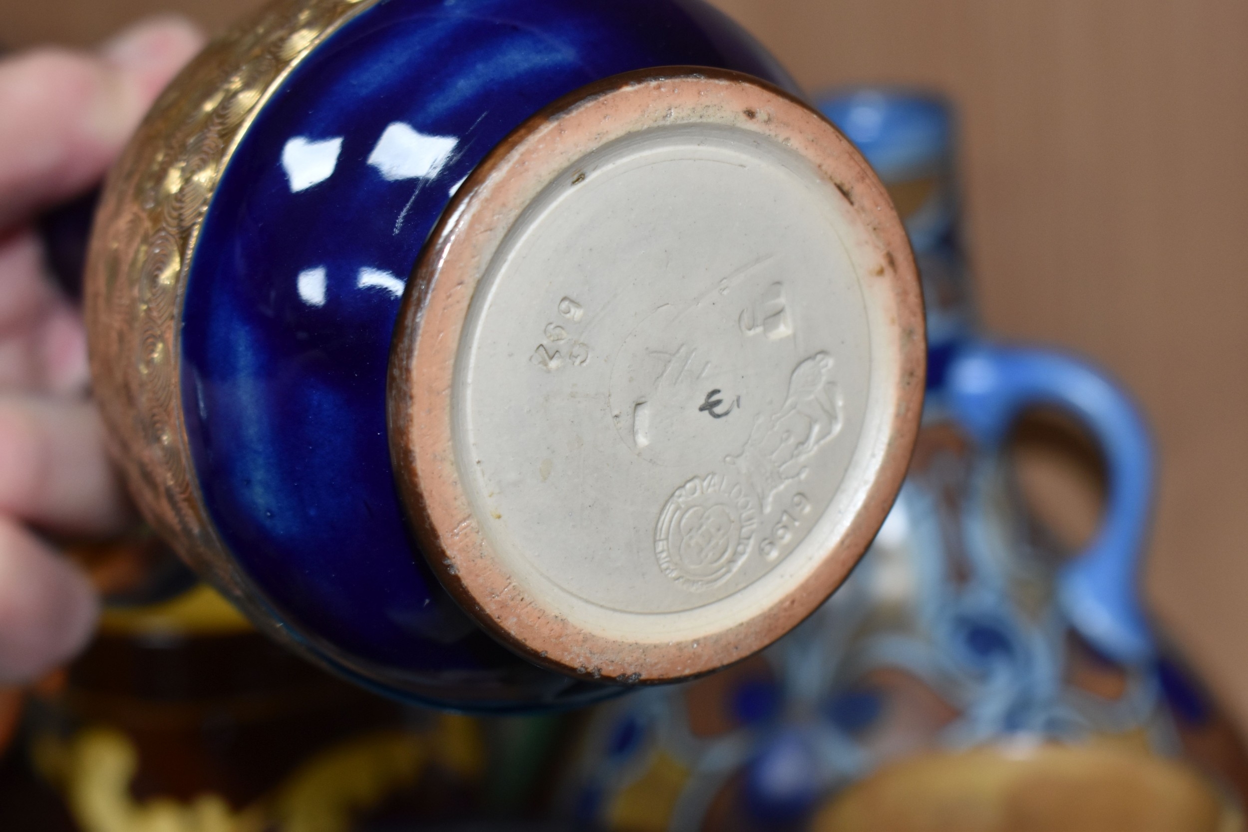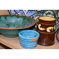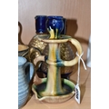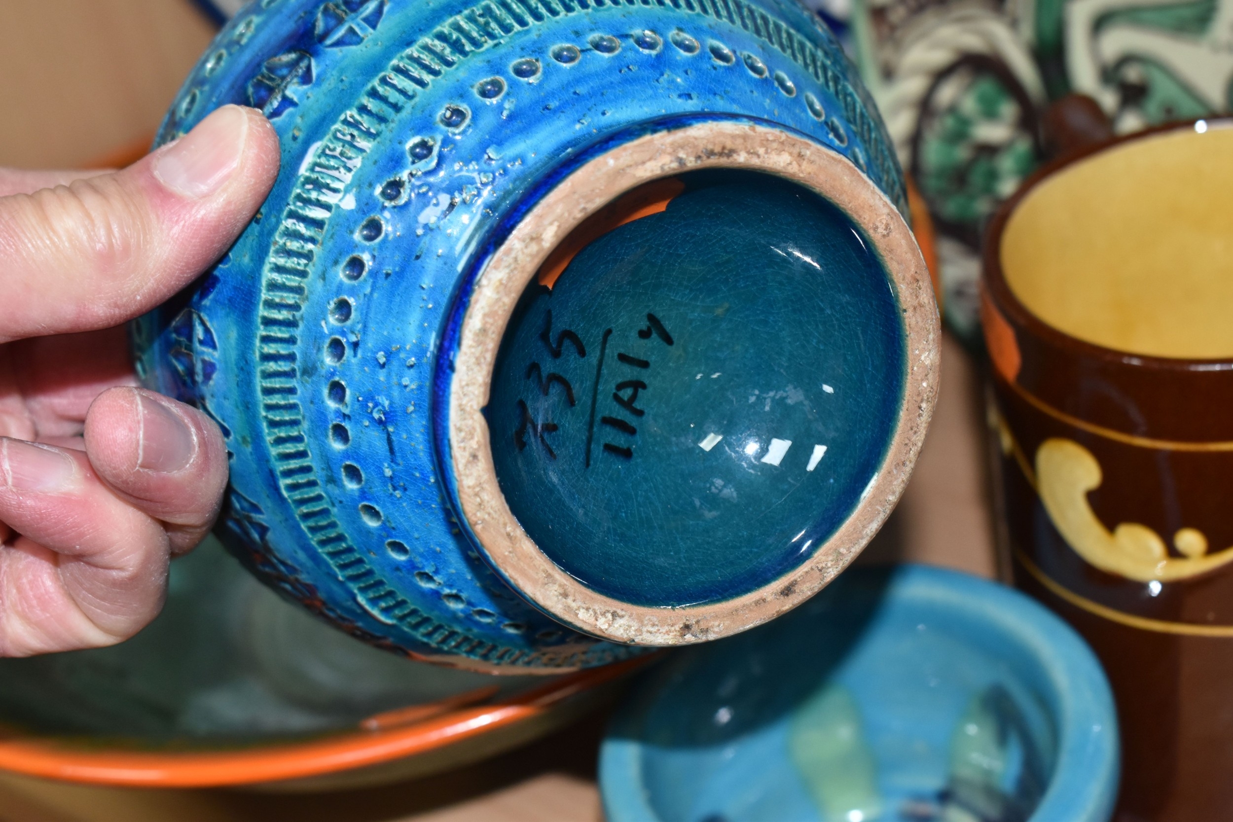 A GROUP OF STUDIO ART POTTERY ITEMS, comprising, Bitossi Rimini Blue 735, candlestick, marked Italy on the base, diameter 13cm, (small chip to the rim) two Royal Doulton Slater gold swirl ewer jugs, makers marks to the base and the number 6619, height 15.5cm, a hand painted plate by Spanish artist Domingo Punter, featuring a bird motive, diameter 19.5cm, signed on the back, Dissing Danish pottery bowl in a green drip glaze with vibrant orange rim, (has had restoration and has a chip out of the edge of the rim), an art deco vase in blues and browns, by George Clewes & Co. Chameleon Ware, (some nibbles in places) and some pottery mugs etc. (qty), (Condition Report: see main description for damage, overall ok)