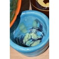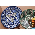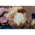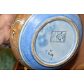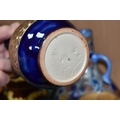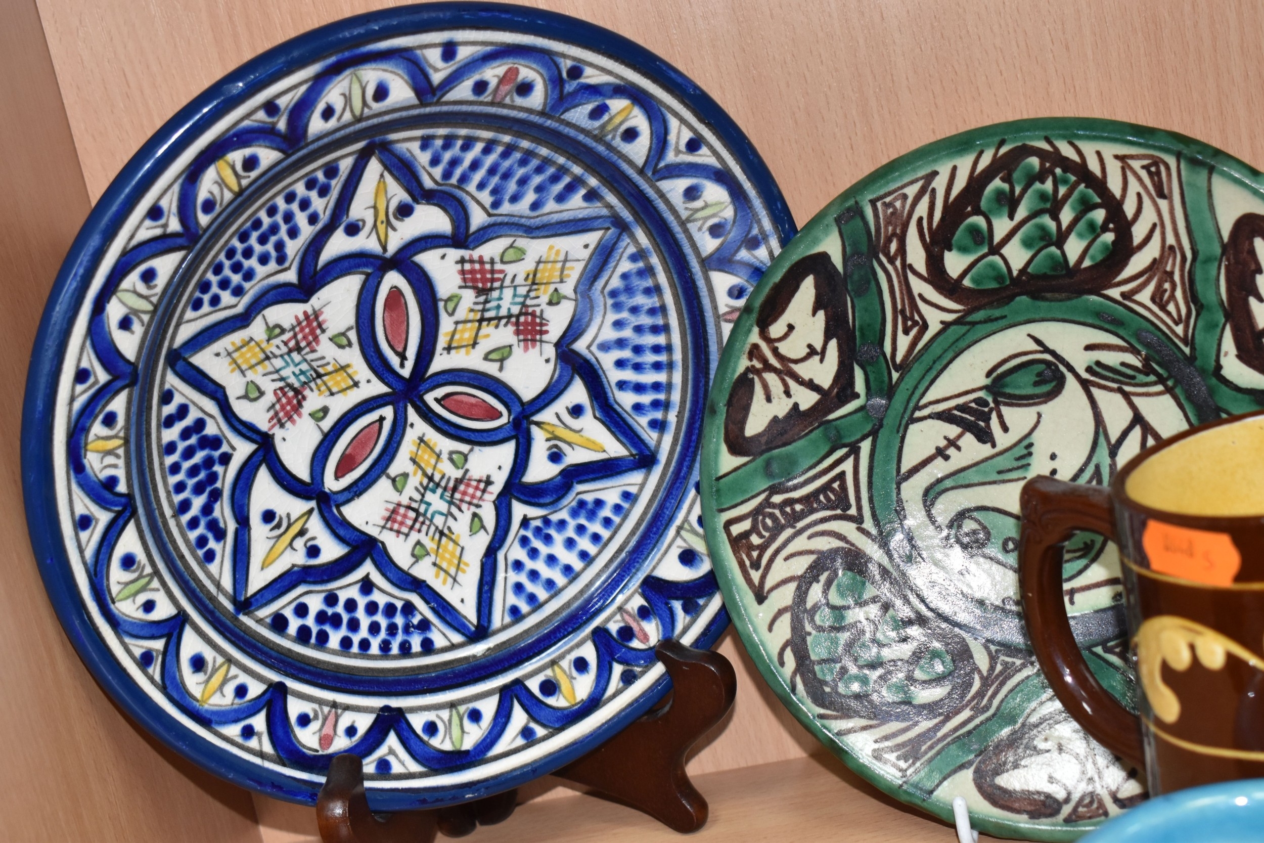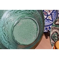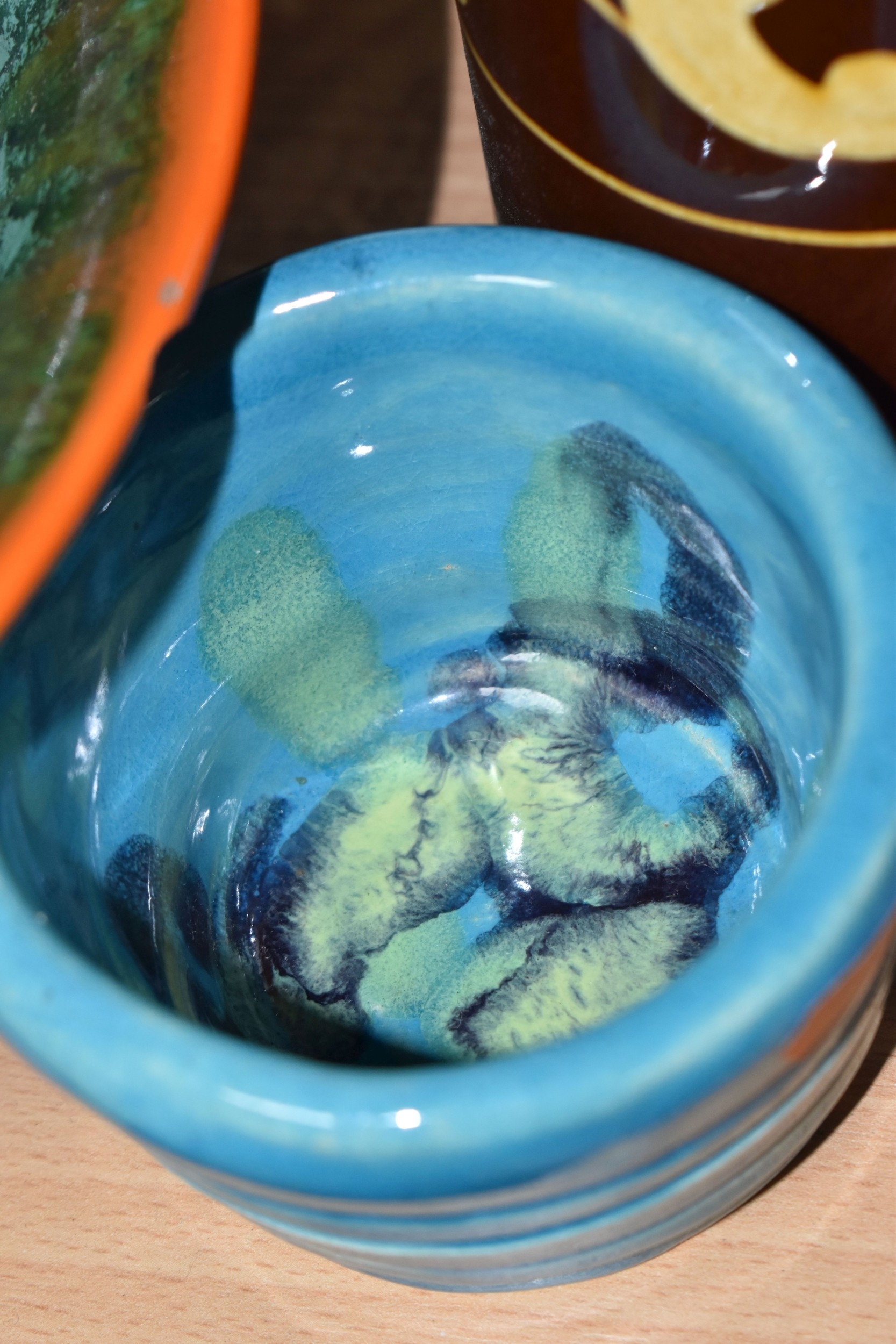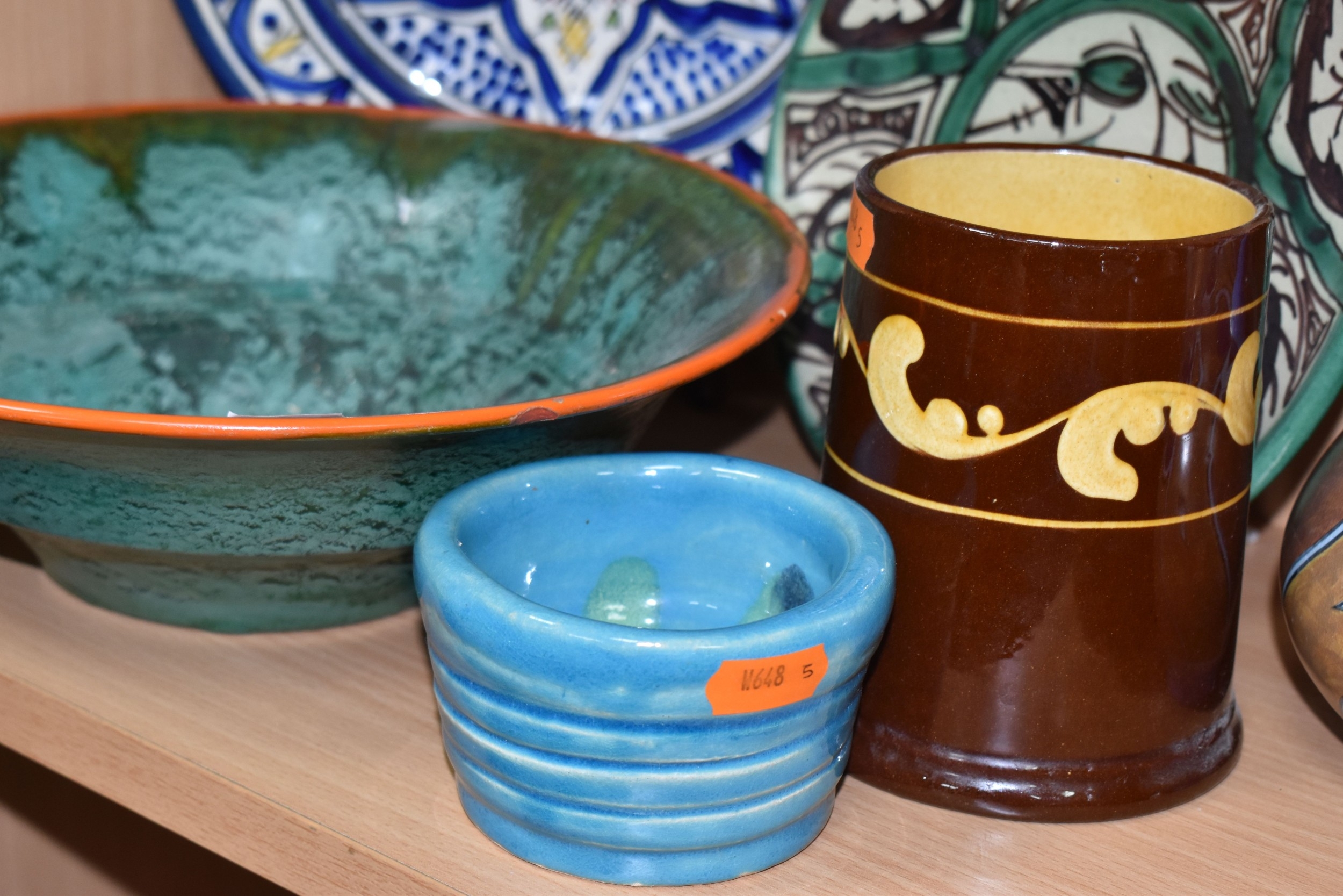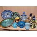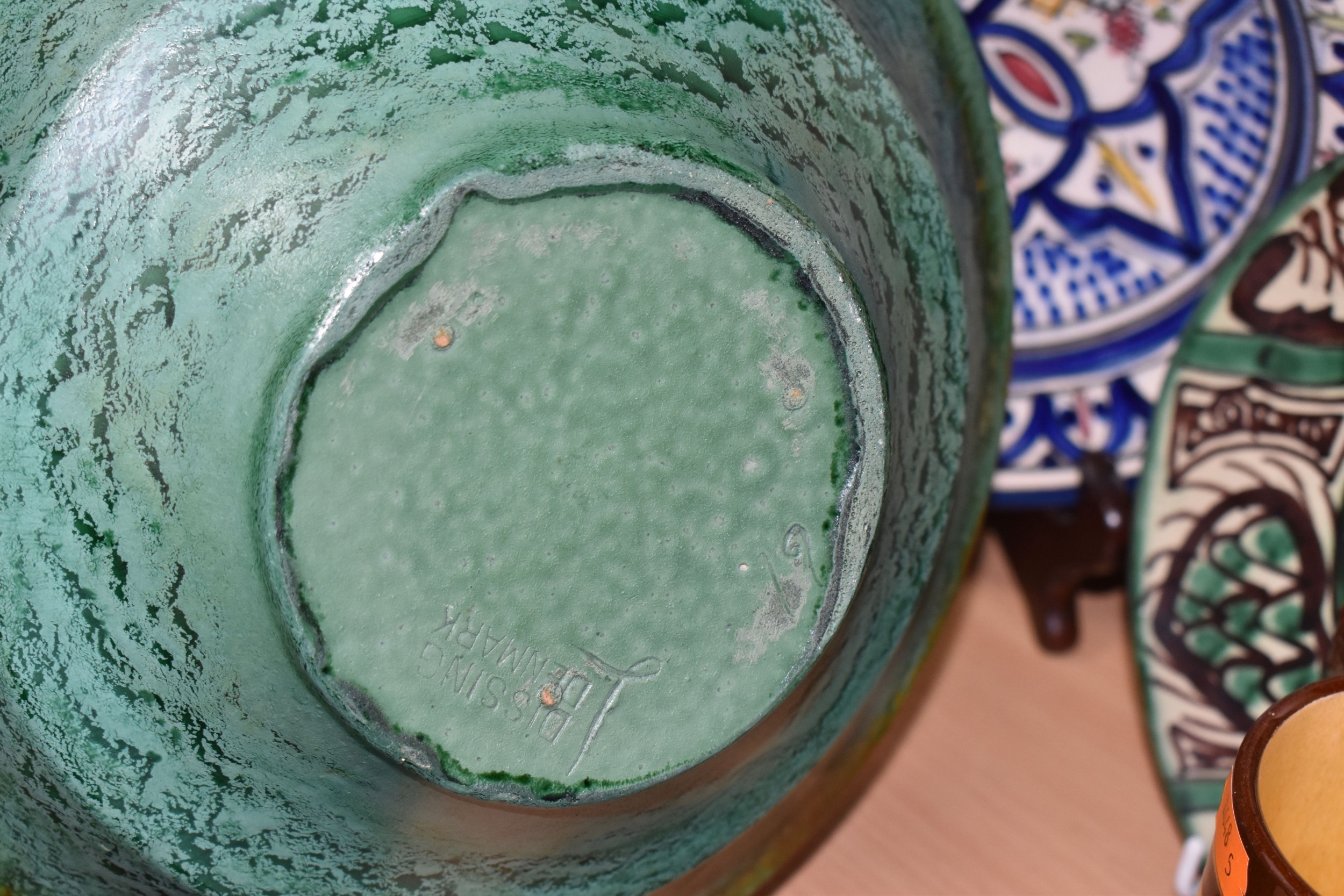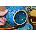A GROUP OF STUDIO ART POTTERY ITEMS, comprising, Bitossi Rimini Blue 735, candlestick, marked Italy on the base, diameter 13cm, (small chip to the rim) two Royal Doulton Slater gold swirl ewer jugs, makers marks to the base and the number 6619, height 15.5cm, a hand painted plate by Spanish artist Domingo Punter, featuring a bird motive, diameter 19.5cm, signed on the back, Dissing Danish pottery bowl in a green drip glaze with vibrant orange rim, (has had restoration and has a chip out of the edge of the rim), an art deco vase in blues and browns, by George Clewes & Co. Chameleon Ware, (some nibbles in places) and some pottery mugs etc. (qty), (Condition Report: see main description for damage, overall ok)