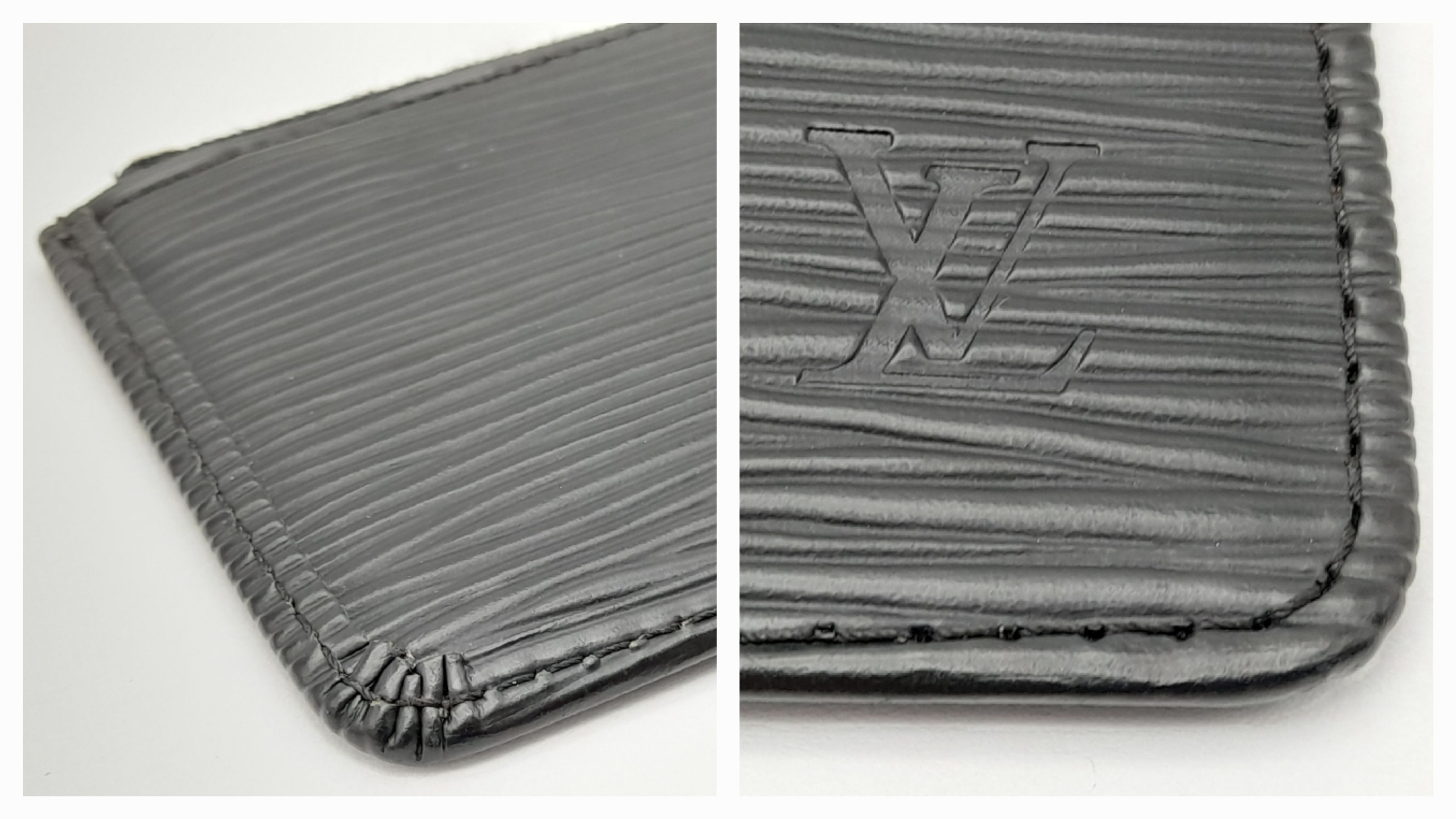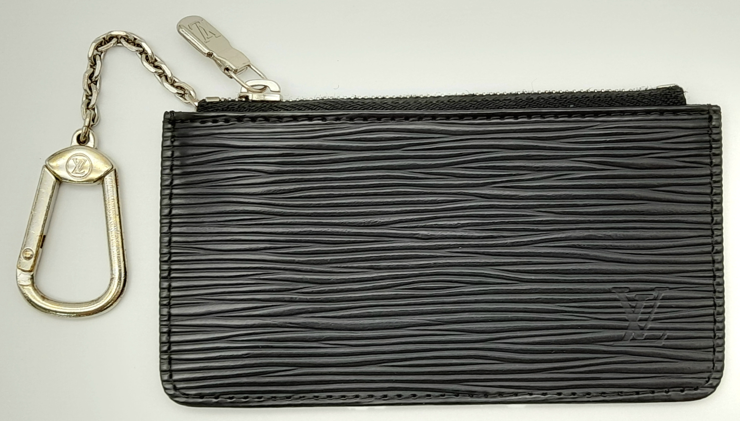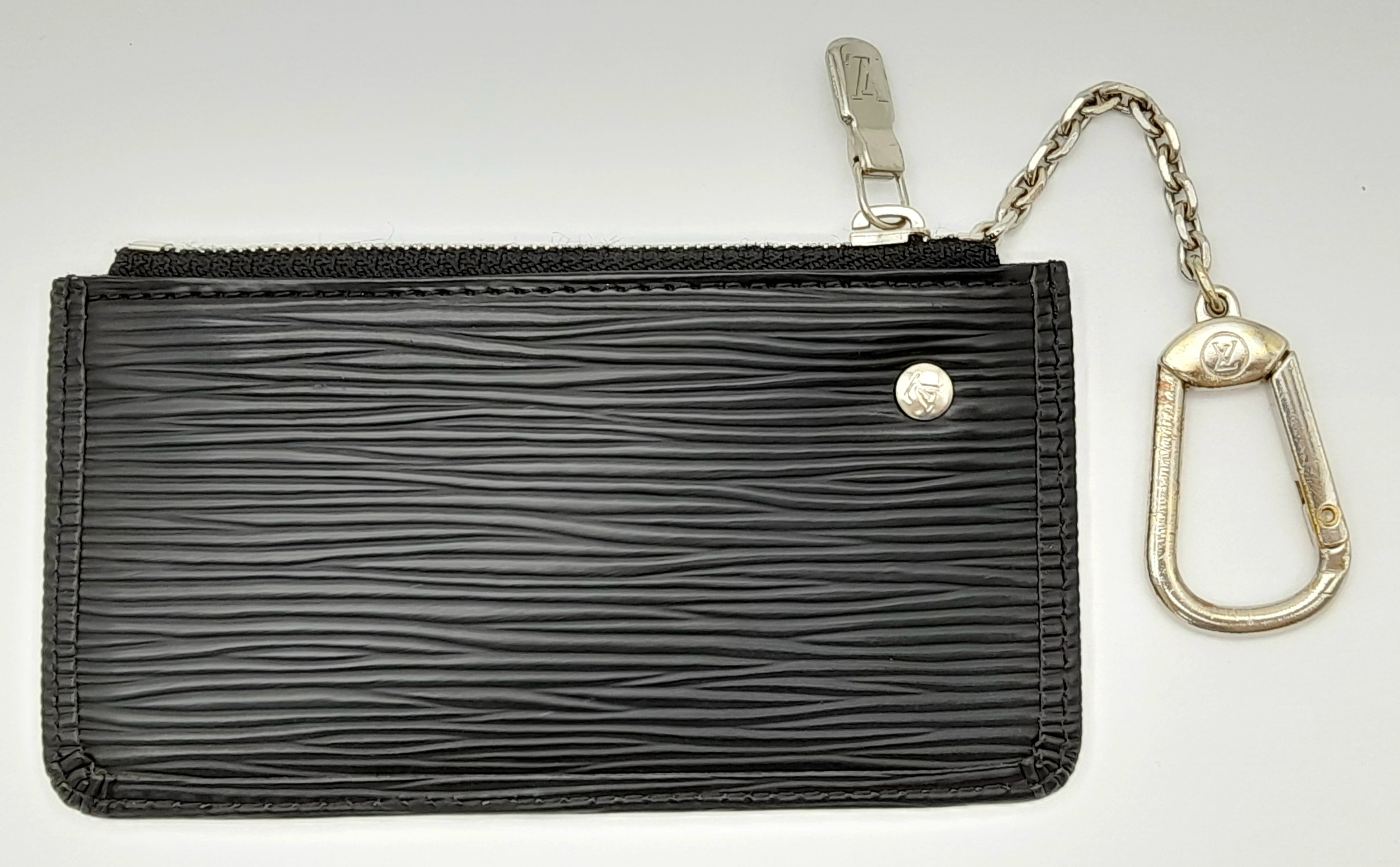 A Louis Vuitton Black Coin Purse. Epi leather exterior with silver-toned hardware, clasp on chain and zipped top closure. Black leather interior. Approximately 12.5cm length x 7cm height. In good condition but please see photos or request a condition report. Ref: 22086