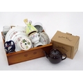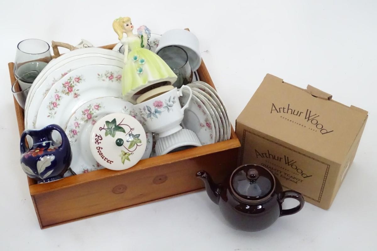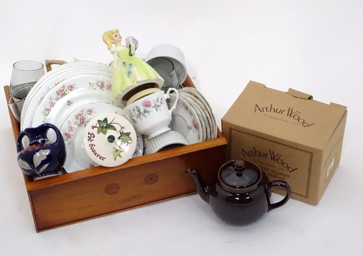 A box of miscellaneous ceramics and glassware, including a boxed Arthur Wood teapot