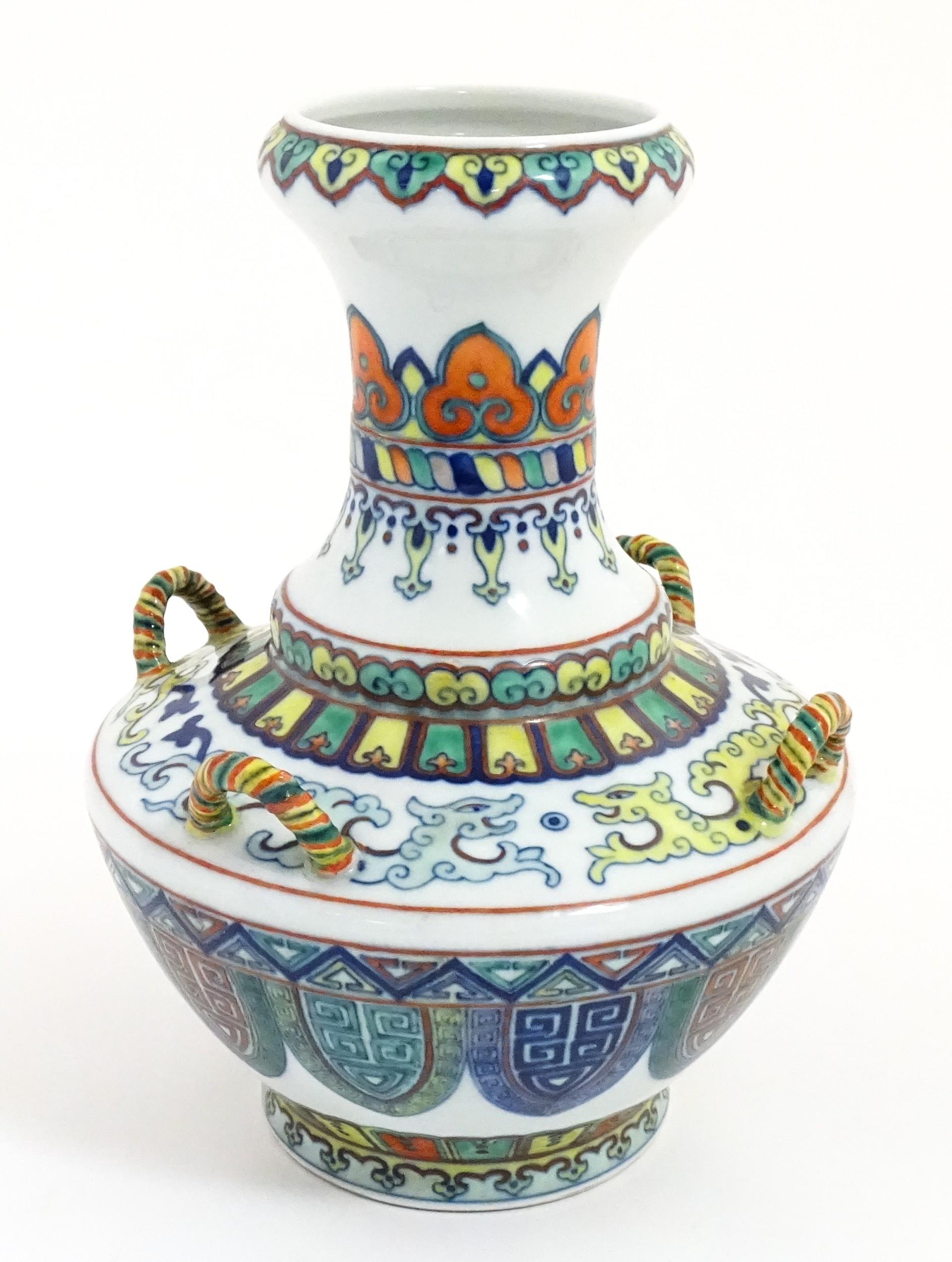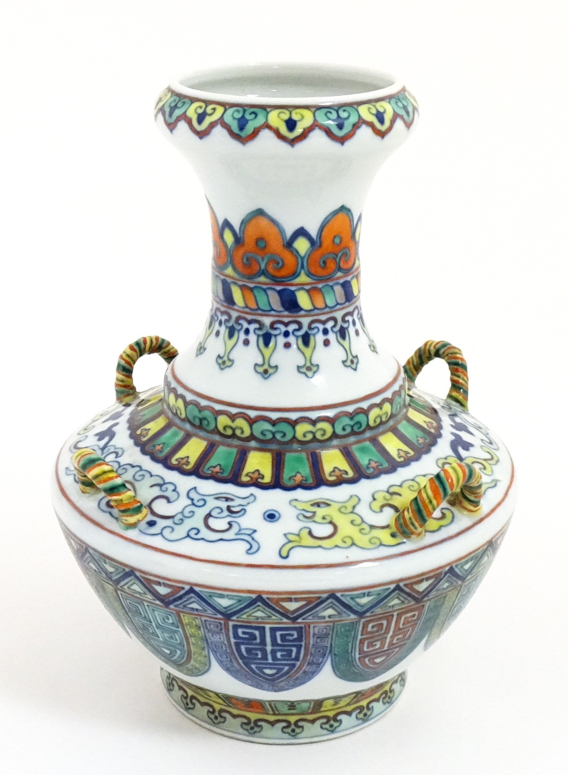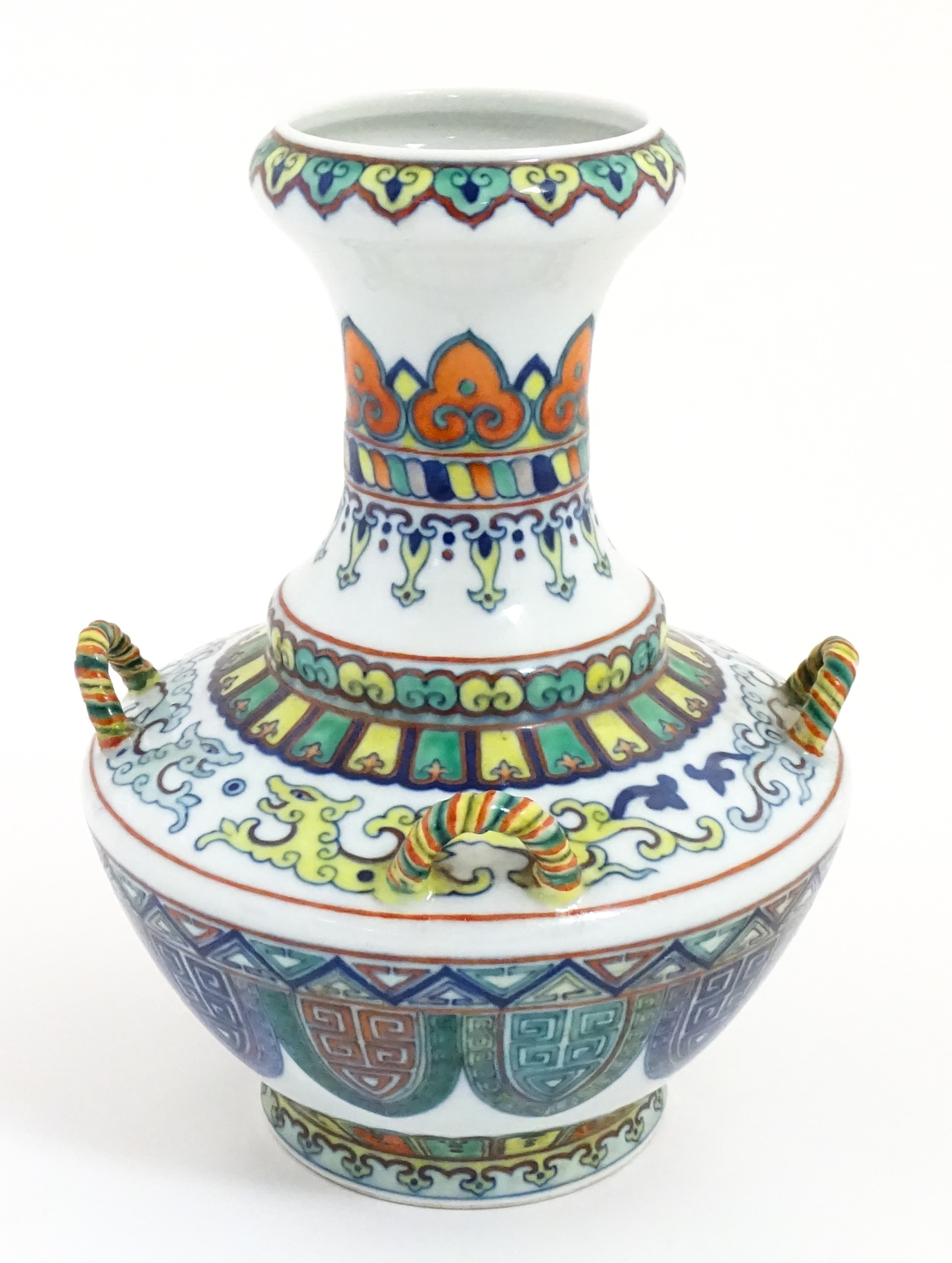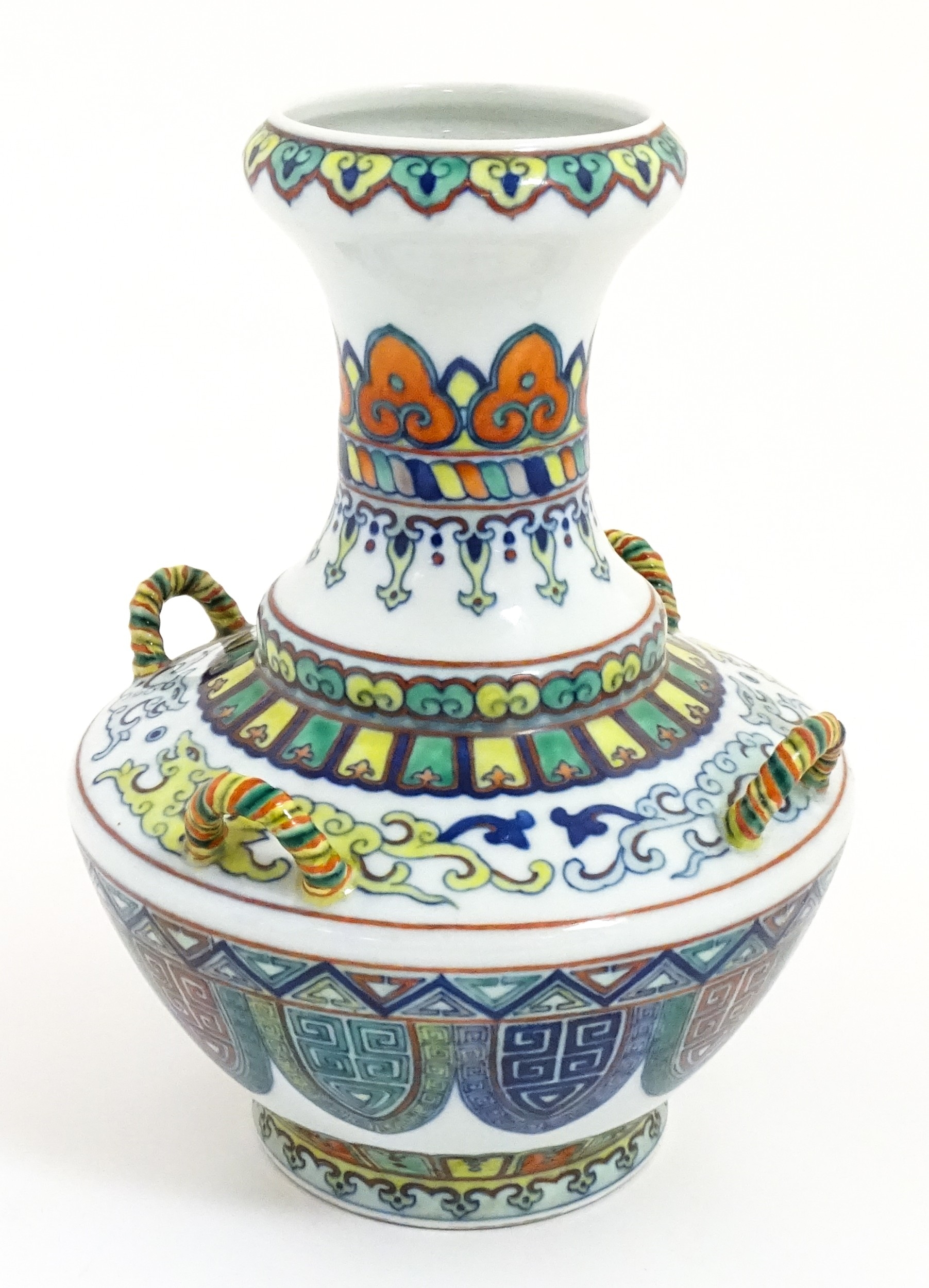 A Chinese Doucai vase with four loop handles, decorated with stylised dragons and banded borders. Character marks under. Approx. 9 3/4" high
