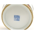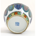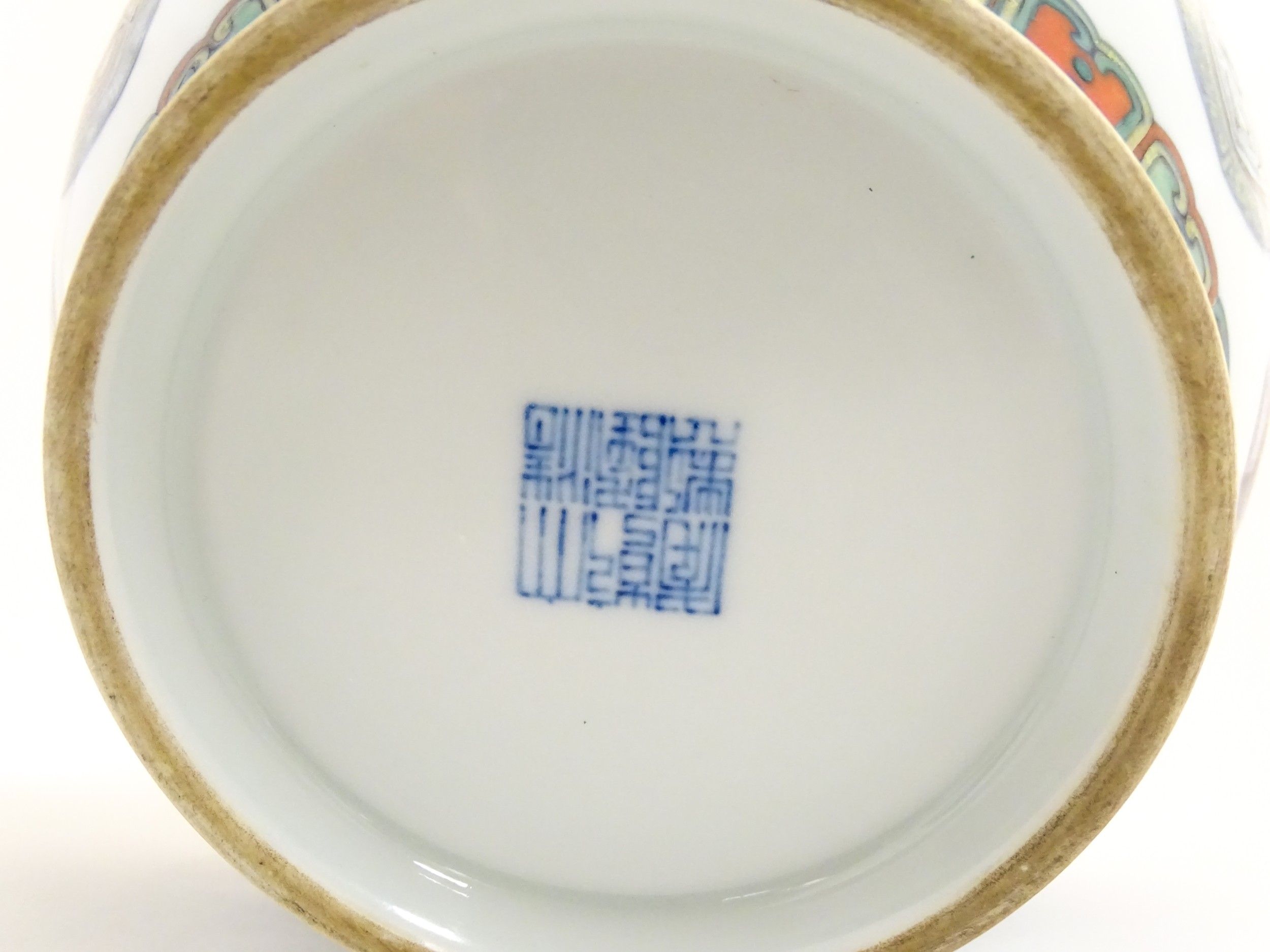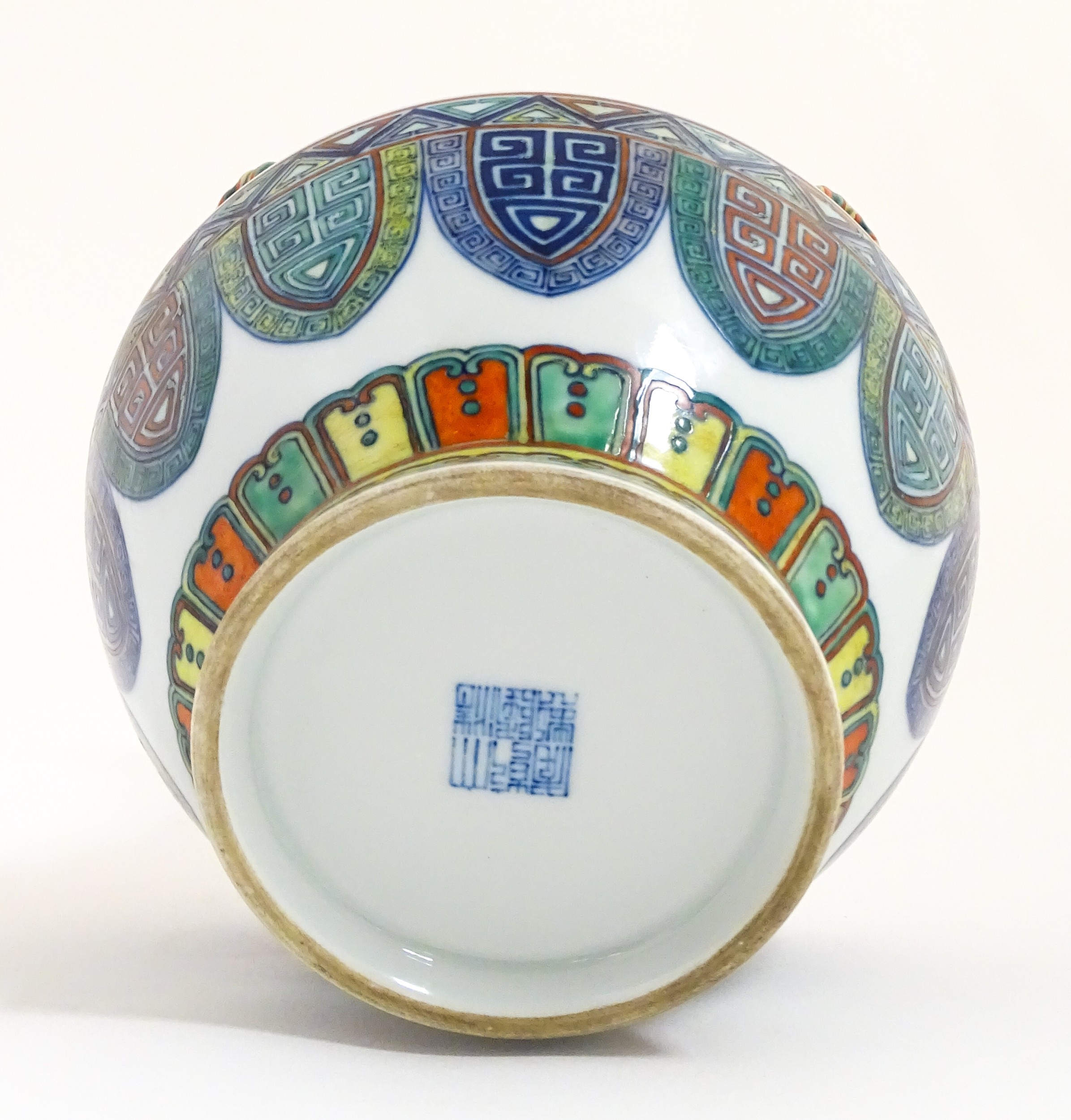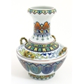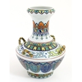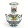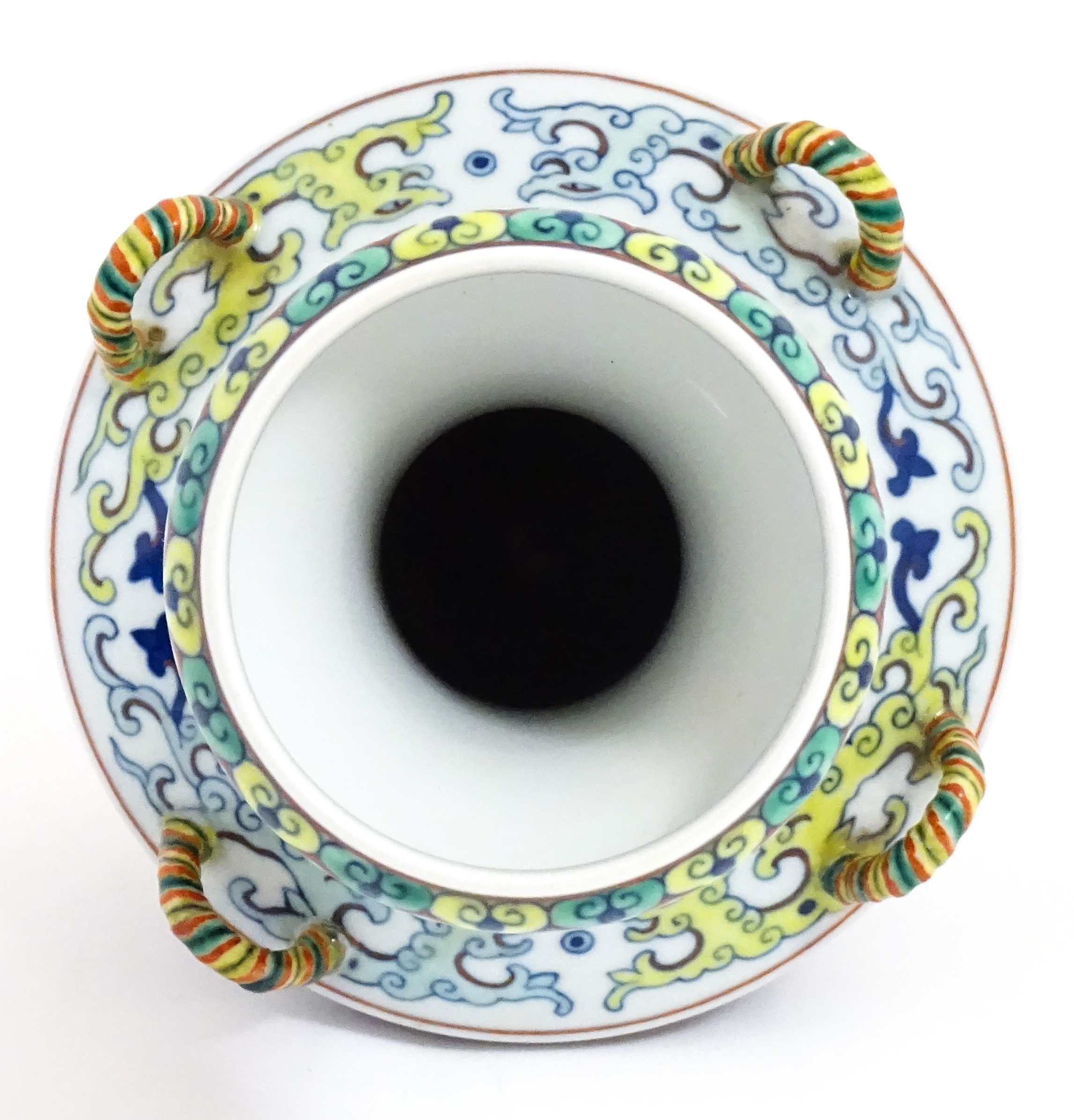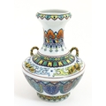 A Chinese Doucai vase with four loop handles, decorated with stylised dragons and banded borders. Character marks under. Approx. 9 3/4" high