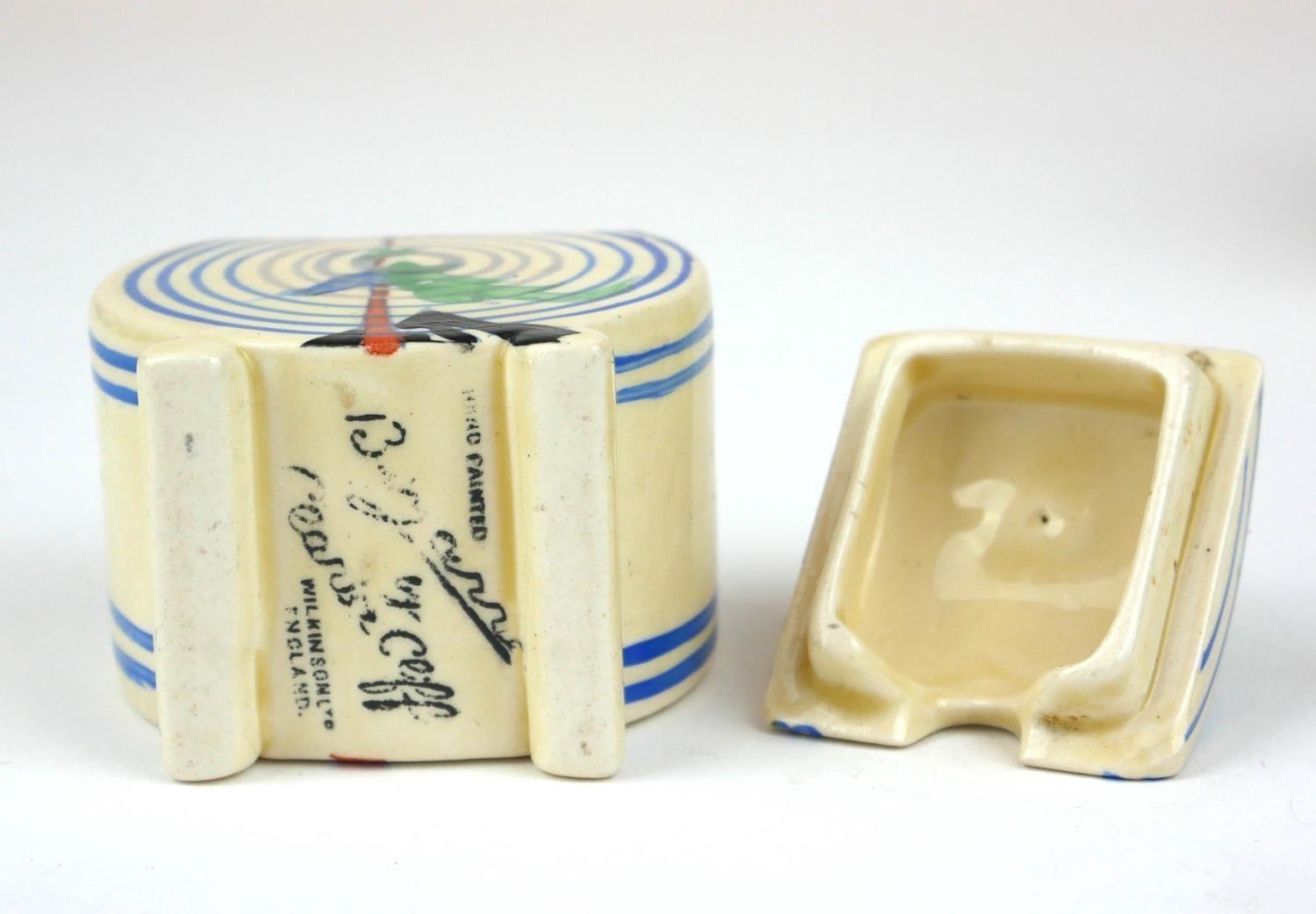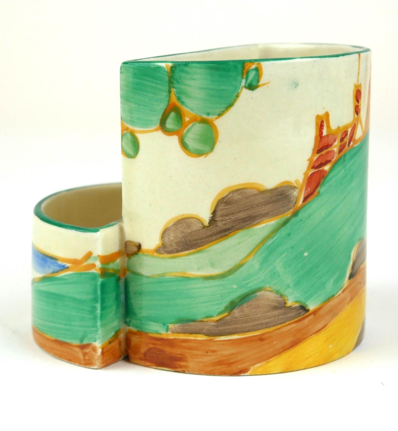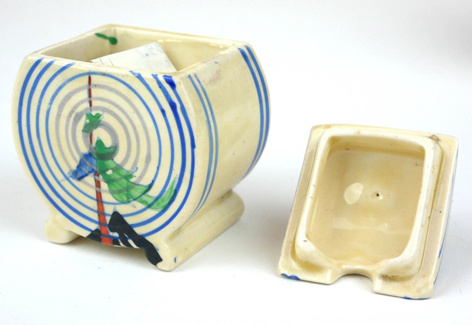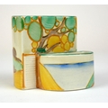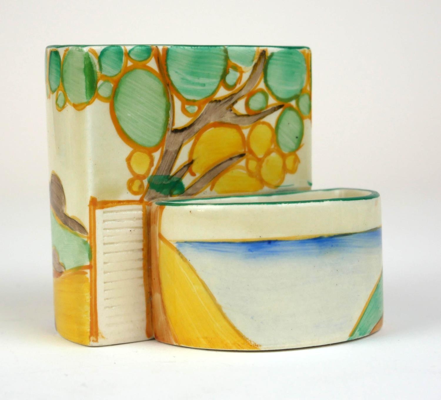 In ‘Pine Grove’ pattern, painted in colours with black and blue fir trees, Circa 1935, together with Clarice Cliff, Fantasque Bizarre Range, novelty cigarette and matchbox holder in ‘Secrets’ pattern, painted with two cottages partly hidden behind the brow of a hill beside an estuary.