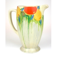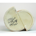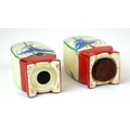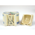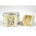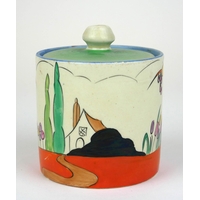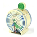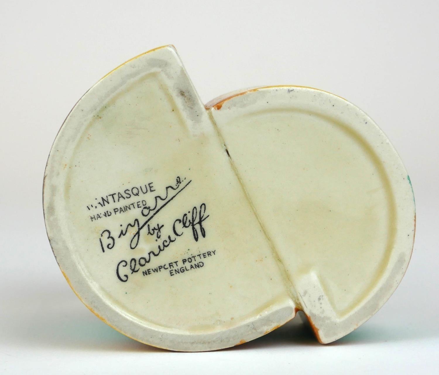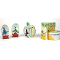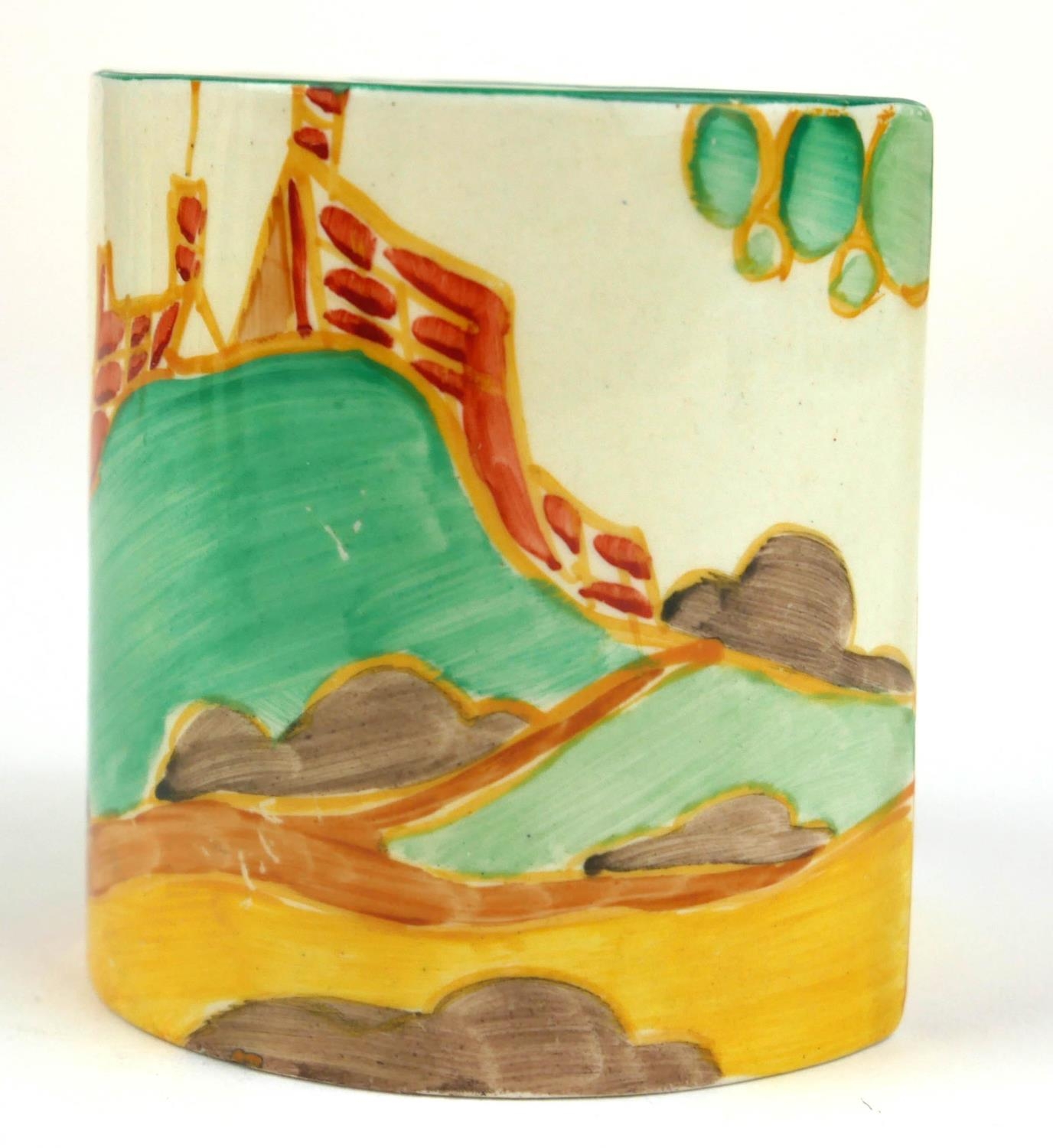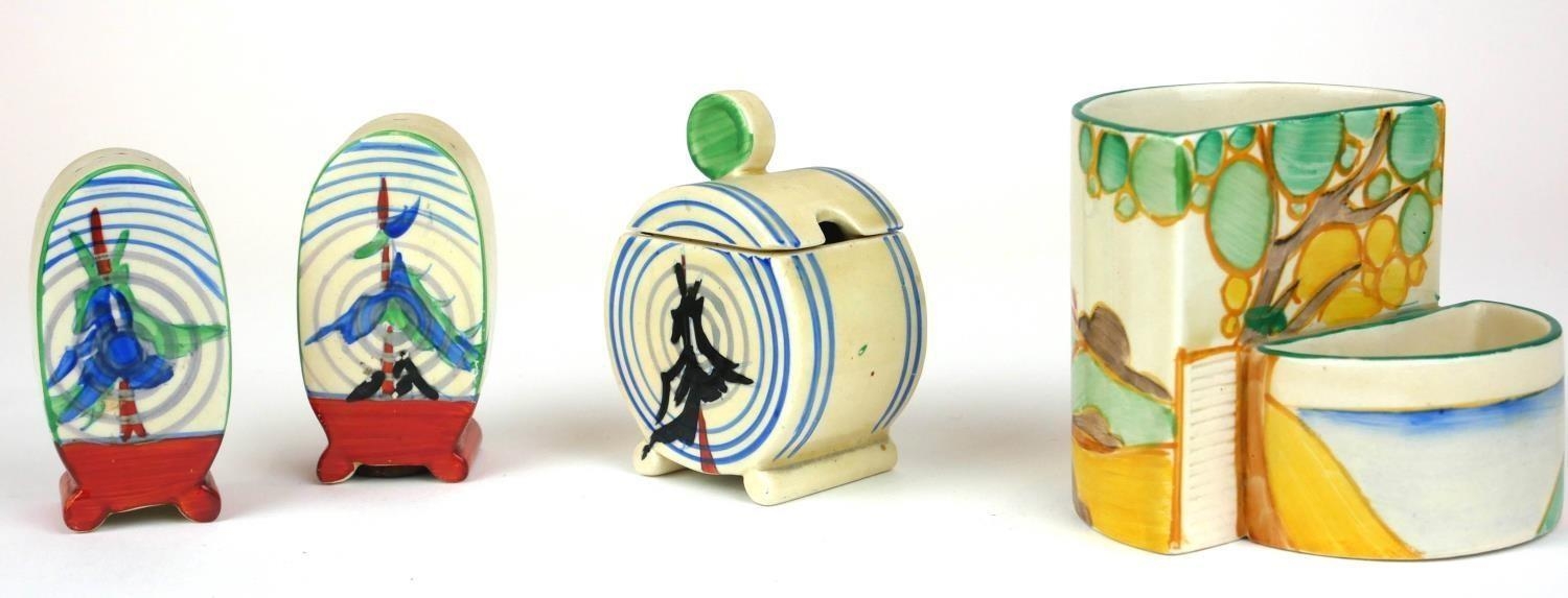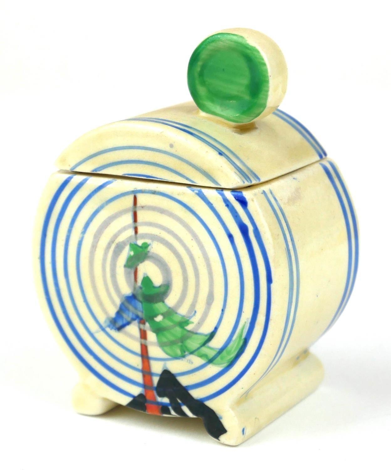 In ‘Pine Grove’ pattern, painted in colours with black and blue fir trees, Circa 1935, together with Clarice Cliff, Fantasque Bizarre Range, novelty cigarette and matchbox holder in ‘Secrets’ pattern, painted with two cottages partly hidden behind the brow of a hill beside an estuary.
