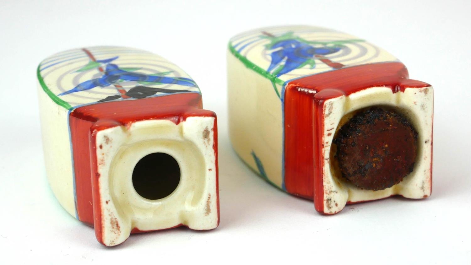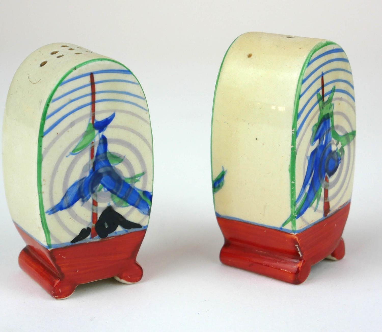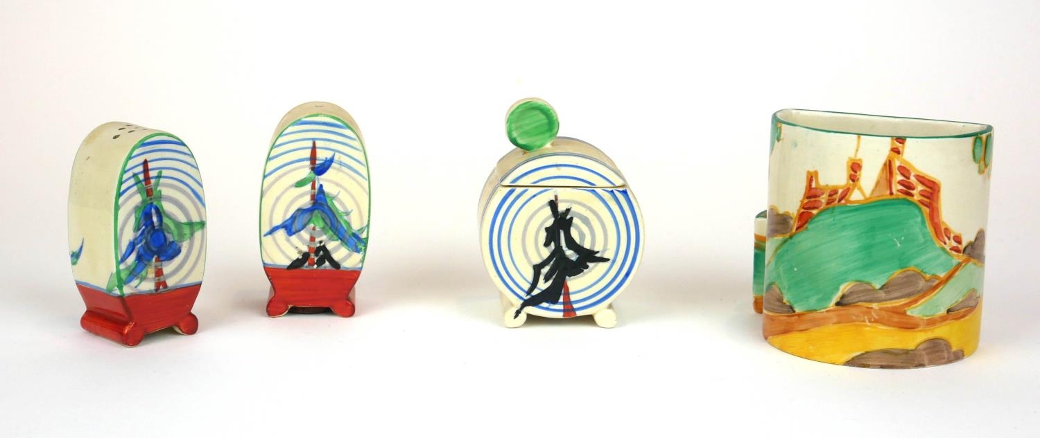 CLARICE CLIFF, BIZARRE RANGE, AN UNUSUAL ART DECO COMPLETE THREE PIECE BONJOUR CRUET SET
