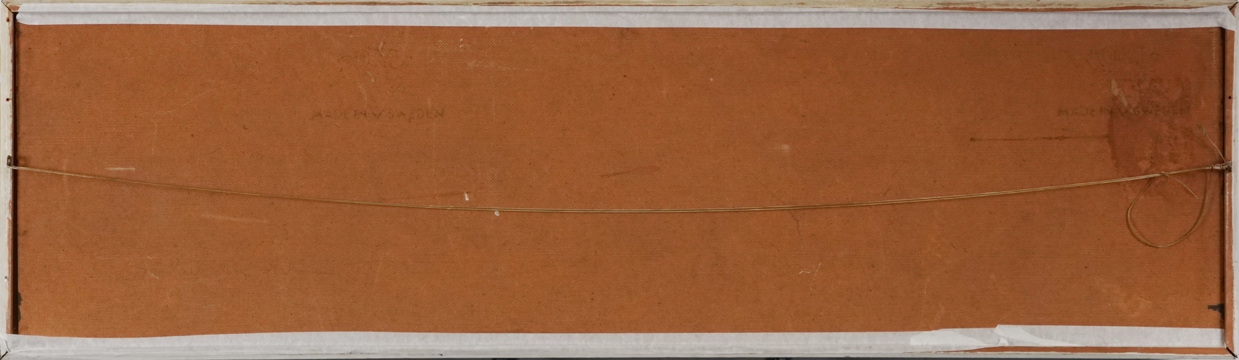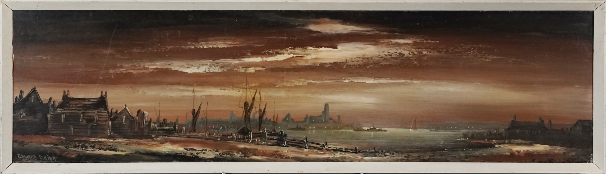 Edward Elliot - Panoramic harbour view, 20th century oil on board, within a white frame, 32cm x 121cm.