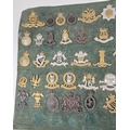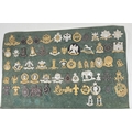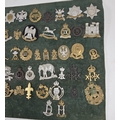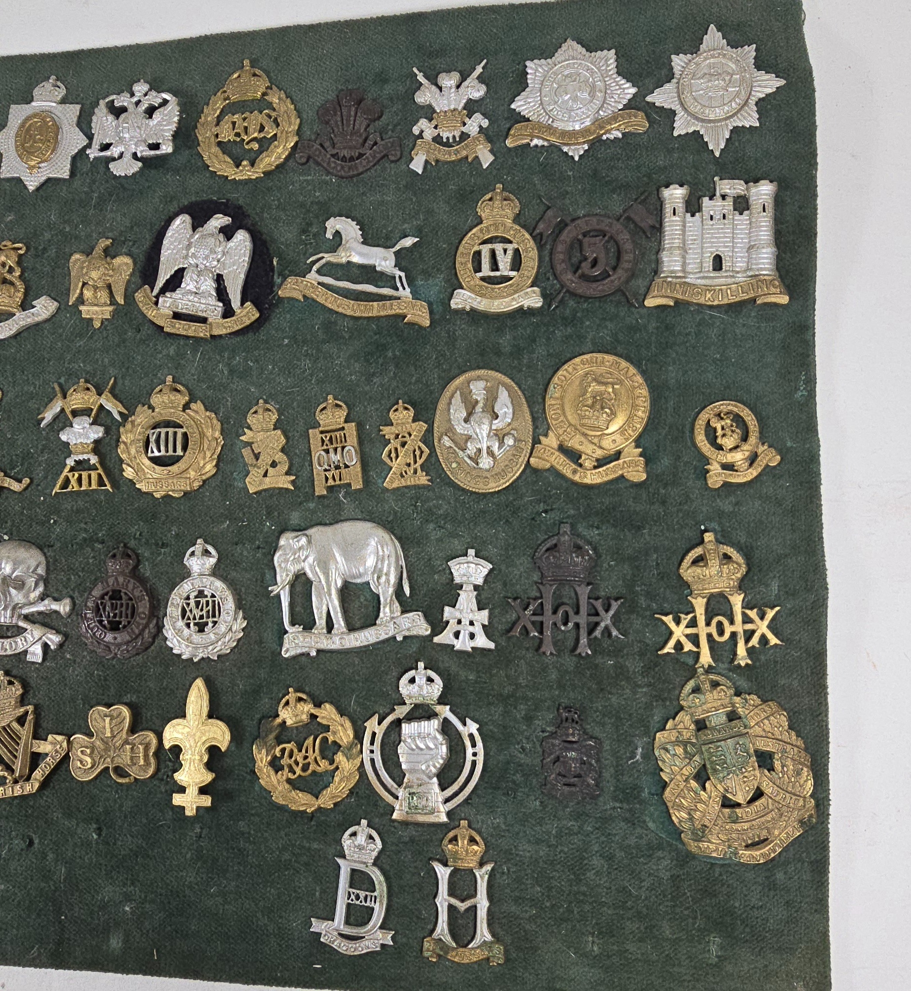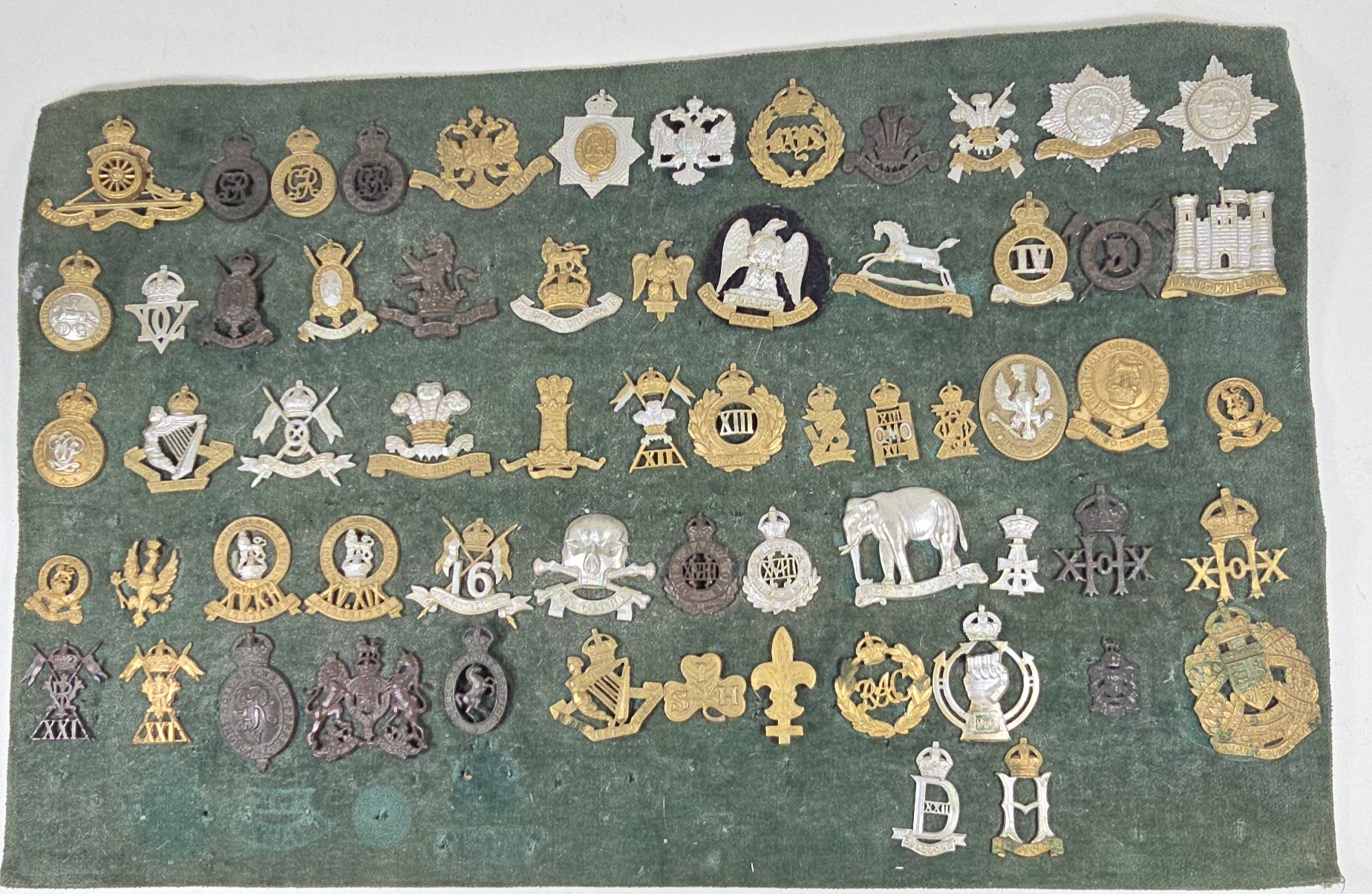 50 Cavalry cap badges, being a representative example of all the Cavalry Regiments up to the 21st Lancers plus 22nd Dragoons and 23rd Hussars, including some variations, and 7 officers bronze with blades, no Victorian; also 10 other cap badges including WWI Household Battalion and bronze Army Remount Service. Average GC mounted on a felt covered board, probably includes restrikes but not removed for examination. A speculative lot.