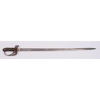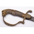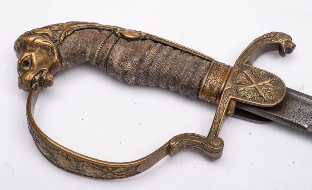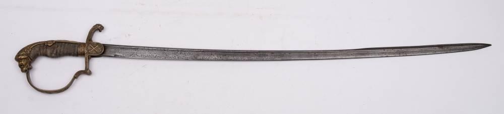 An Imperial German, officers sword: with 77cm etched blade, brass knuckle guard, with fishskin and wire bound grip, having a lions head pommel.
