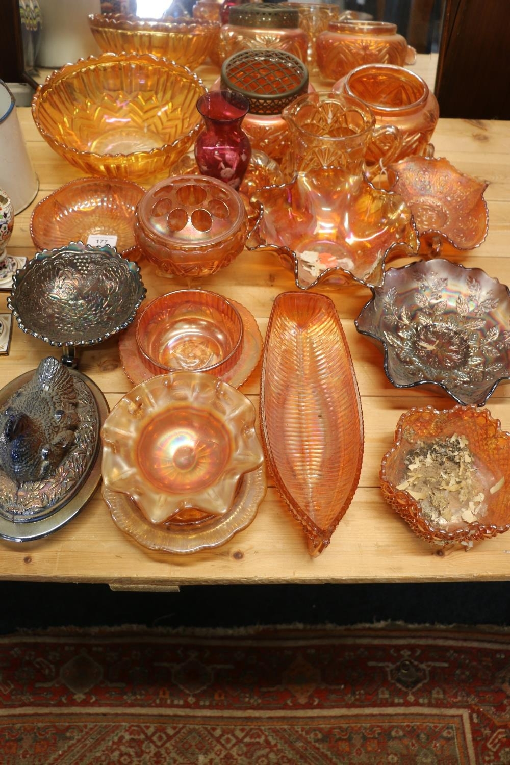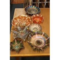 Carnival Glass to include bowls, a chicken butter dish, etc.