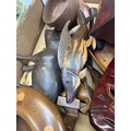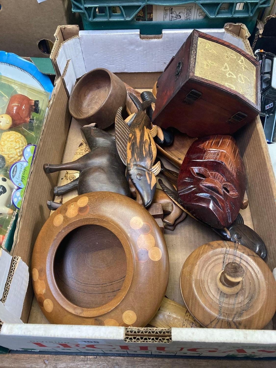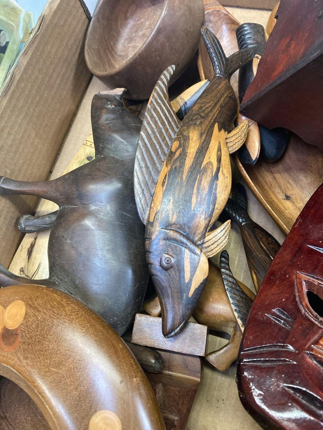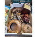 CARTON OF HAND CRAFT TREEN ITEMS, BOWLS, MASK, BOOMERANGS ETC