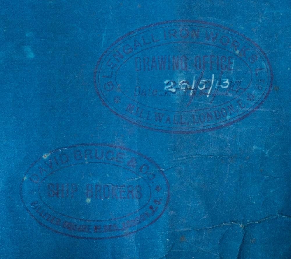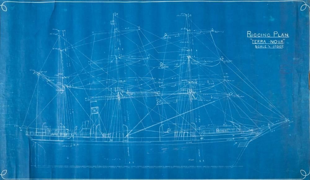 A blue print for the 'Rigging Arrangement 'Terra Nova',: Scale 1/8=1 Foot', with stamp for David Bruce & Co Ship Brokers and another for 'Glengall Iron Works Ltd, Millwall, London' dated 23/5/3 and overwritten in ink 24/2/14, 48cm. x 80cm.