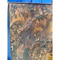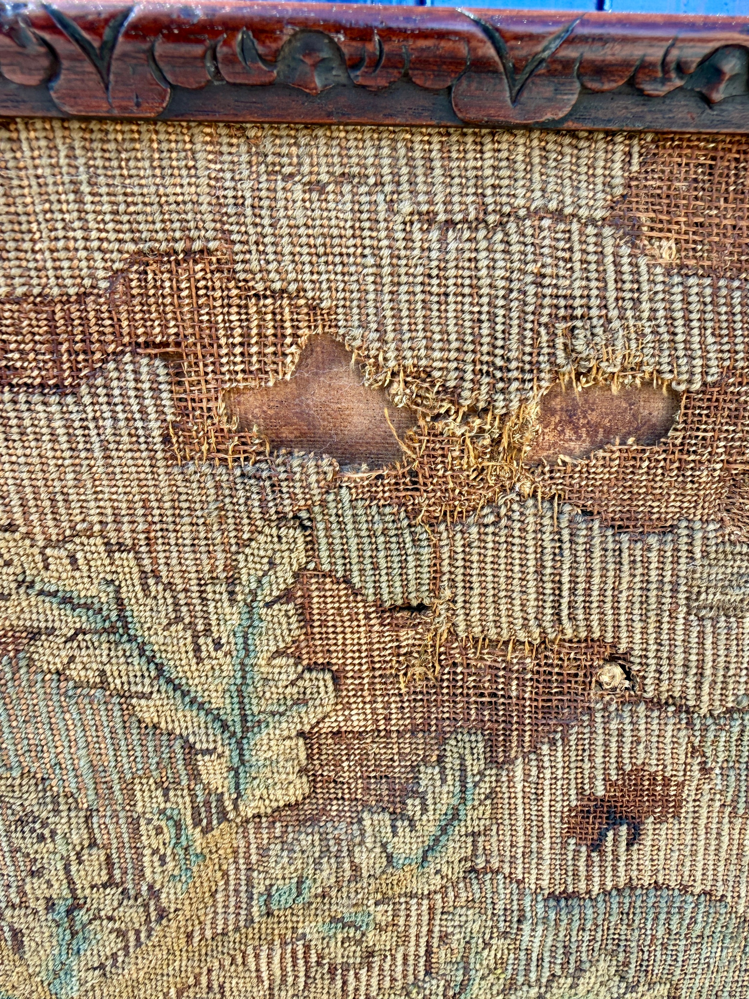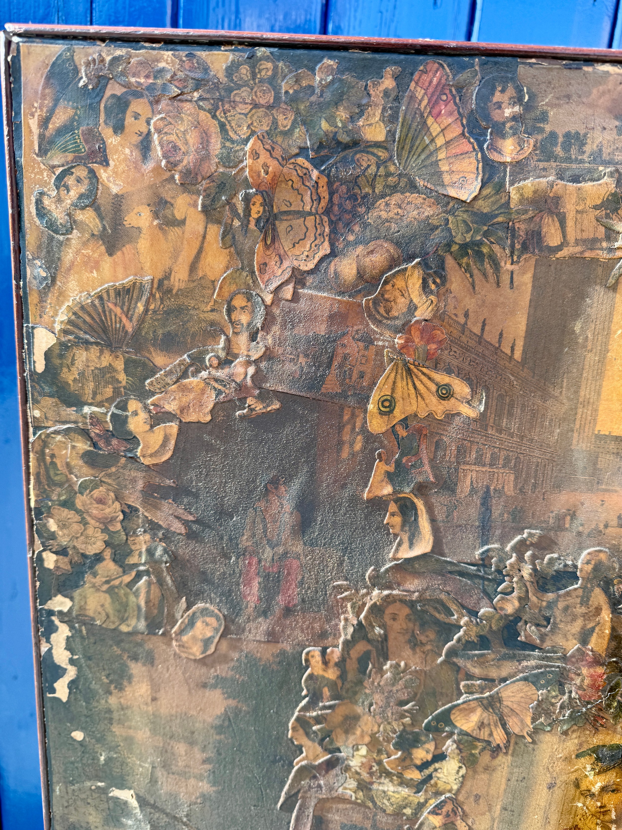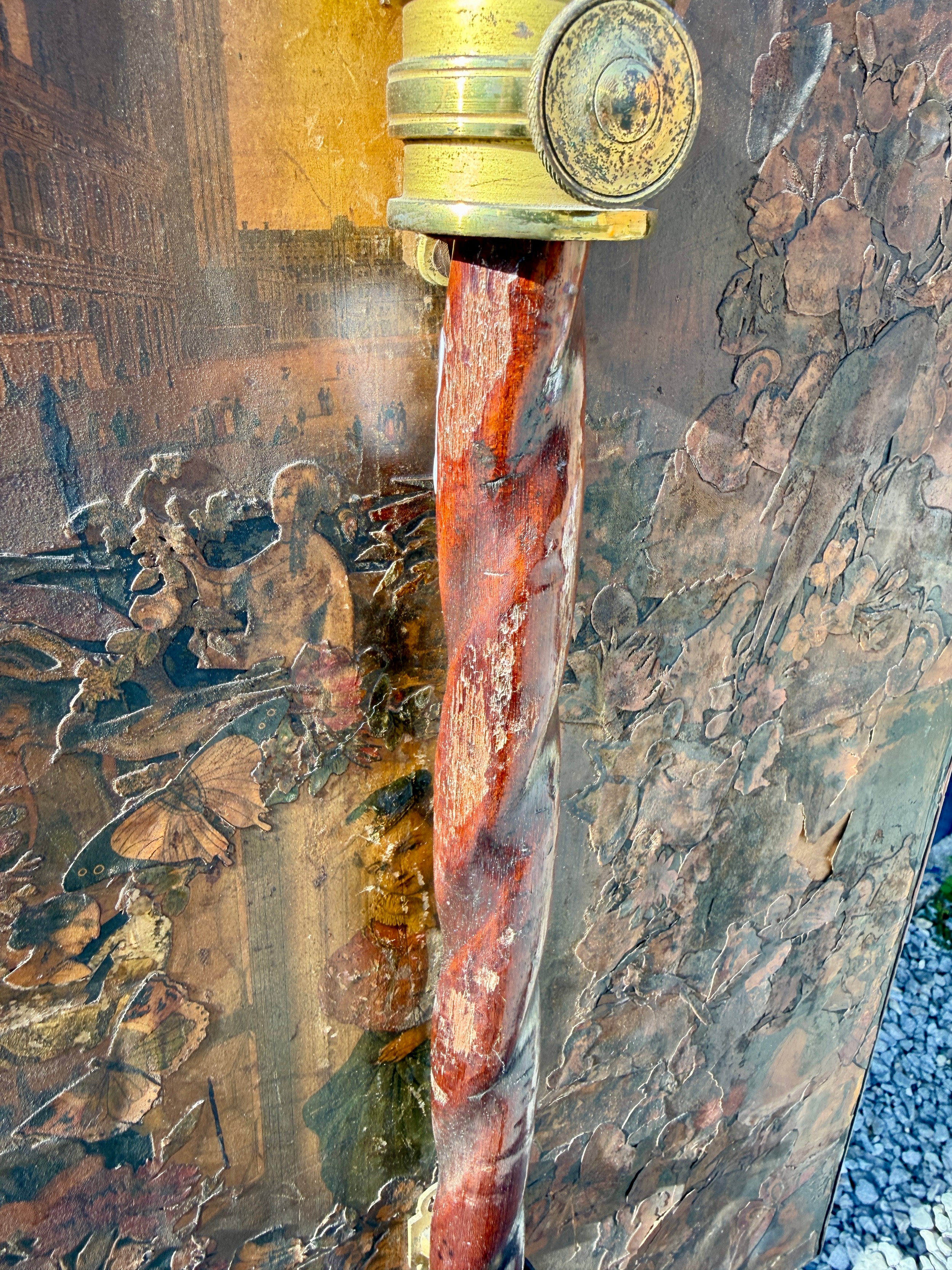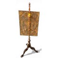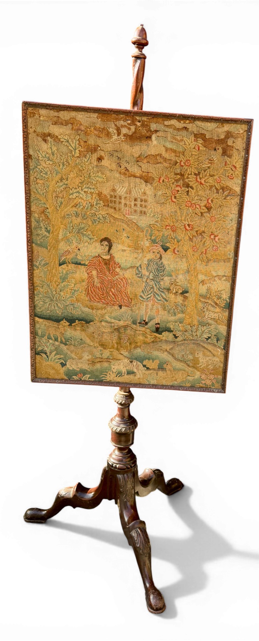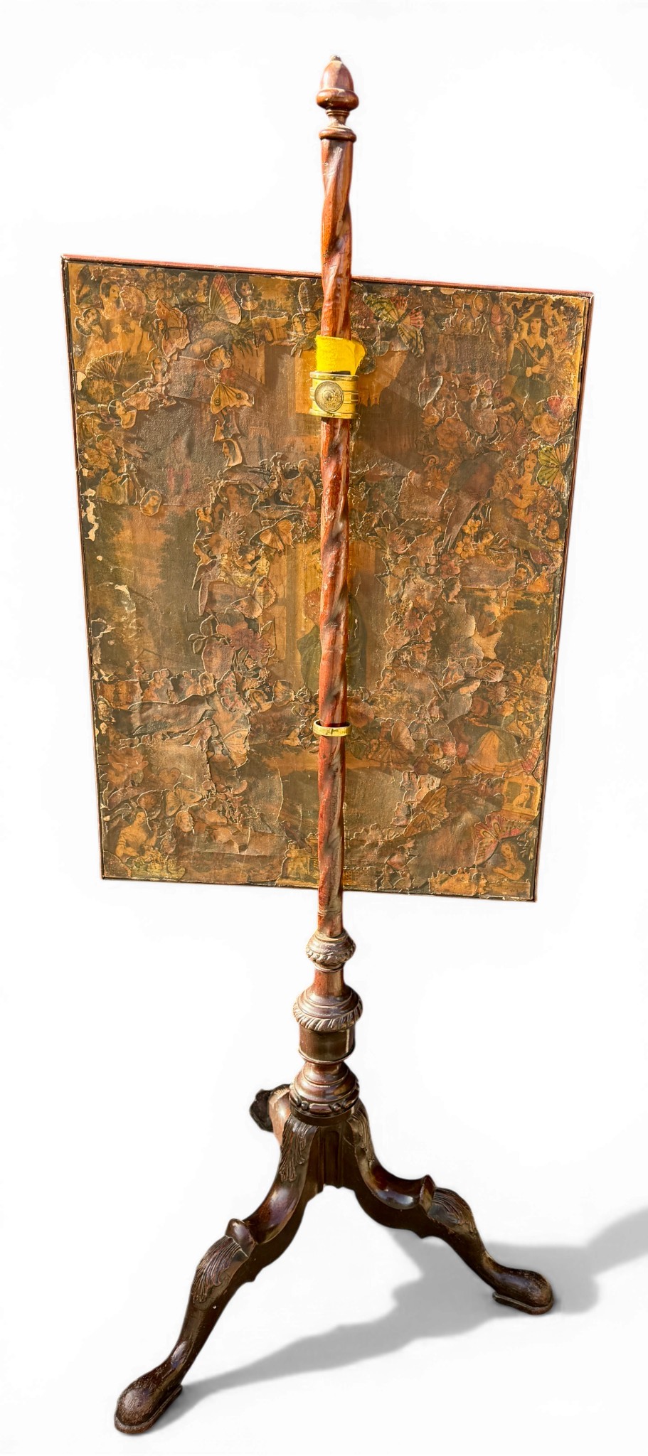 A 19thC mahogany adjustable pole screen with needlework decoration to one side and decoupage to the reverse. 145cm h. Screen 71cm x 54cm.