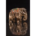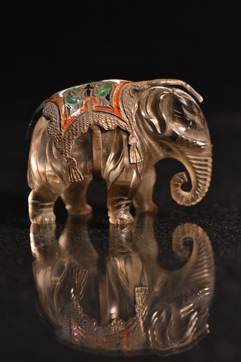 A carved rock crystal enamel and metal elephant, carved standing with ornate cast and enamelled base metal floral ceremonial saddle cloth, with white, emerald green and red motif, unmarked, 36mm long, 27mm high