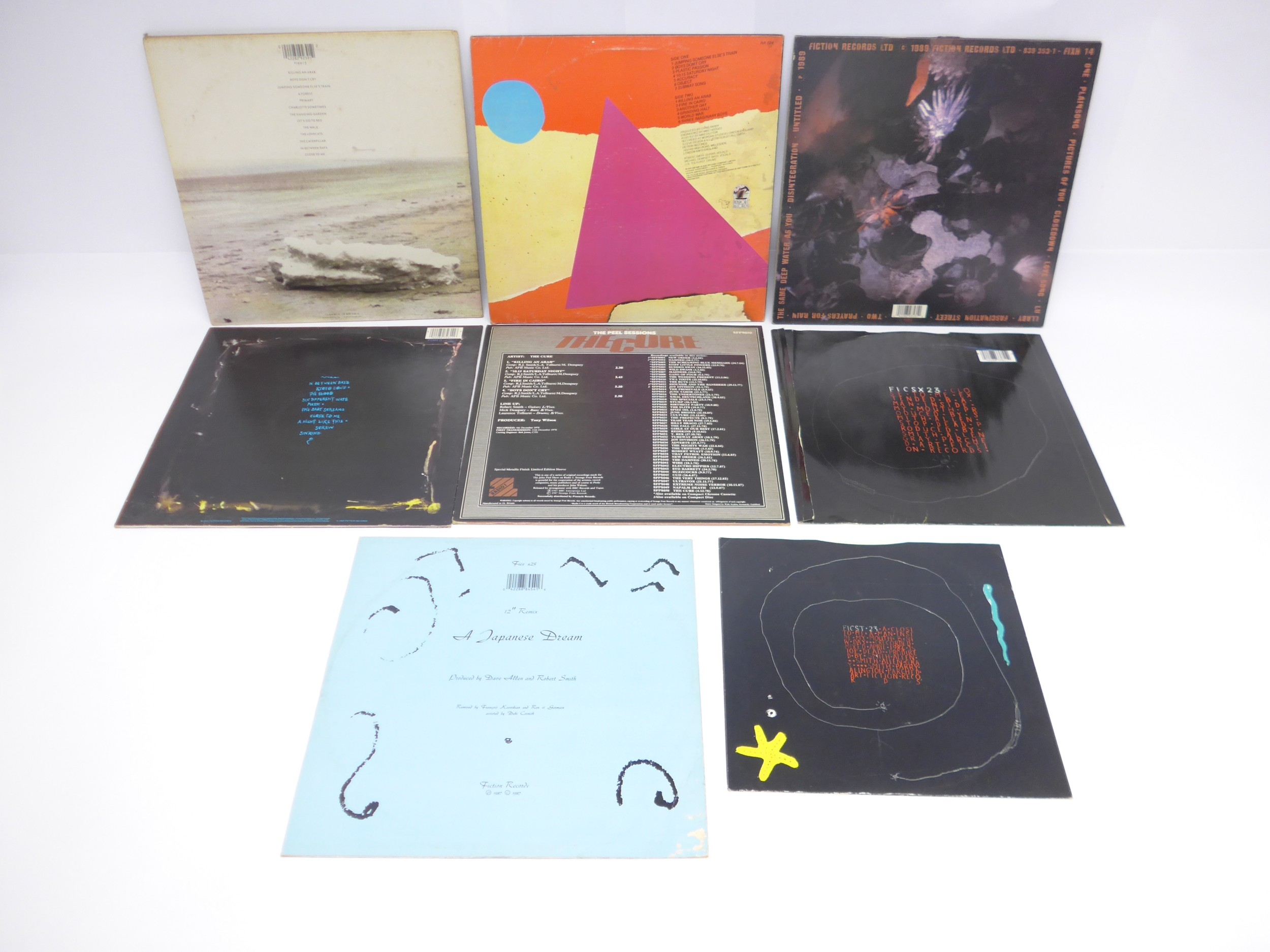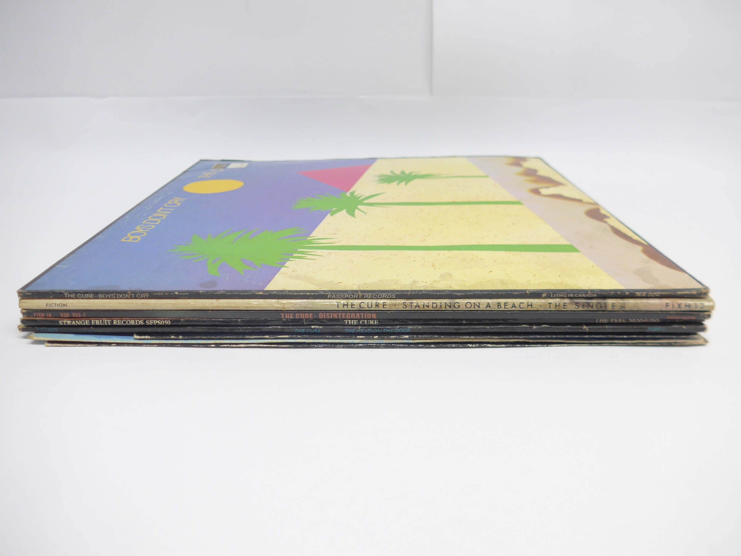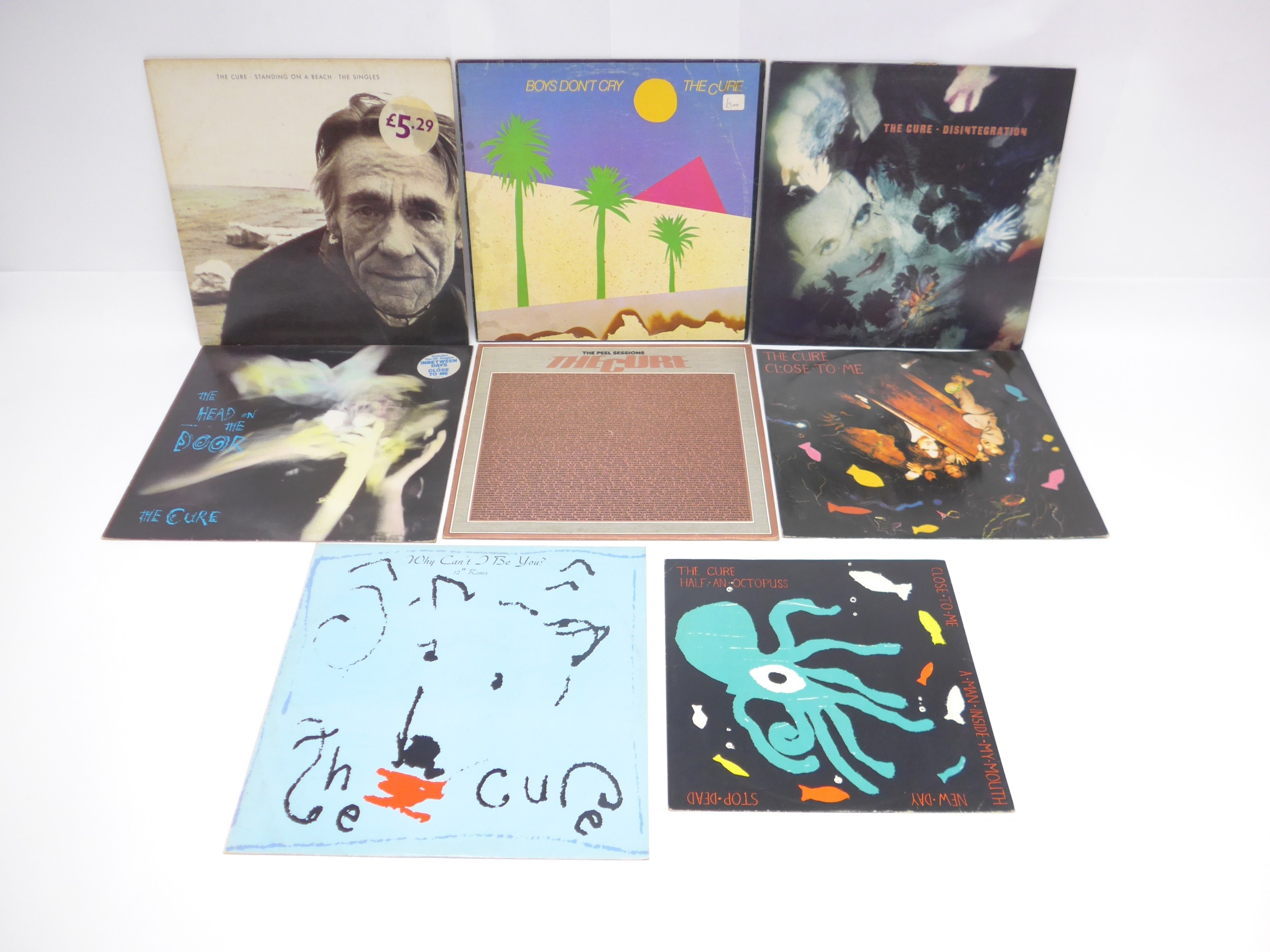 THE CURE: A group of five LPs and three singles to include 'Boys Don't Cry' Canadian pressing (North American Records NA-024), 'The Head On The Door' with printed inner (Fiction FIXH 11), 'Disintegration' with printed inner (Fiction FIXH 14), 'Standing On A Beach - The Singles' with printed inner (Fiction FIXH 12), 'The Peel Sessions' in textured sleeve (Strange Fruit SFPS050), 'Close To Me' 12" single (Fiction FICSX 23), 'Why Can't I Be You? (12" Remix)' 12" single (Fiction FICS X25) and 'Half An Octopuss' 10" single (Fiction FICST23) (8, vinyl generally G+-VG, sleeves generally VG-VG+)