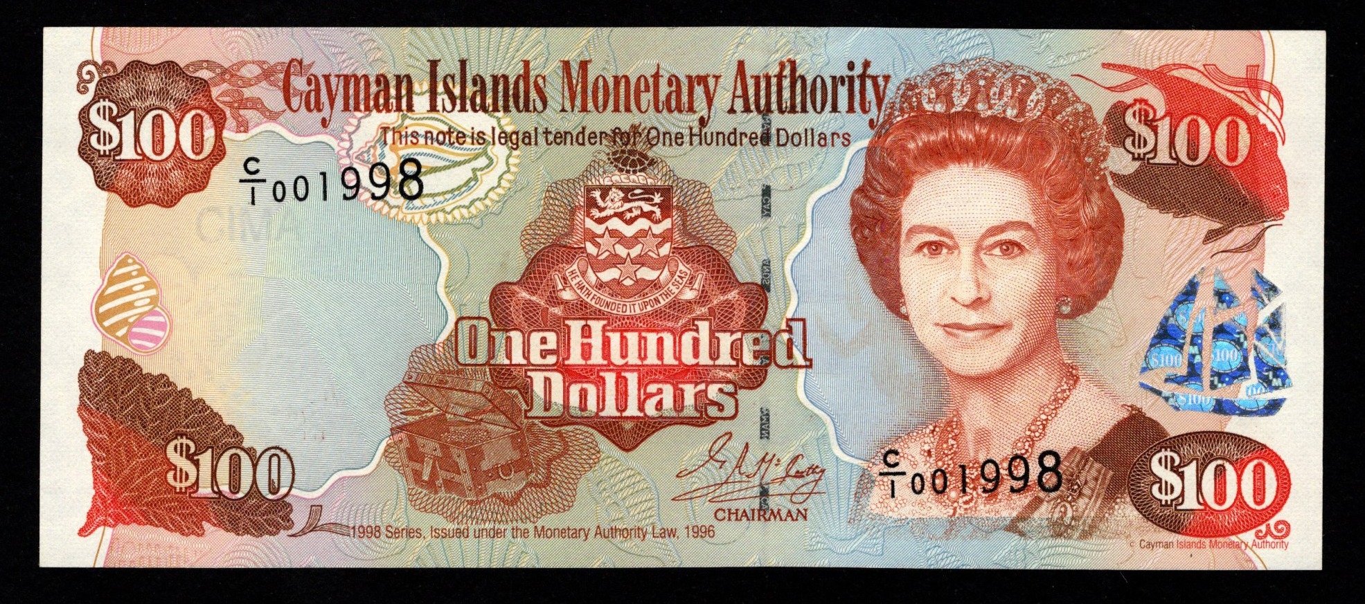 Cayman Islands 100 Dollars dated 1998, serial C/1 001998 (BNB B205a, Pick25) Uncirculated