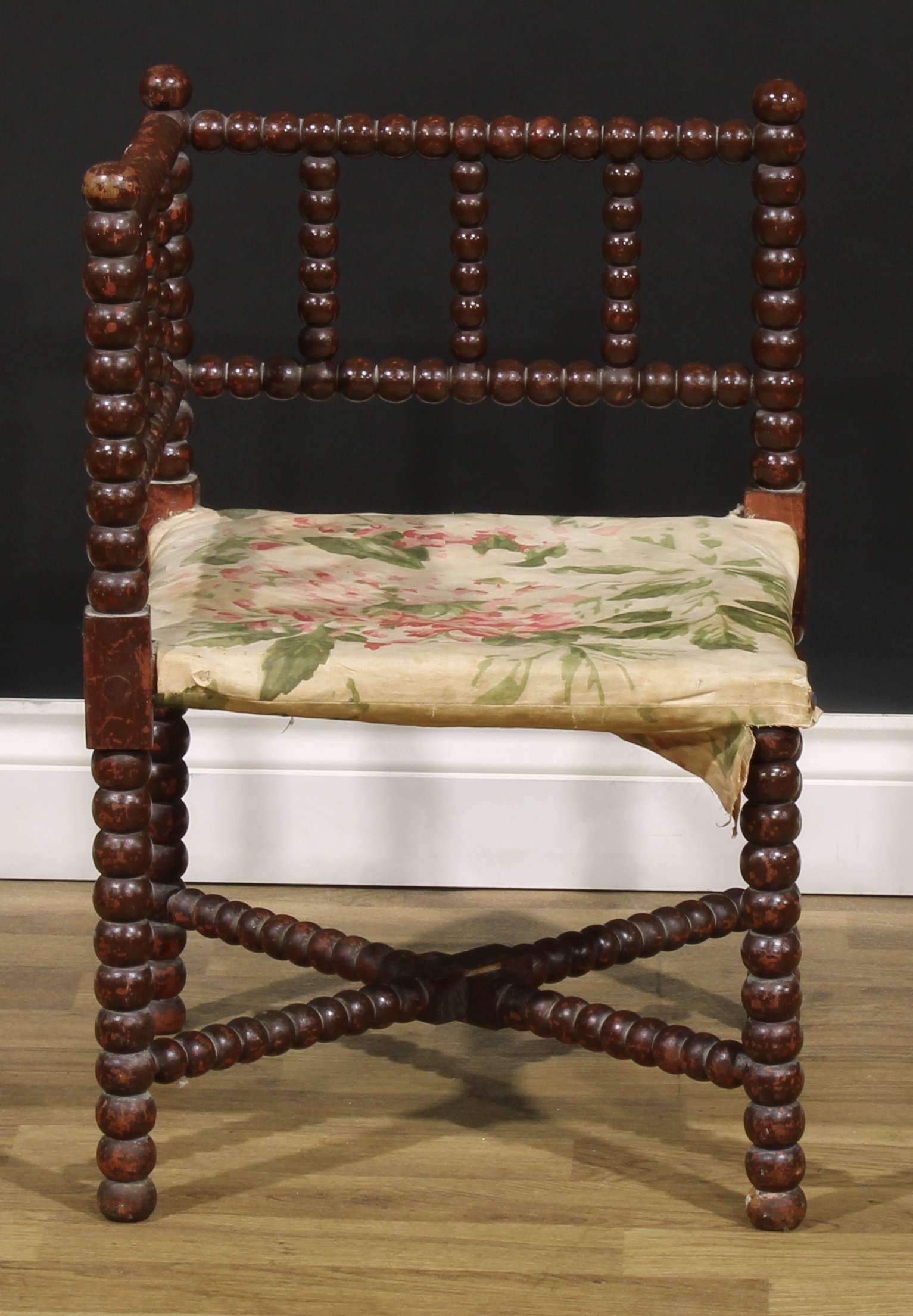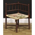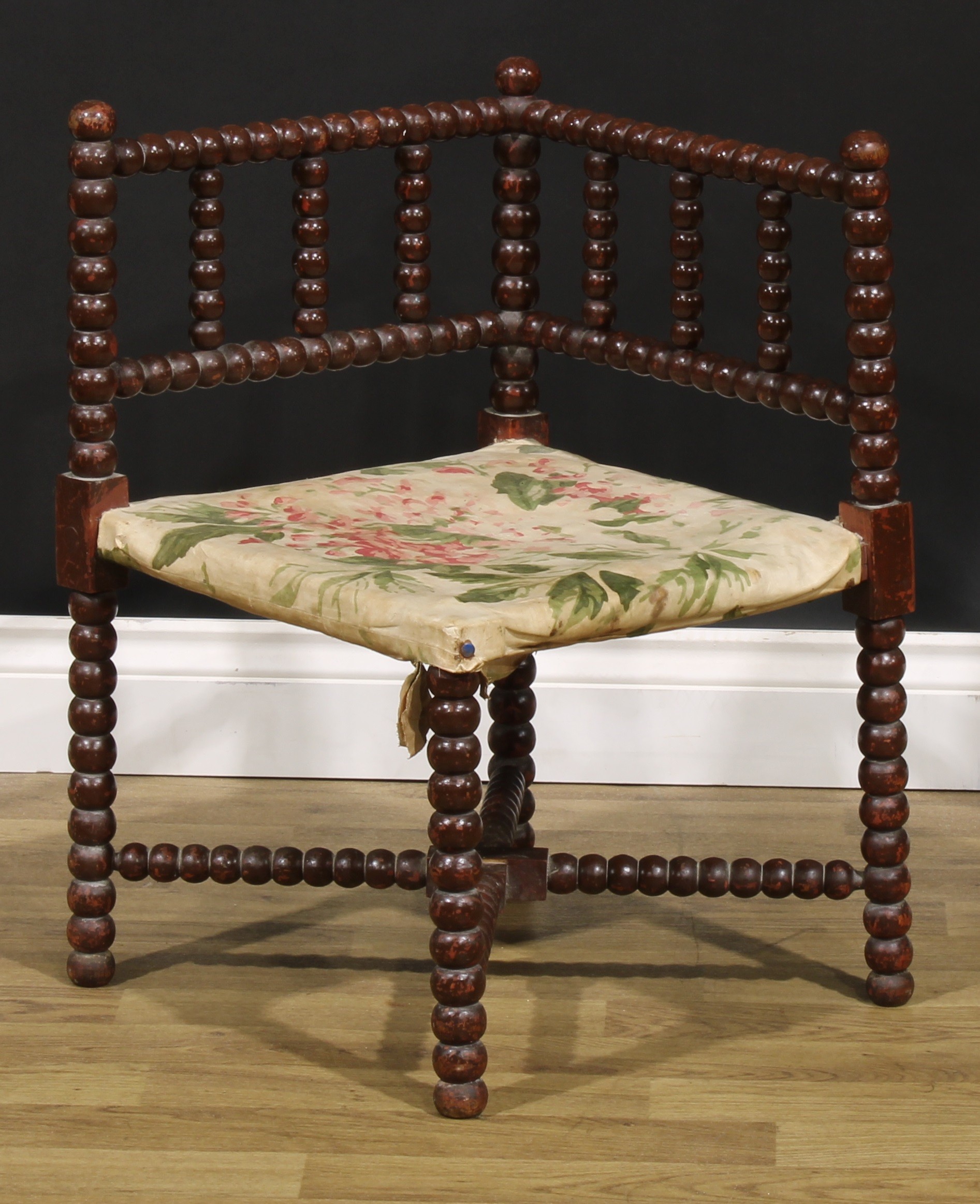 An Arts & Crafts bobbin-turned corner chair, of small proportions, 61cm high, 41cm square