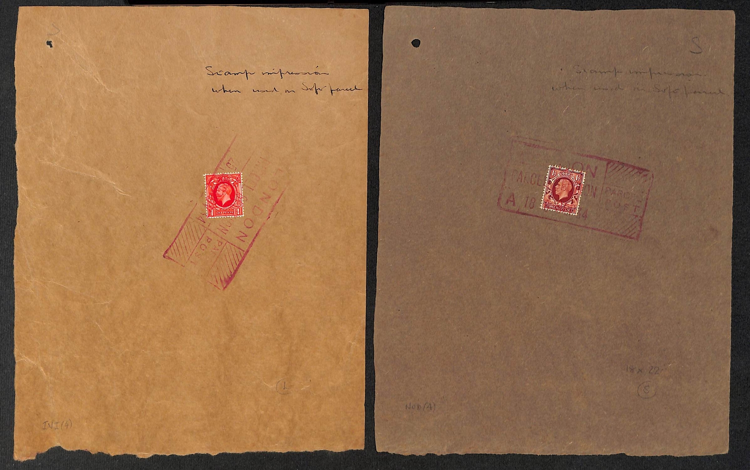 1934 1d and 1½d Photogravure colour trials in the issued colours, affixed to separate parcel pieces, cancelled London Parcel Section trial cancels in red, each piece endorsed "stamp impression when used on soft parcel", with a photocopy of a B.P.A Certificate issued for an identical item bearing a 1½d orange-brown colour trial. S.G. £2,000 for the 1½d trial, the similar 1d trial unlisted. (2).
