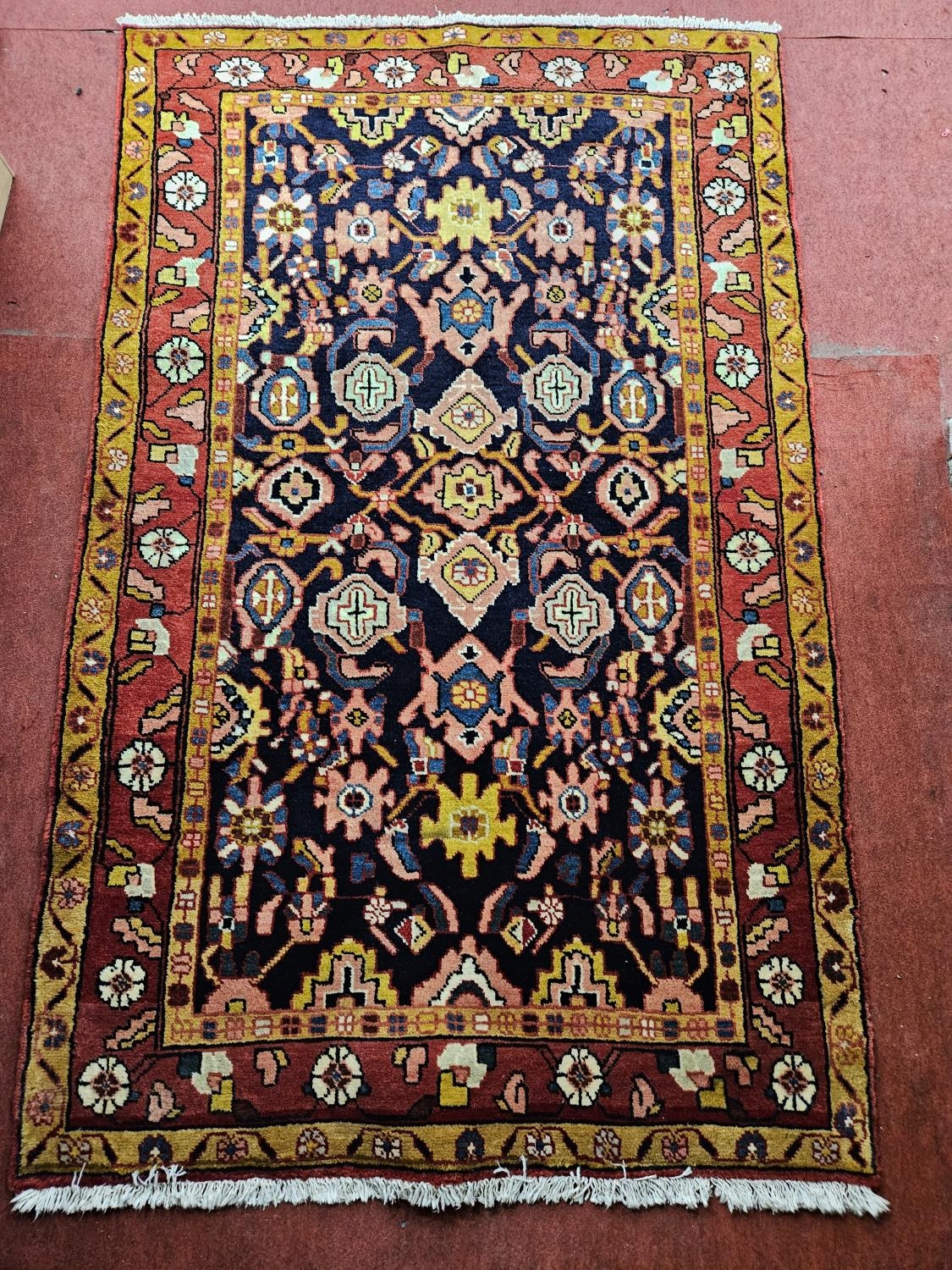 A deep ground Persian Hamden village Rug with an all over design 185 x 110 cm approx.