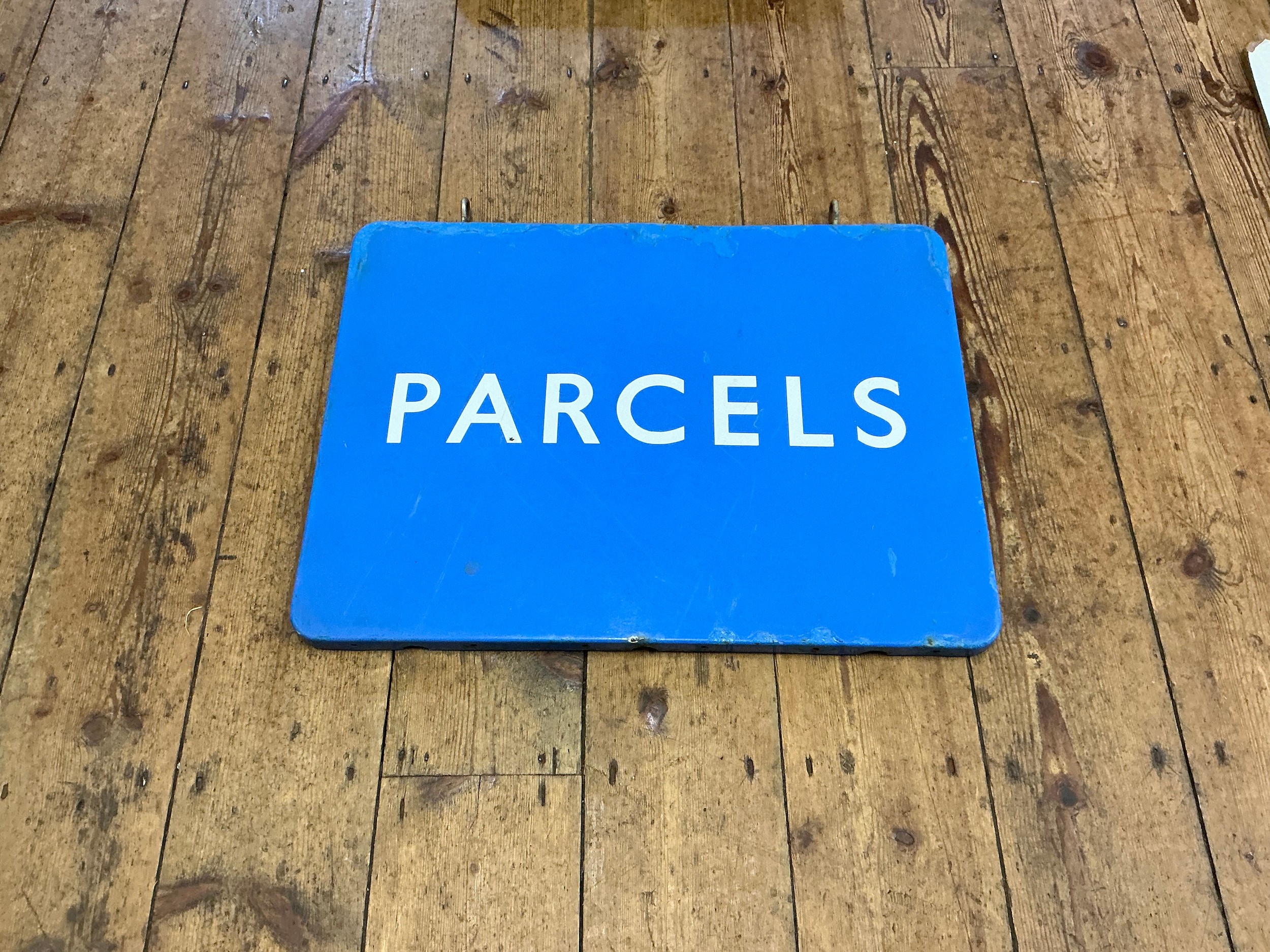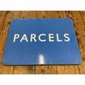 An Original Vintage Railway Station Tin/Enamel Hanging Sign "PARCELS" in Blue. Measuring: 61cms x 45cms.