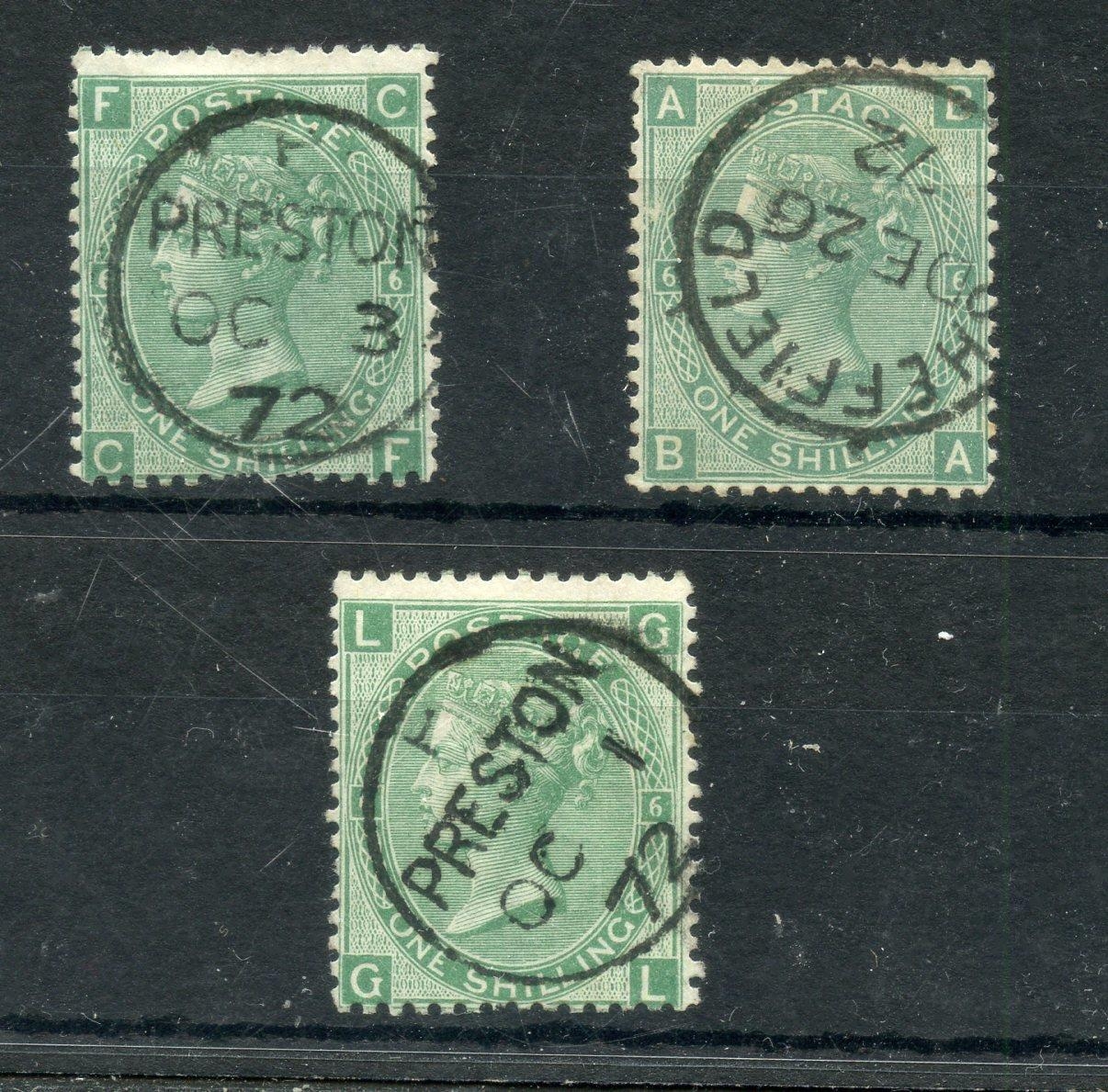 1867 - 80 1/- plate 6 x 3 cds examples fu. SG 117. Cat £135.
