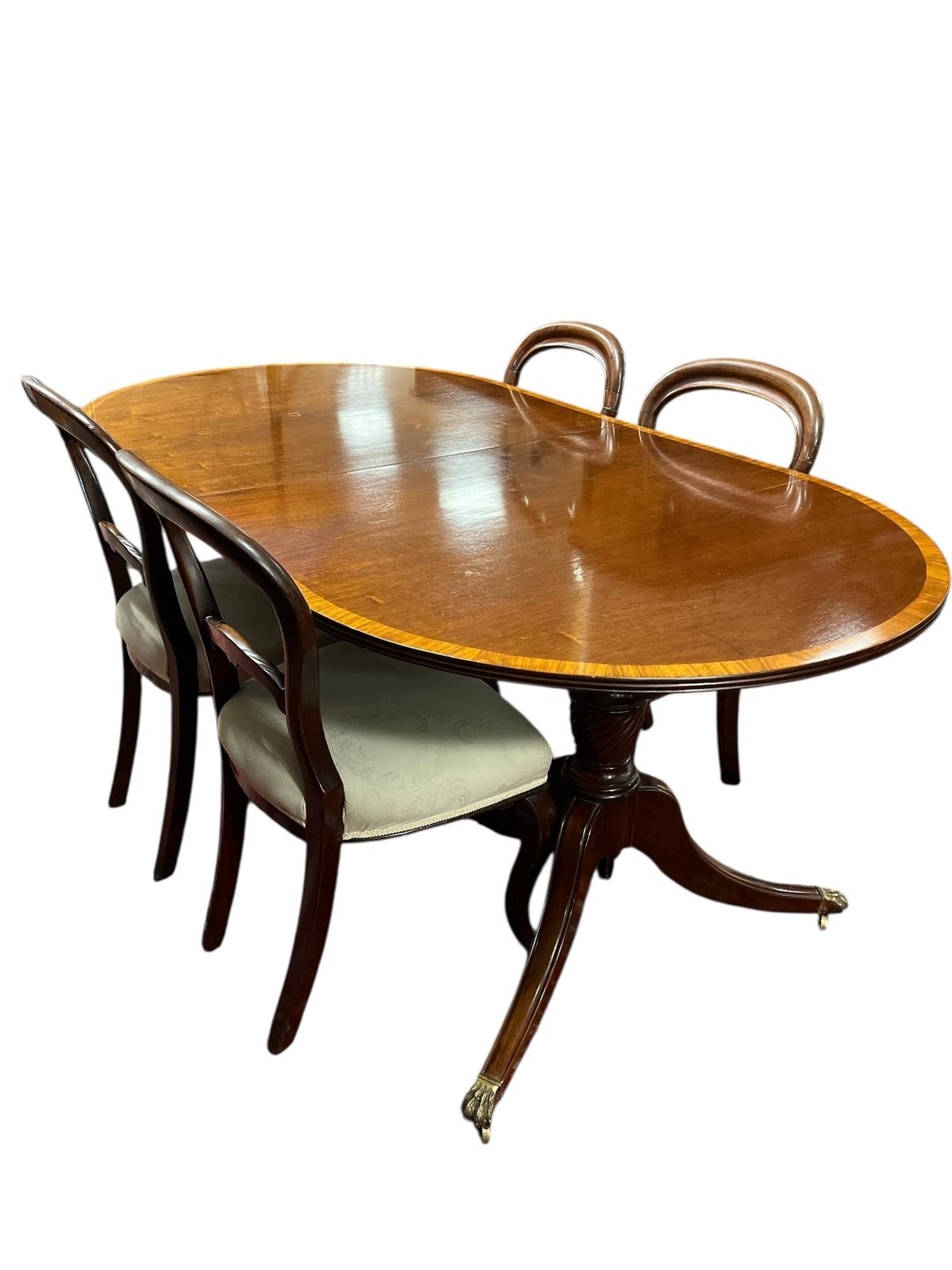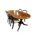 A FIVE PIECE MAHOGANY DINING ROOM SUITE comprising a set of four 19th century mahogany dining chairs the curved top rail and carved splats with upholstered seats on cabriole legs, the dining table of rectangular form with rounded ends with shaped crossbanded top with reeded rim on twin tripod supports with brass caps and castors 74cm (h) x 183cm (w) x 33cm (d)