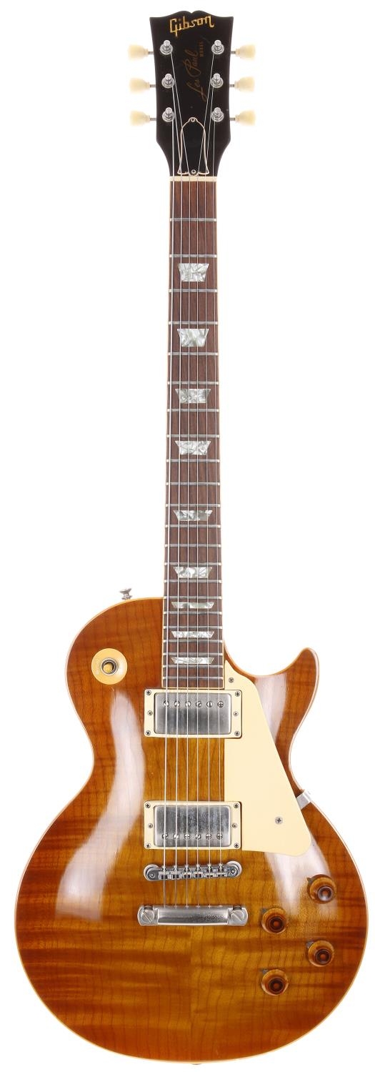1982 Gibson Les Paul Leo's Music '59 Reissue electric guitar, made in USA; Body: amber amber-burst figured maple top upon cherry finished mahogany back, light buckle scratching, a few dings otherwise very good; Neck: mahogany; Fretboard: rosewood; Frets: light wear; Electrics: working, original with Tim Shaw humbucker pickups; Hardware: good; Case: original hard case; Weight: 4.35kg; Overall condition: good for age