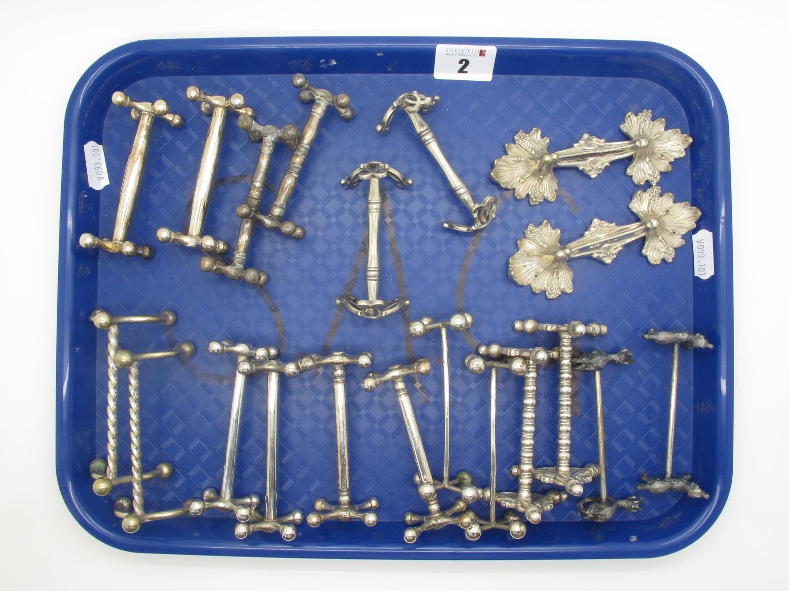 A Collection of Assorted Plated Knife Rests, including pair of acanthus leaf design, hound and stag, etc :- One Tray