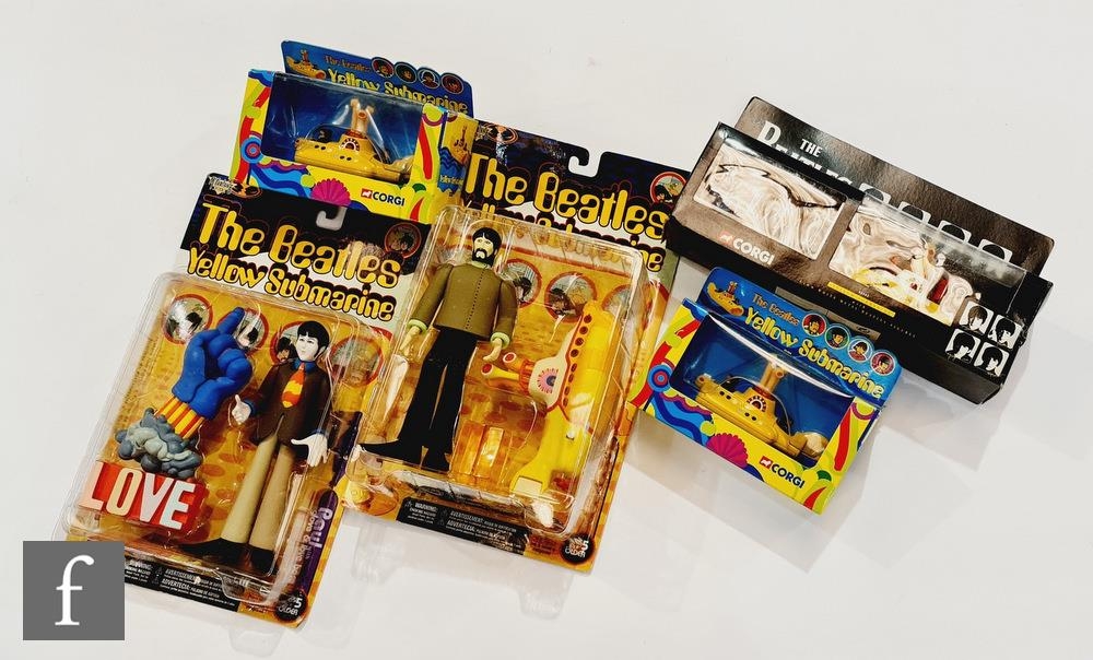 A collection of Beatles Yellow Submarine related models, to include McFarlane Toys George with Yellow Submarine action figure, McFarlane Toys Paul with Glove & Love Base action figure, Corgi 05403 Yellow Submarine diecast model with 54mm white metal Beatles figures and two Corgi 05404 Yellow Submarine diecast models, all in original packaging. (5)