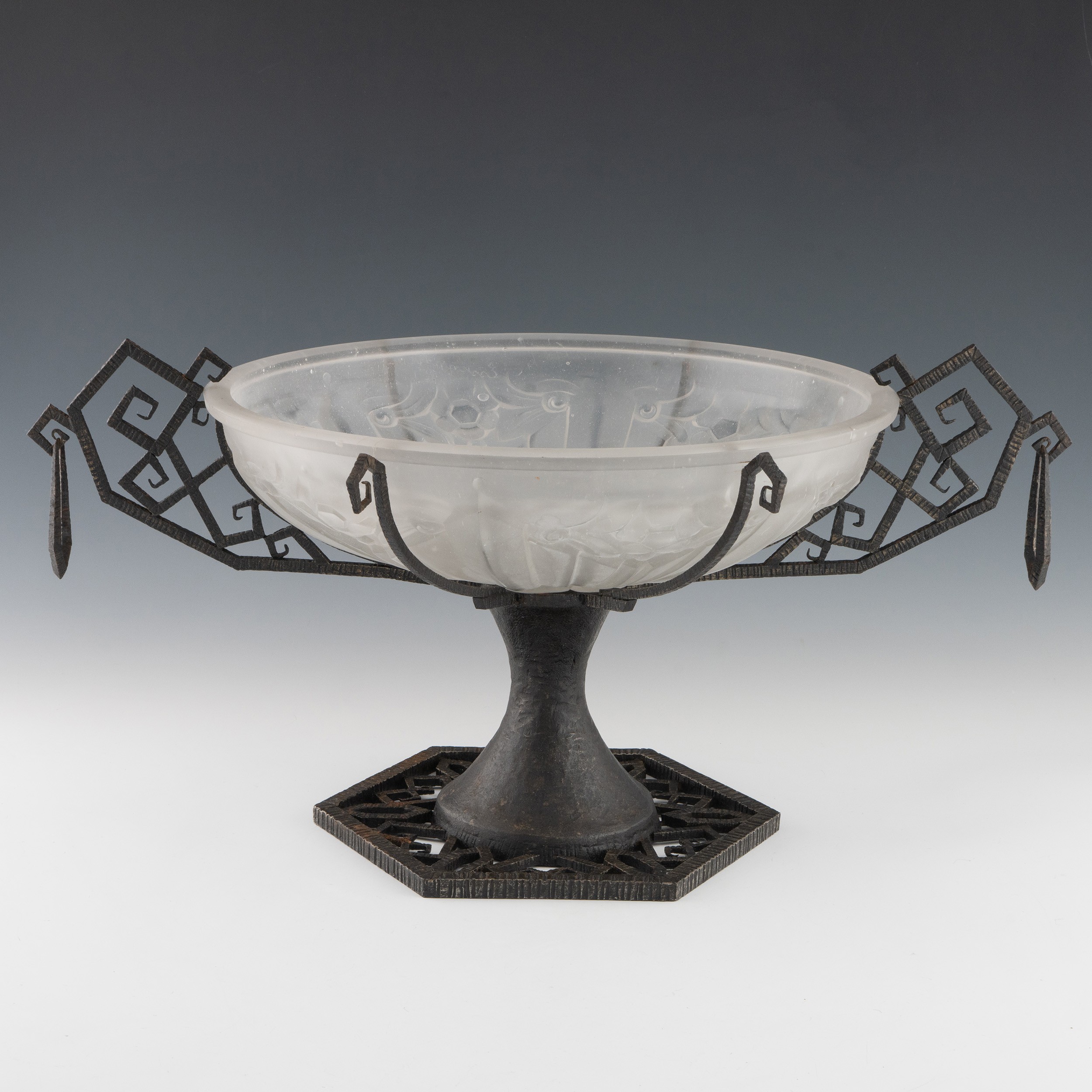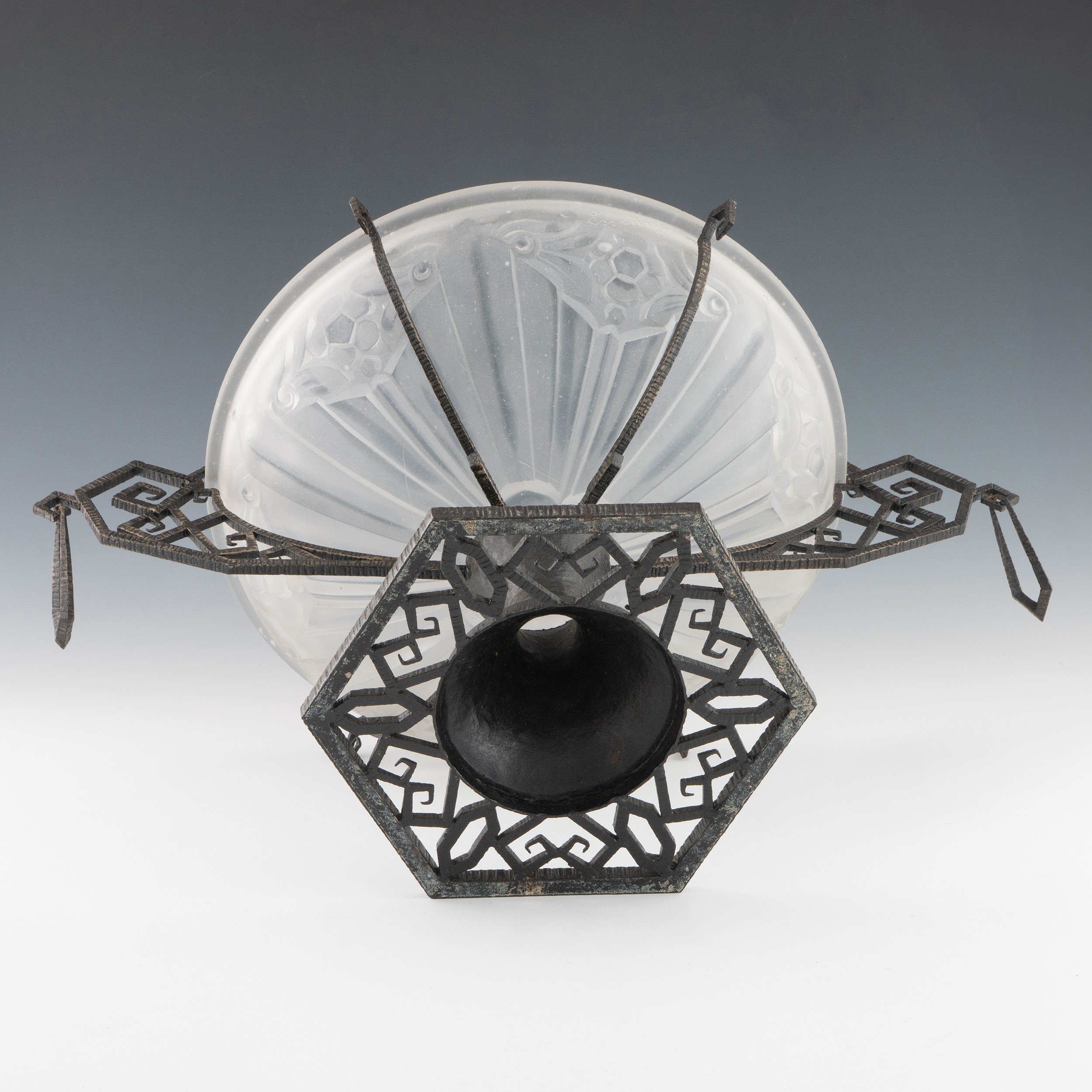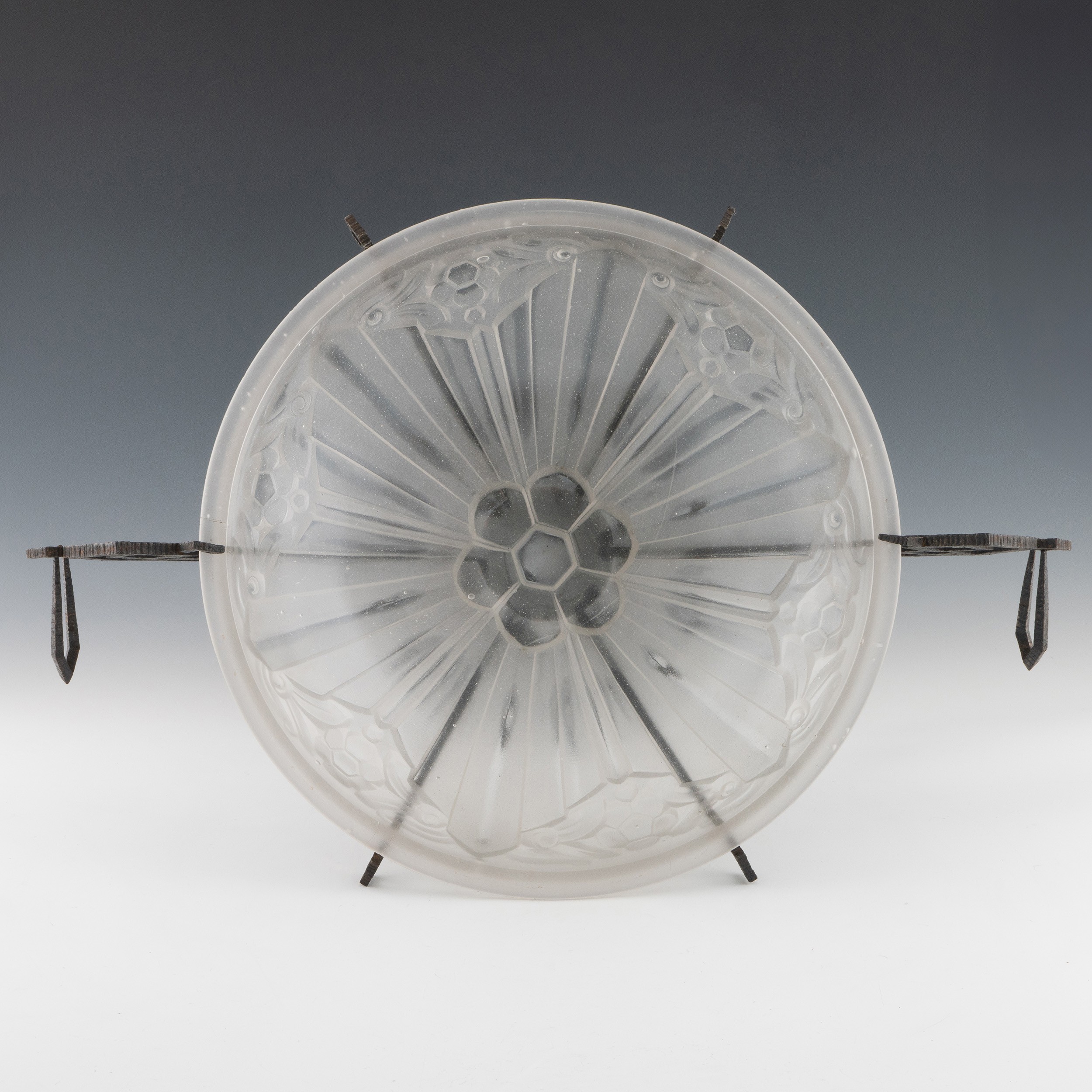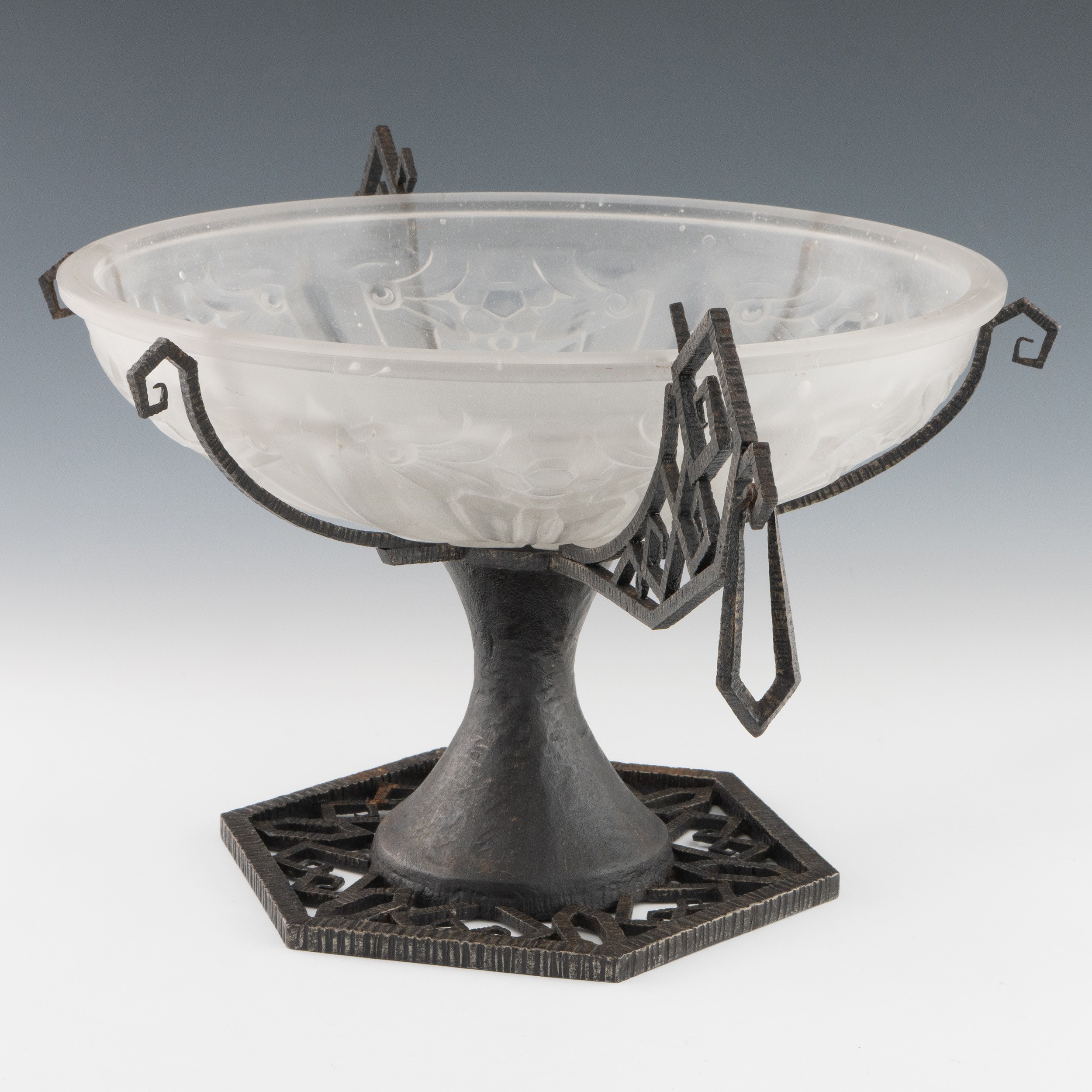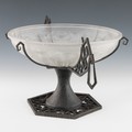 A 1920s Art Deco glass and cast iron table centrepiece, clear and frosted moulded glass body with satin finish and with two handles and four additional supports on patinated cast iron base. Geometric moulded glass, moulded signature on 'ESSENEVE.R(?)' or similar it is difficult to establish, 35cm diameter, 24cm height. (LDC145)