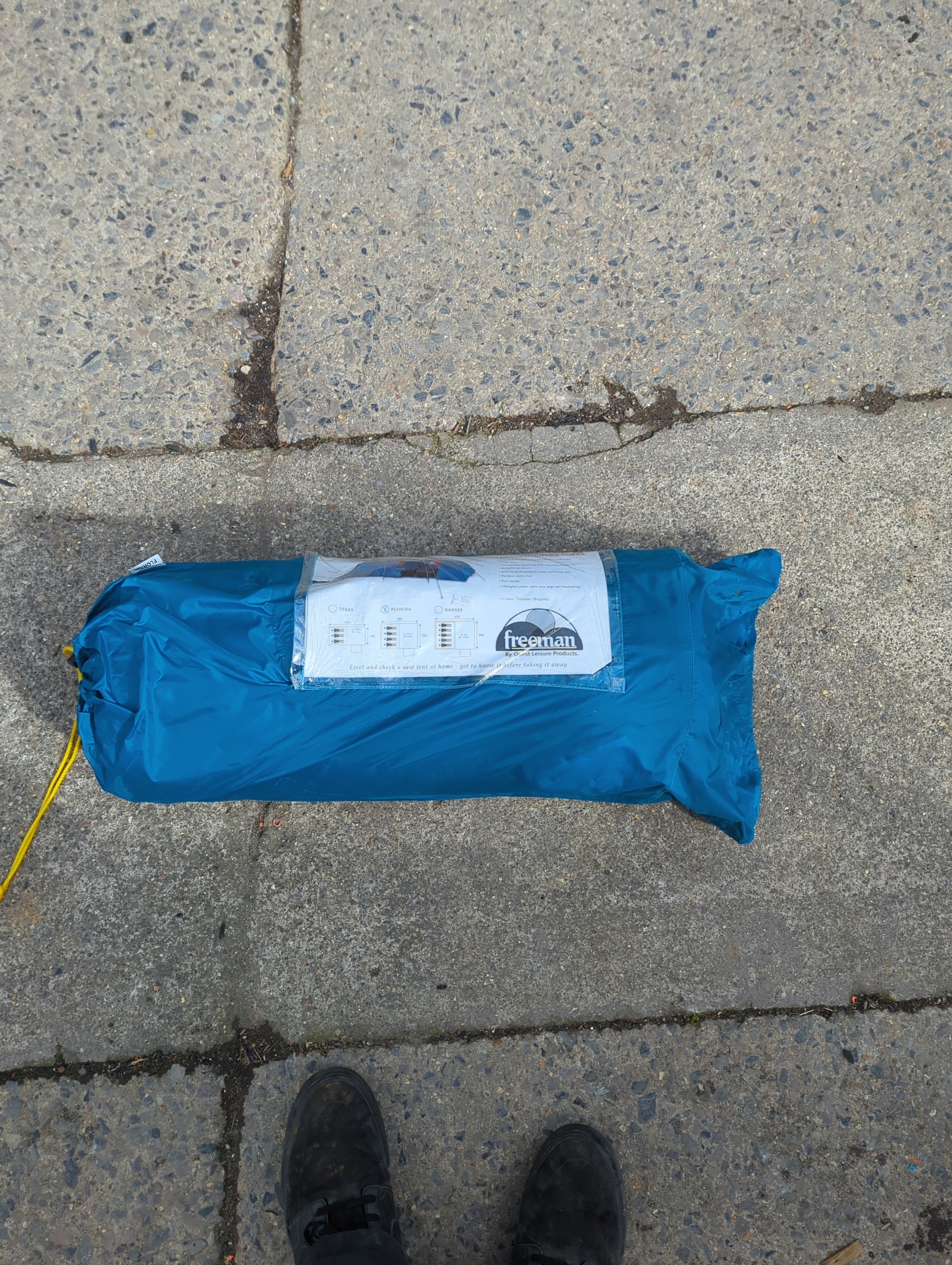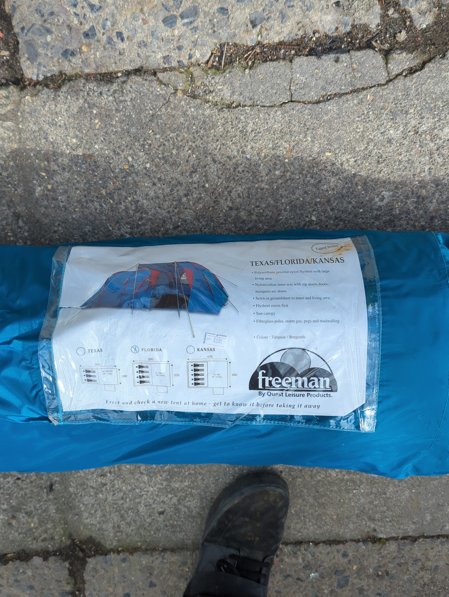 This item is a Freeman tent model named Texas/Florida/Kansas, packaged in a blue carry bag. The tent appears to be designed for outdoor use, suitable for camping or other outdoor activities. The packaging includes instructions and diagrams for setup, indicating a freestanding structure.