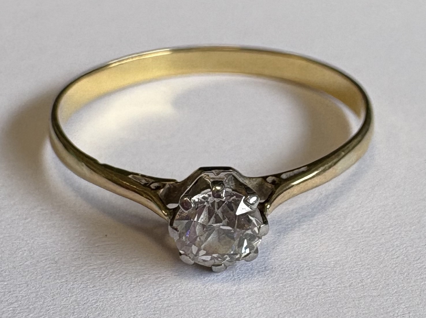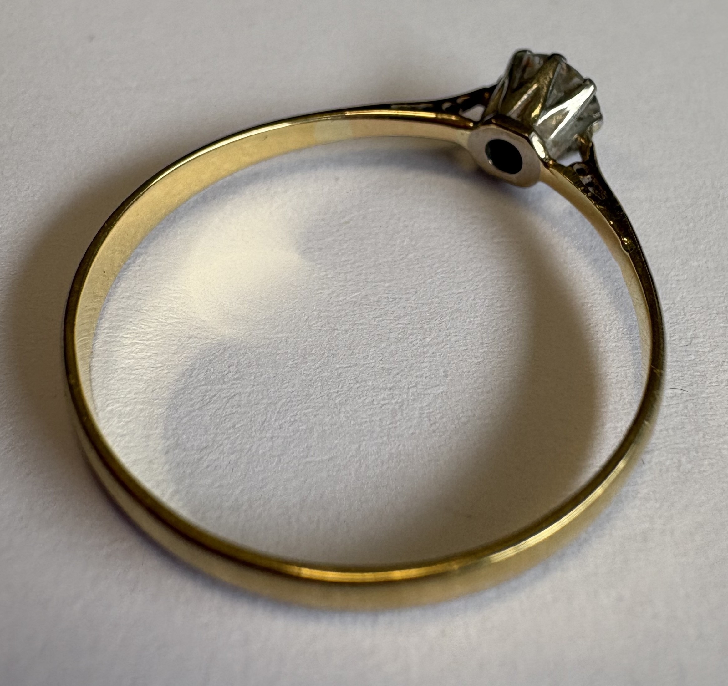 A small single-stone diamond ring in 18 carat gold and platinum setting. Approx. 3 grams. Est. £120 - £150.