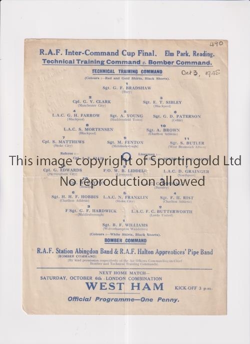 SERVICES FOOTBALL AT READING F.C. 1945 Single sheet programme for Technical Training Command v Bomber Command 3/10/1945 at Elm Park, date written and slightly creased. Generally good