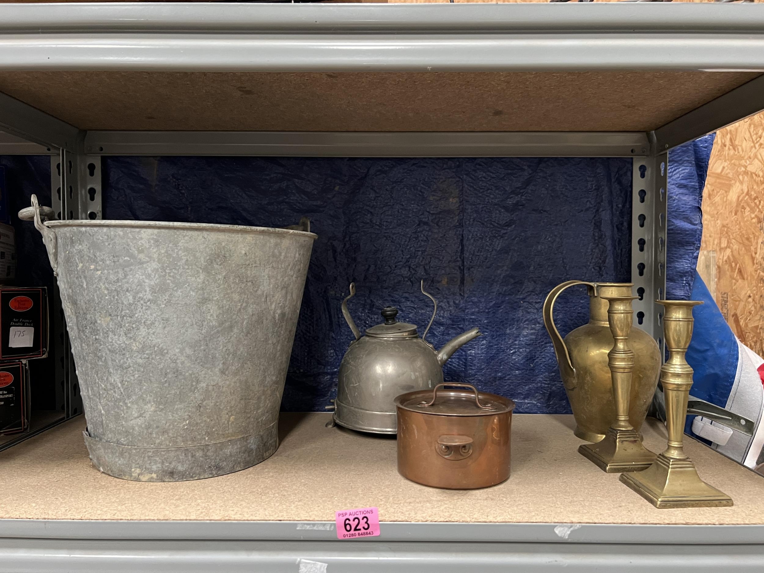 Galvanised bucket plus brass candle sticks etc..