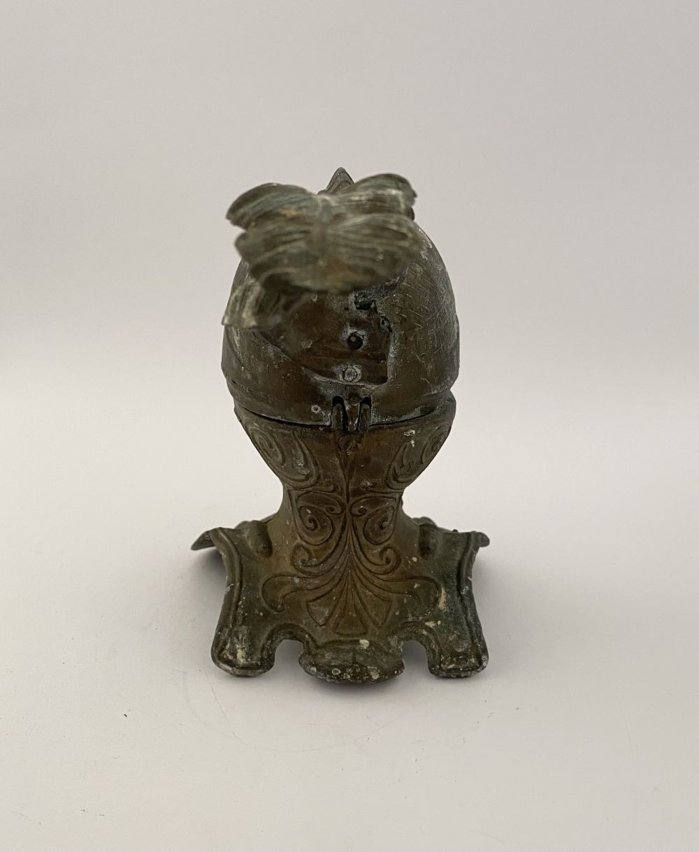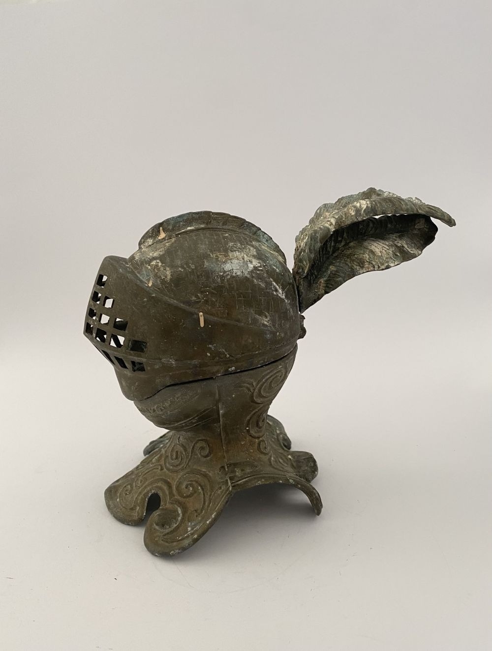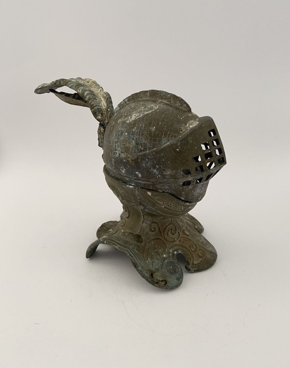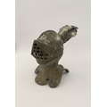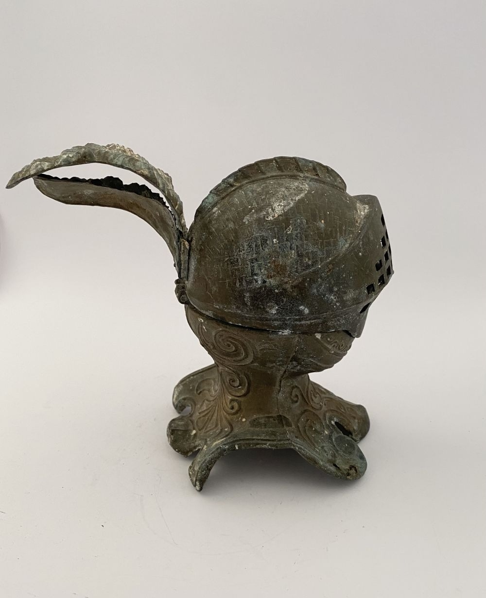 A VINTAGE METAL HELMETED KNIGHTS BUST INKWELL, inkwell in the form of knight in armour, hinged helmet opens to reveal knights face & inkwell. Dimensions: 14cm high approx.