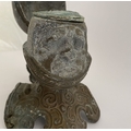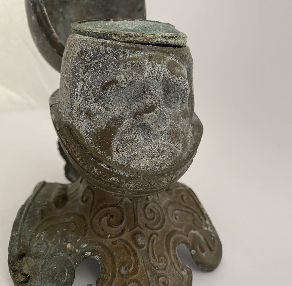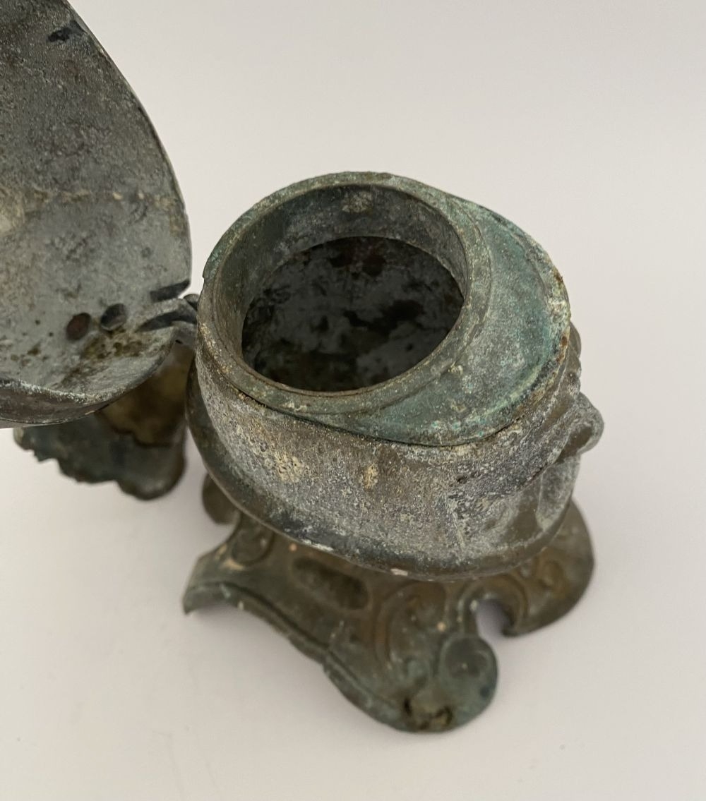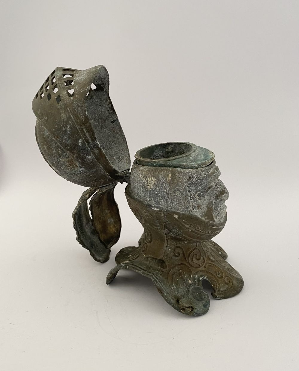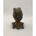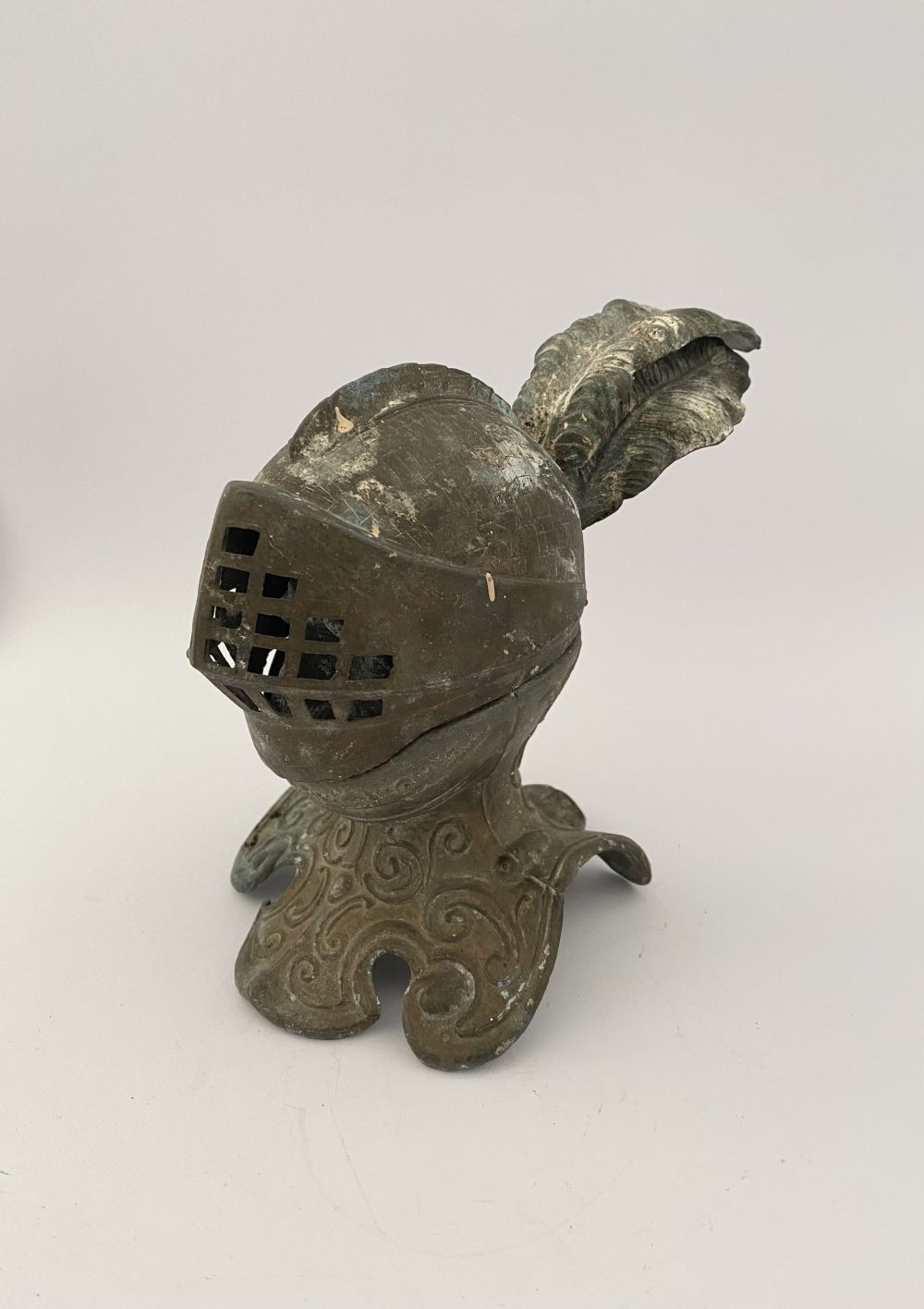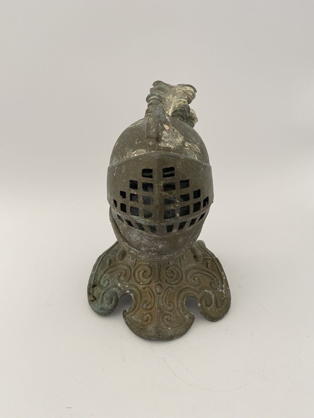 A VINTAGE METAL HELMETED KNIGHTS BUST INKWELL, inkwell in the form of knight in armour, hinged helmet opens to reveal knights face & inkwell. Dimensions: 14cm high approx.