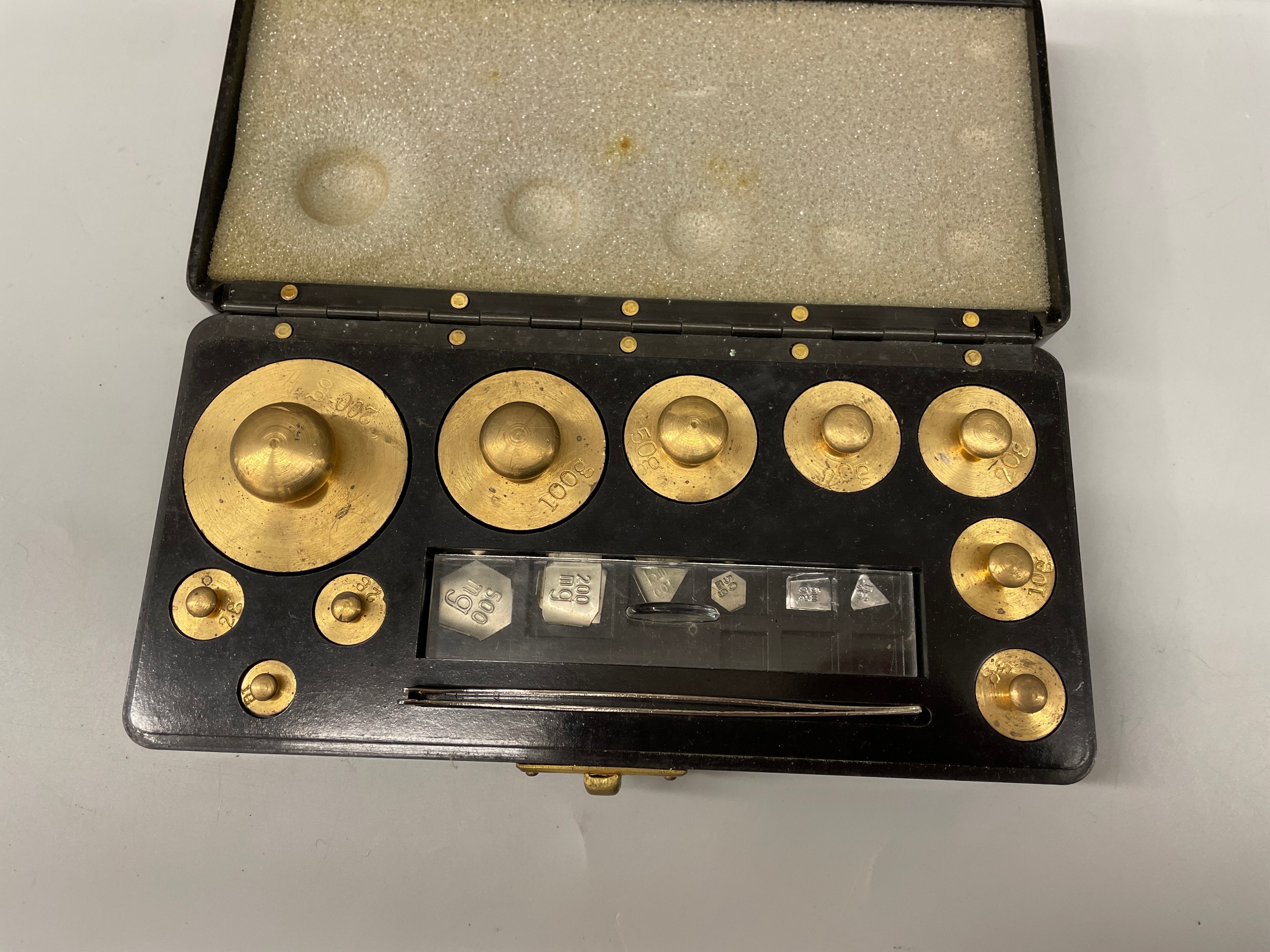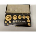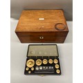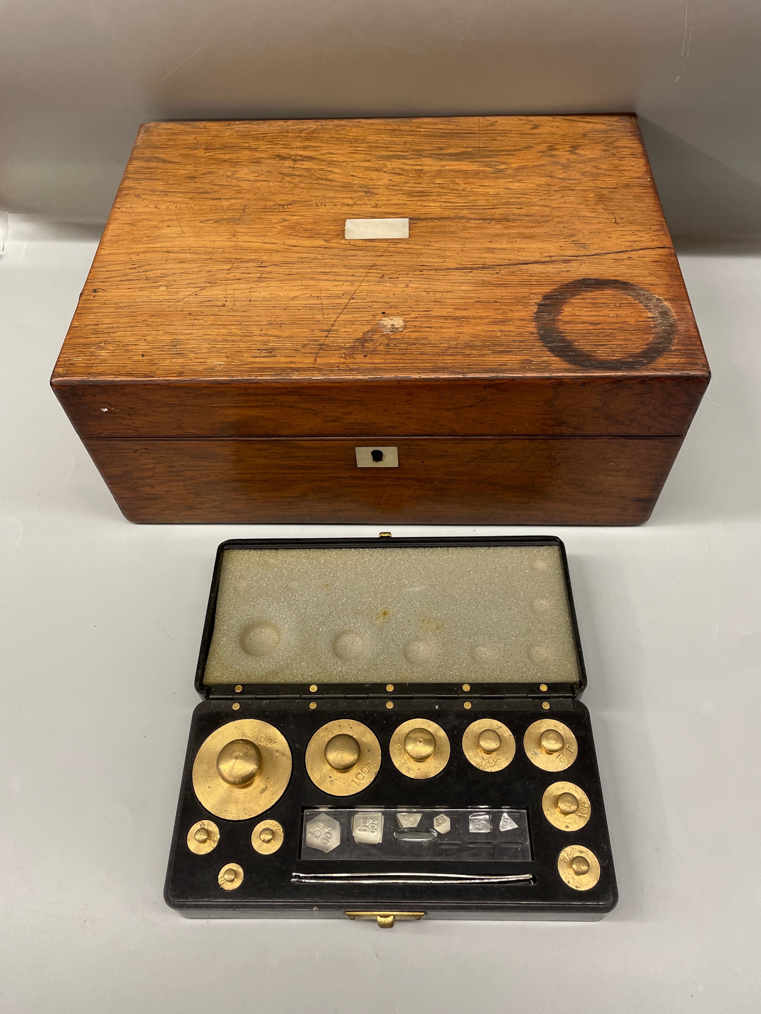 SET OF CASED BRASS WEIGHTS AND TWEEZERS, AND MAHOGANY BOX