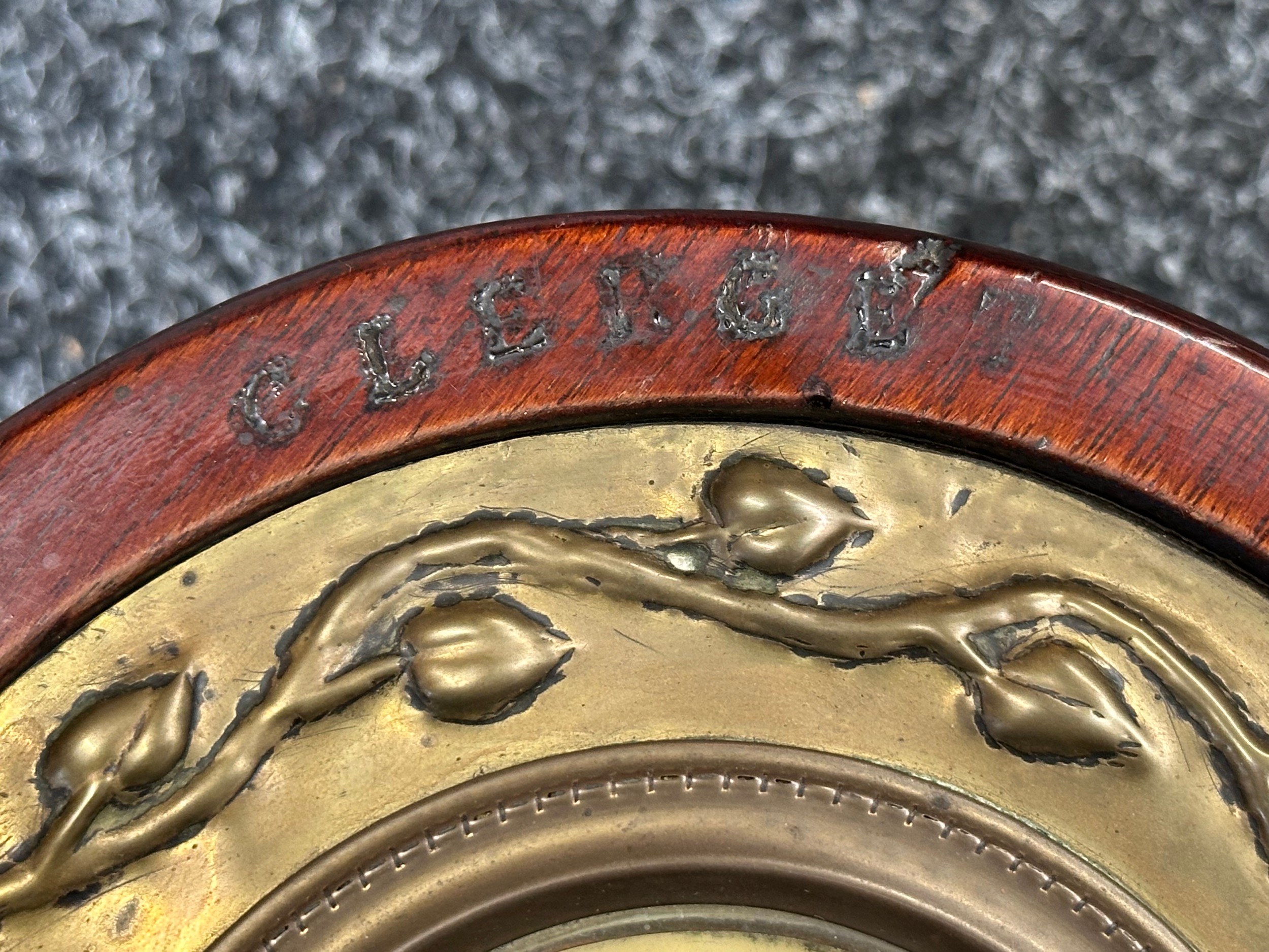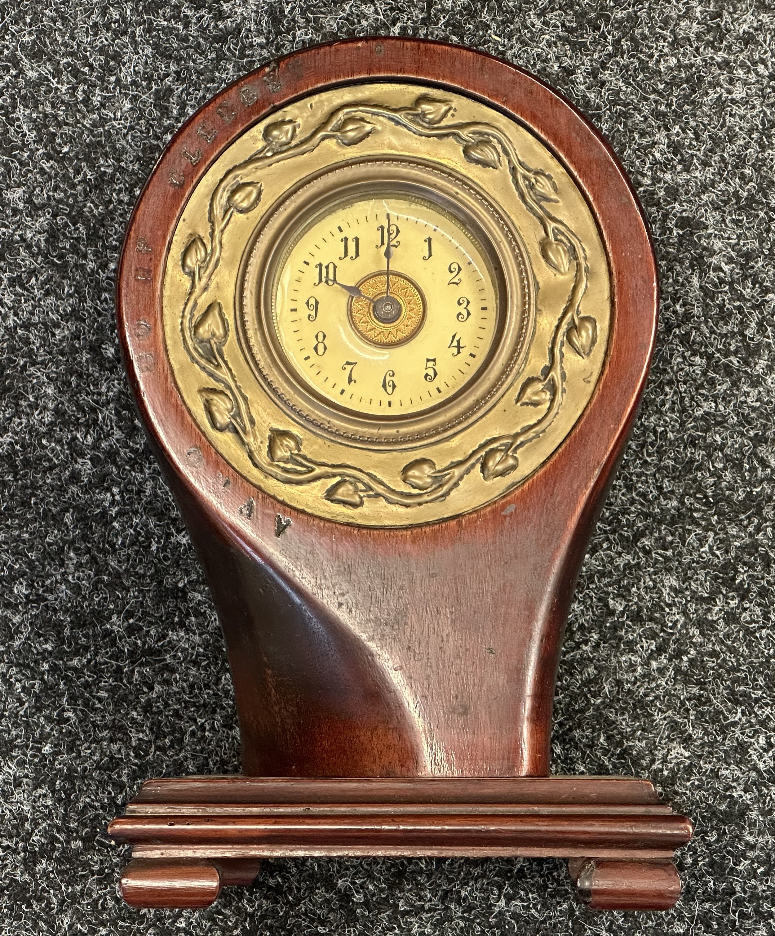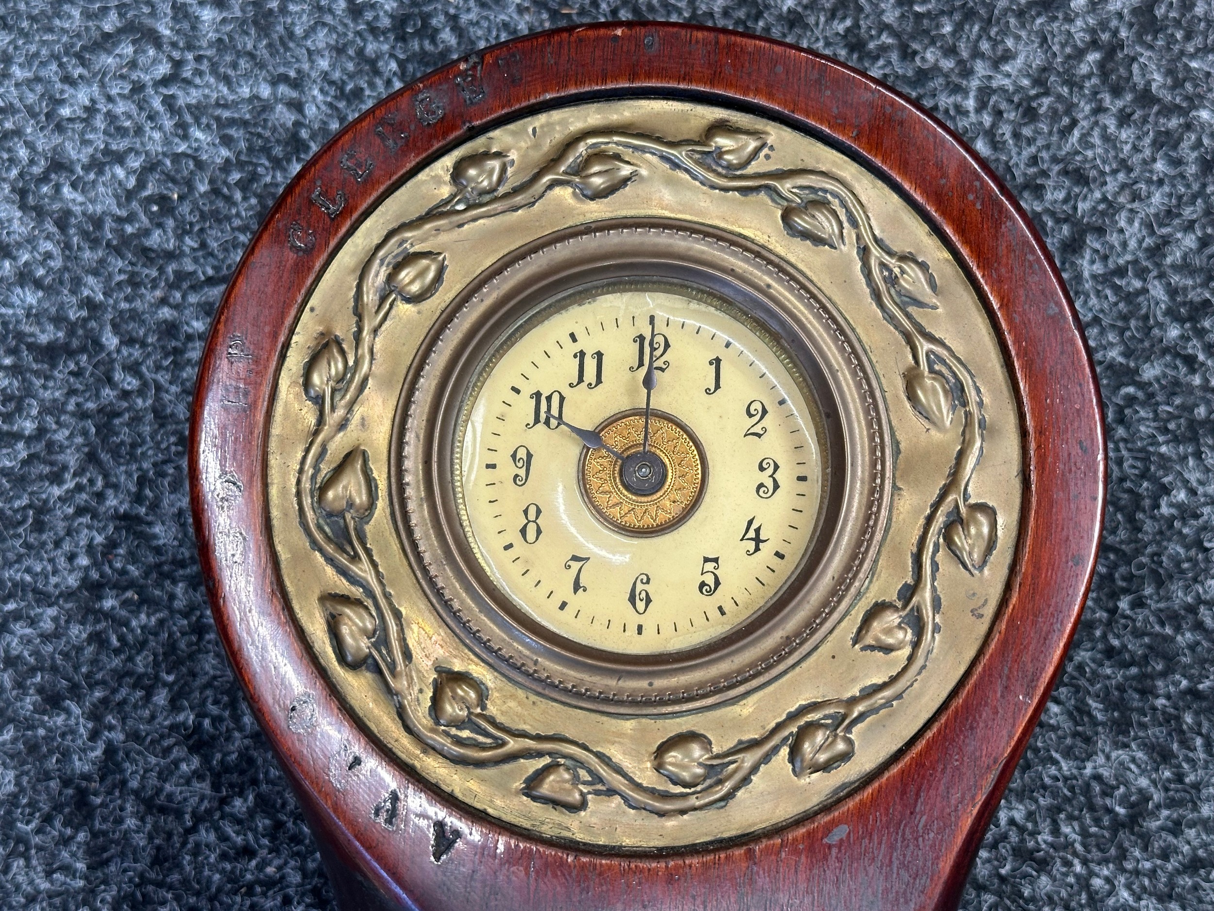 WW1 British Royal Flying Corps Trench Art Propellor Boss Clock made from an AVRO Propeller for the 80 HP Clerget Engine. Well marked. Fitted with a period clock, missing winder. Overall Height 290mm. Overall Width 180mm.
