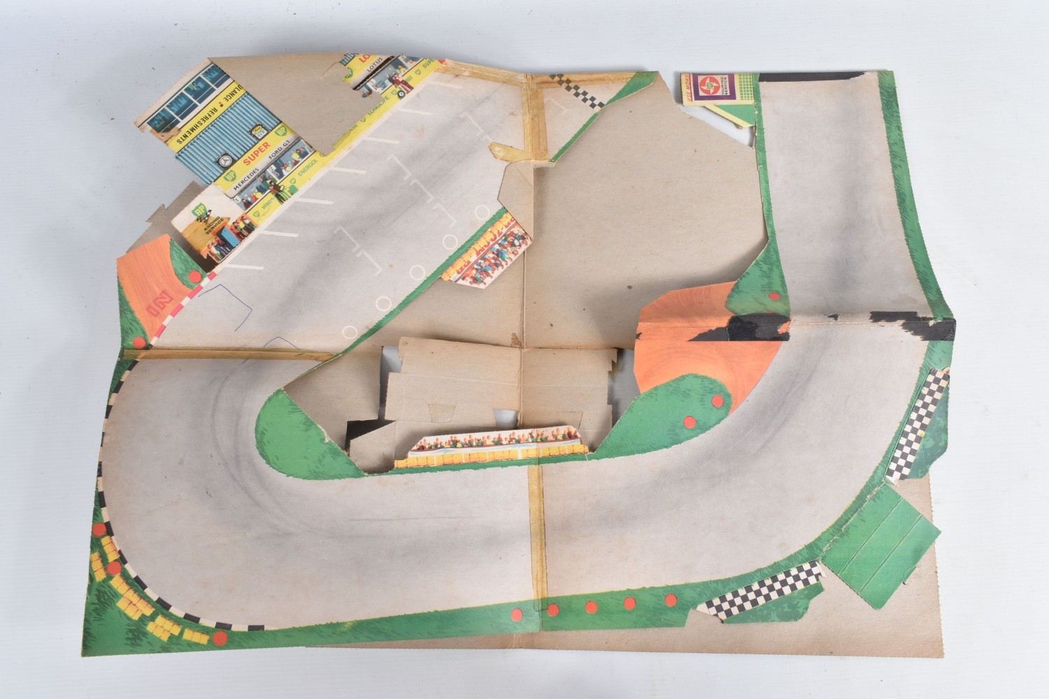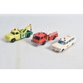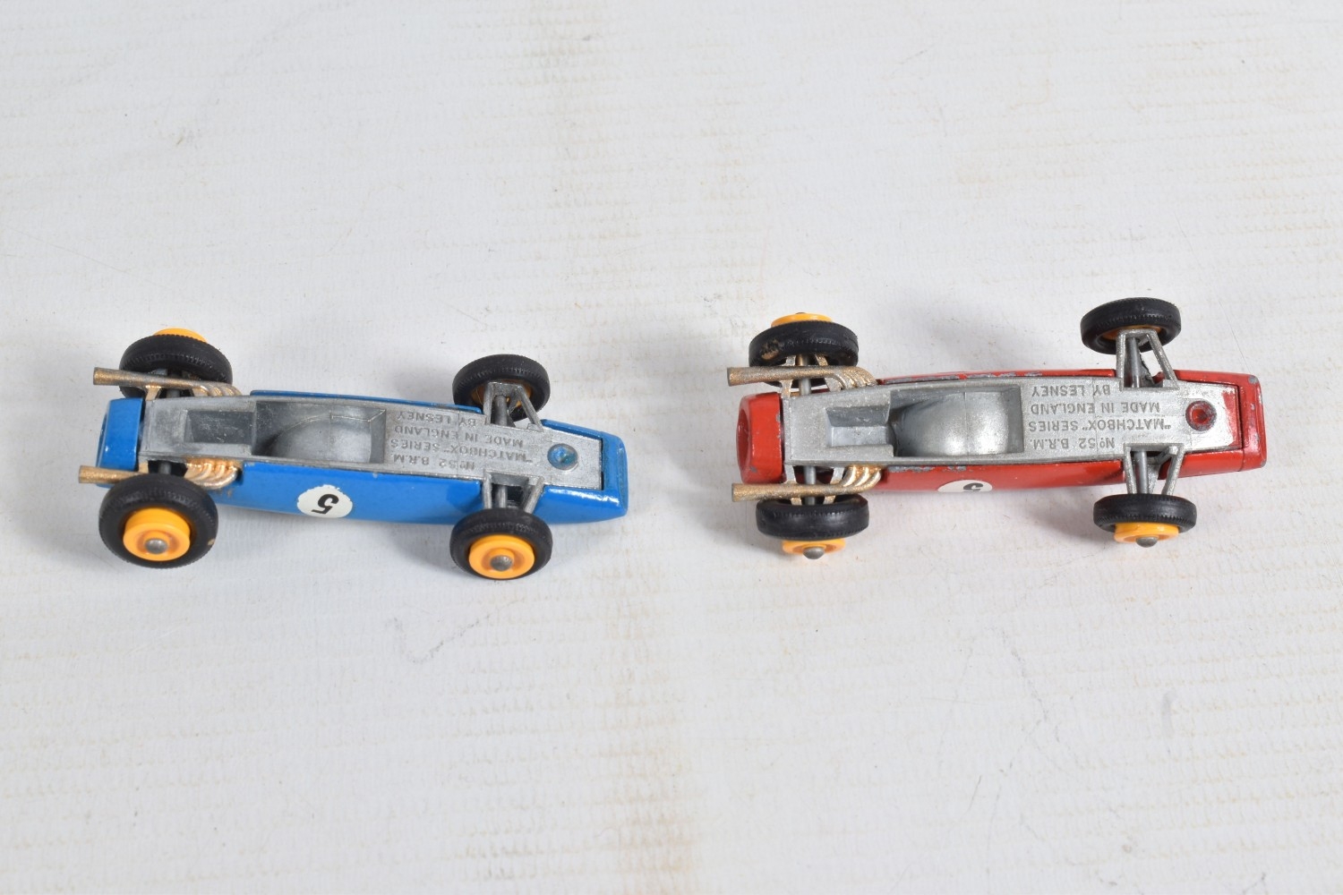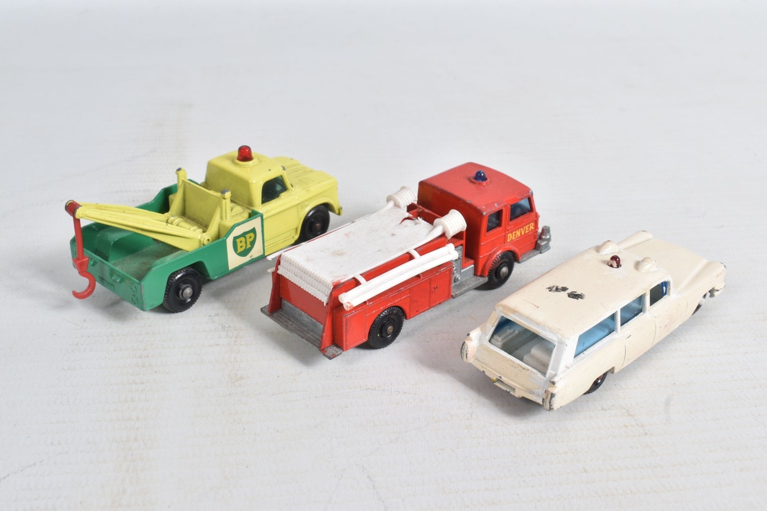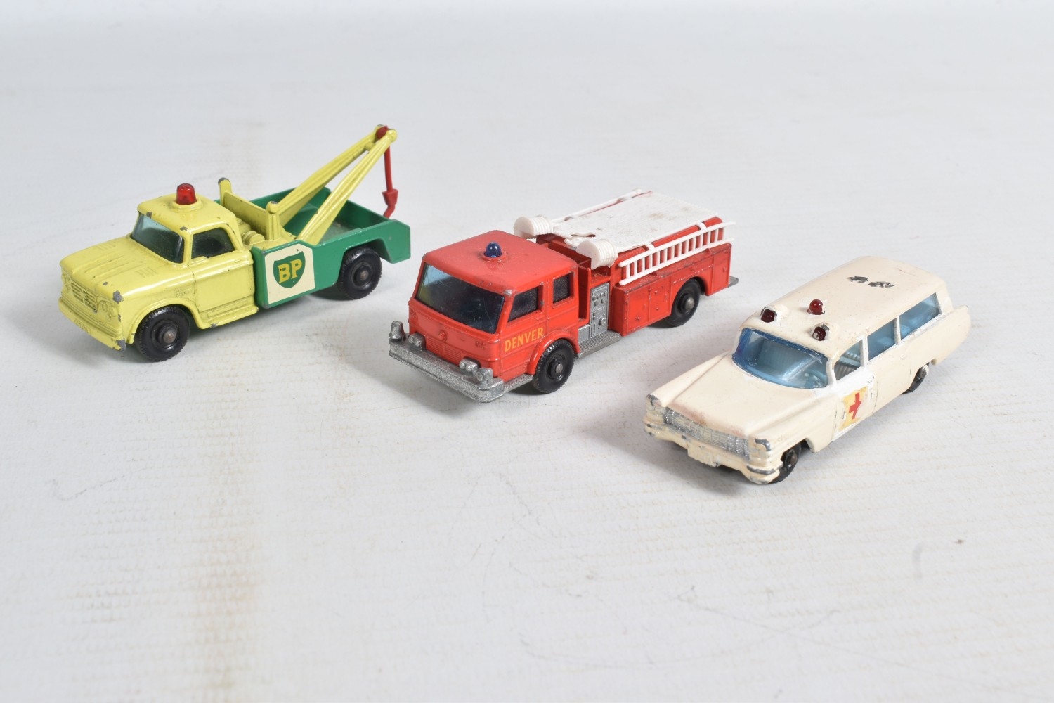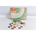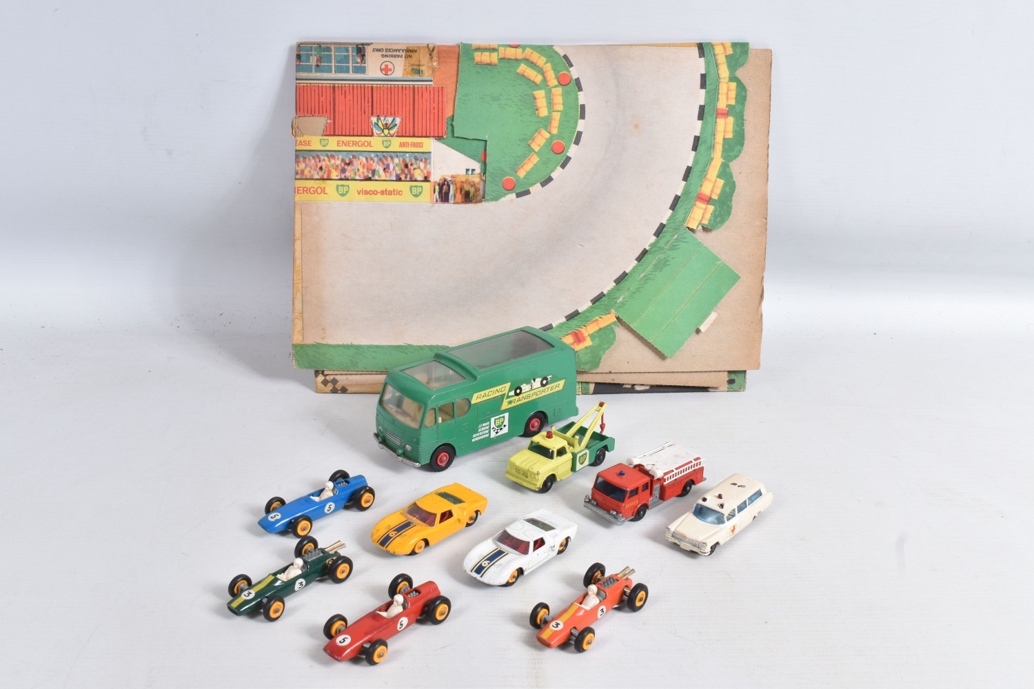 AN UNBOXED MATCHBOX GRAND PRIX RACE SET, No.G-4, complete correct contents, Dodge Wreck Truck, No.13, 2 x Lotus Racing Car, No.19, dark green and orange body versions both with yellow hubs, white plastic driver and RN3, 2 x Ford GT Racer, No.41, white and yellow body versions, both with yellow hubs, red interior and RN6, 2 x BRM Racing Car, No.52, blue and red body versions both with yellow hubs, white plastic driver and RN5, Cadillac Ambulance, No.54, Fire Pumper Truck, No.29, version with Denver decals, Major Pack No.M6/King Size No.K5 Racing Car Transporter, with card Race Track layout, all appear complete and in fairly good condition with some paint loss and wear, minor wear to decals, the red BRM appears to have had some re-touching to the paintwork, Ambulance missing Red Cross decal from one door, card layout appears largely complete but has some damage, wear and old repairs, no box