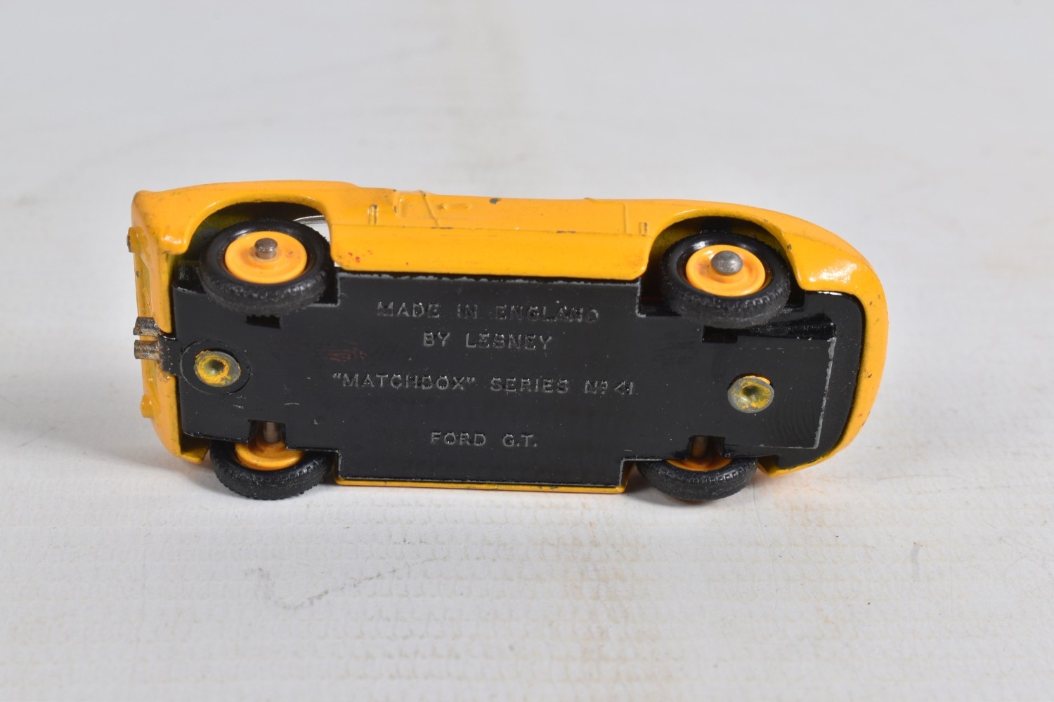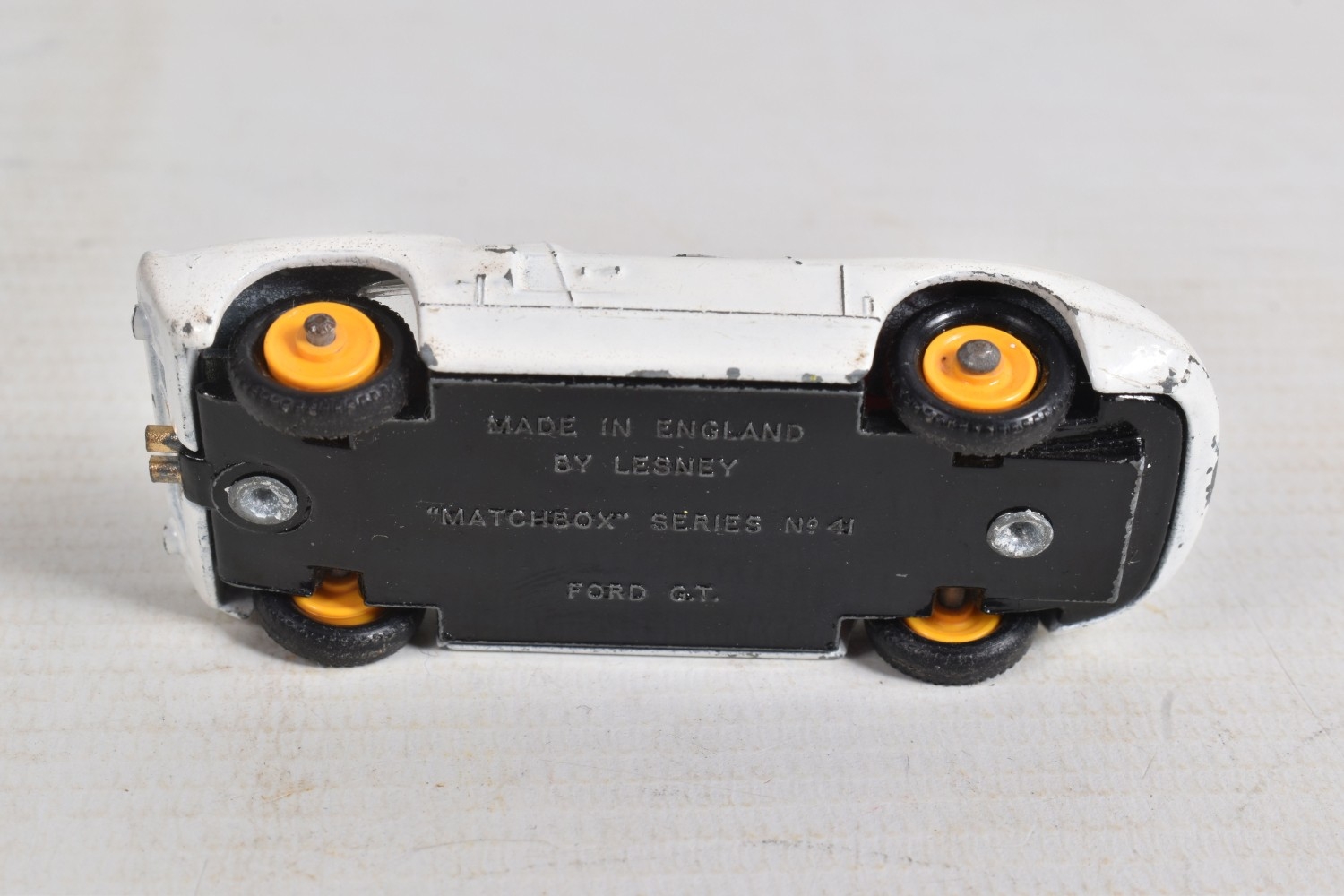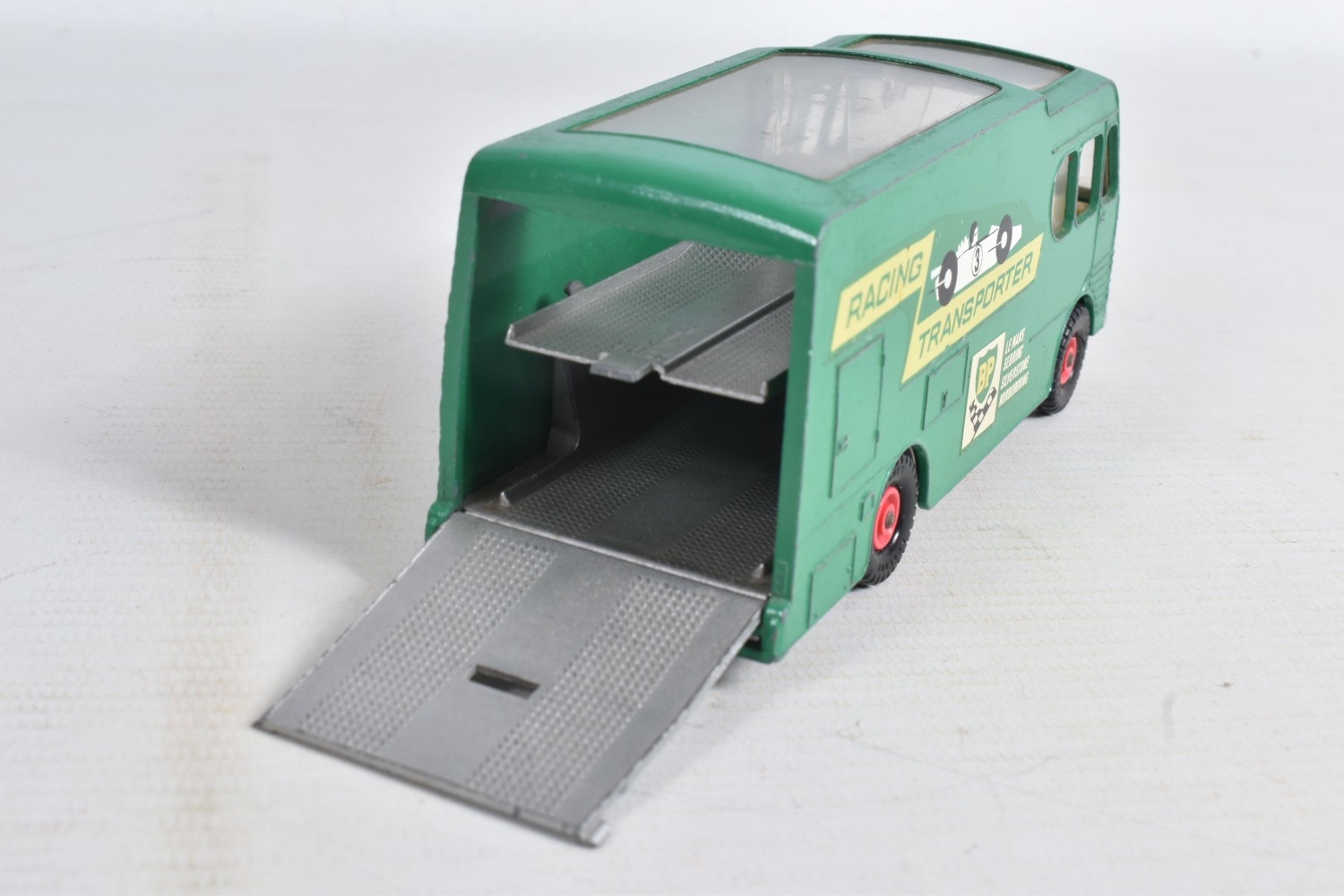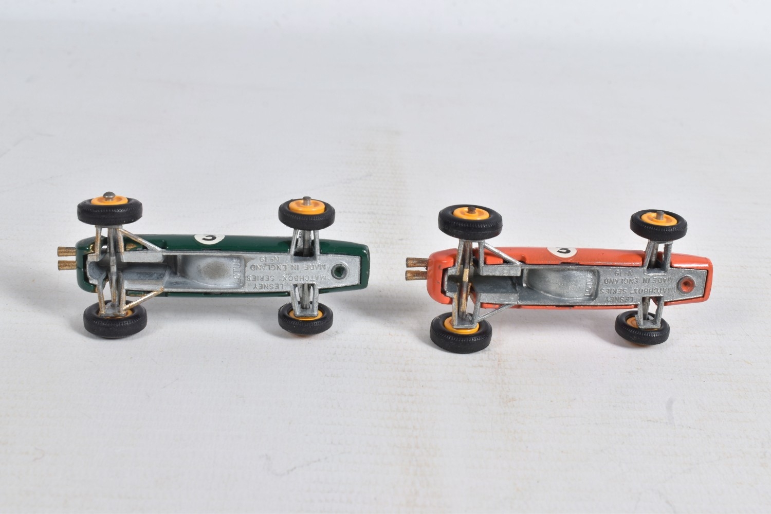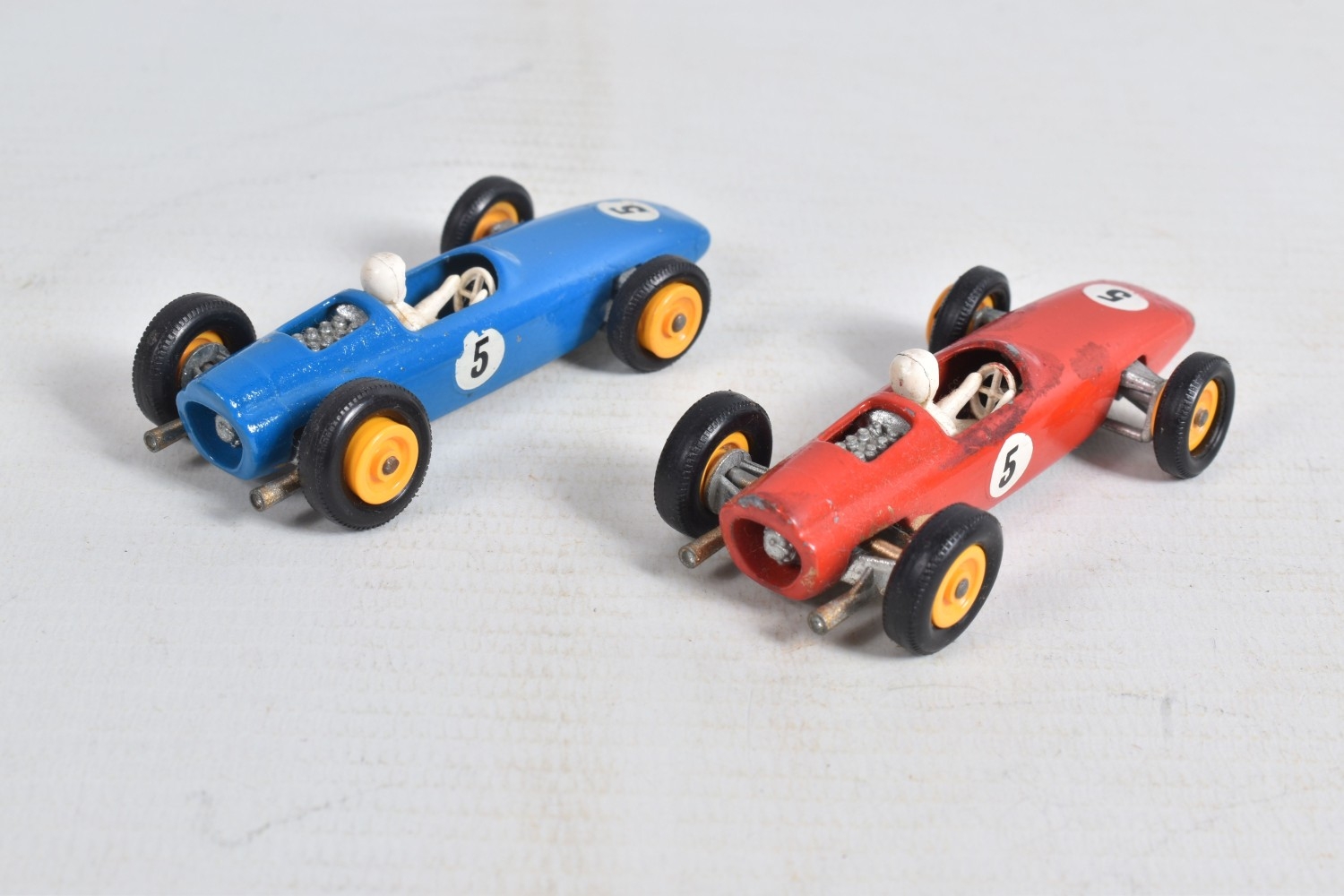 AN UNBOXED MATCHBOX GRAND PRIX RACE SET, No.G-4, complete correct contents, Dodge Wreck Truck, No.13, 2 x Lotus Racing Car, No.19, dark green and orange body versions both with yellow hubs, white plastic driver and RN3, 2 x Ford GT Racer, No.41, white and yellow body versions, both with yellow hubs, red interior and RN6, 2 x BRM Racing Car, No.52, blue and red body versions both with yellow hubs, white plastic driver and RN5, Cadillac Ambulance, No.54, Fire Pumper Truck, No.29, version with Denver decals, Major Pack No.M6/King Size No.K5 Racing Car Transporter, with card Race Track layout, all appear complete and in fairly good condition with some paint loss and wear, minor wear to decals, the red BRM appears to have had some re-touching to the paintwork, Ambulance missing Red Cross decal from one door, card layout appears largely complete but has some damage, wear and old repairs, no box