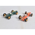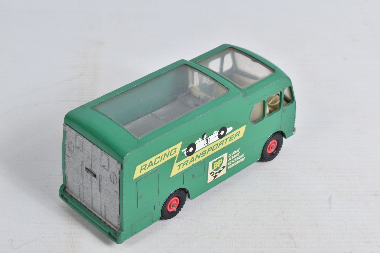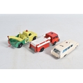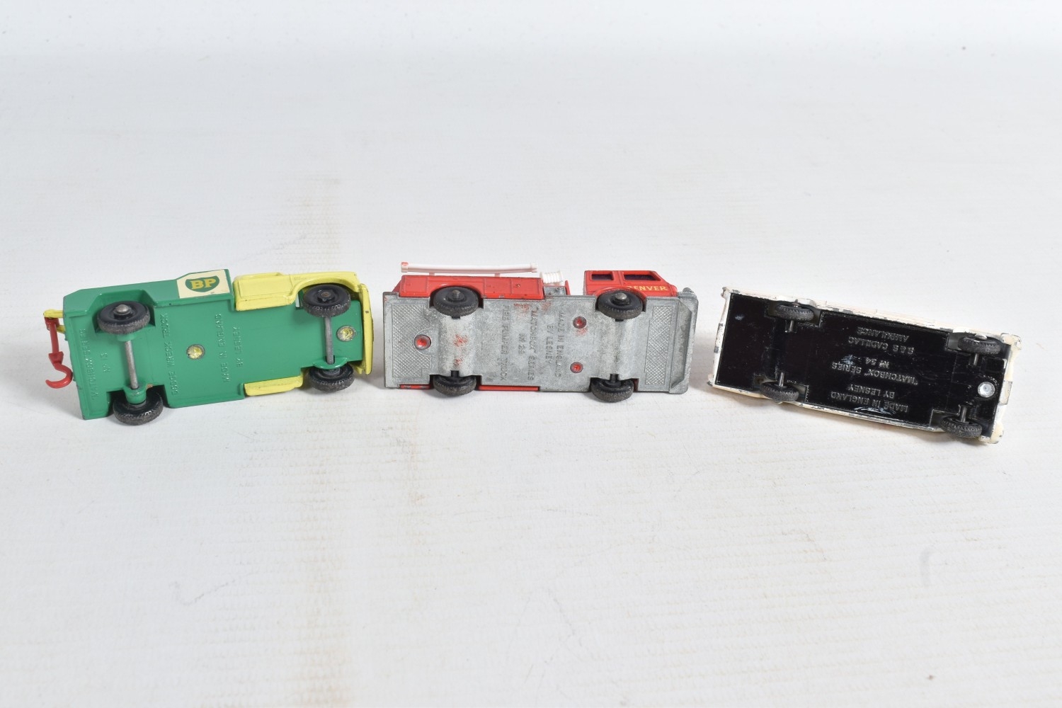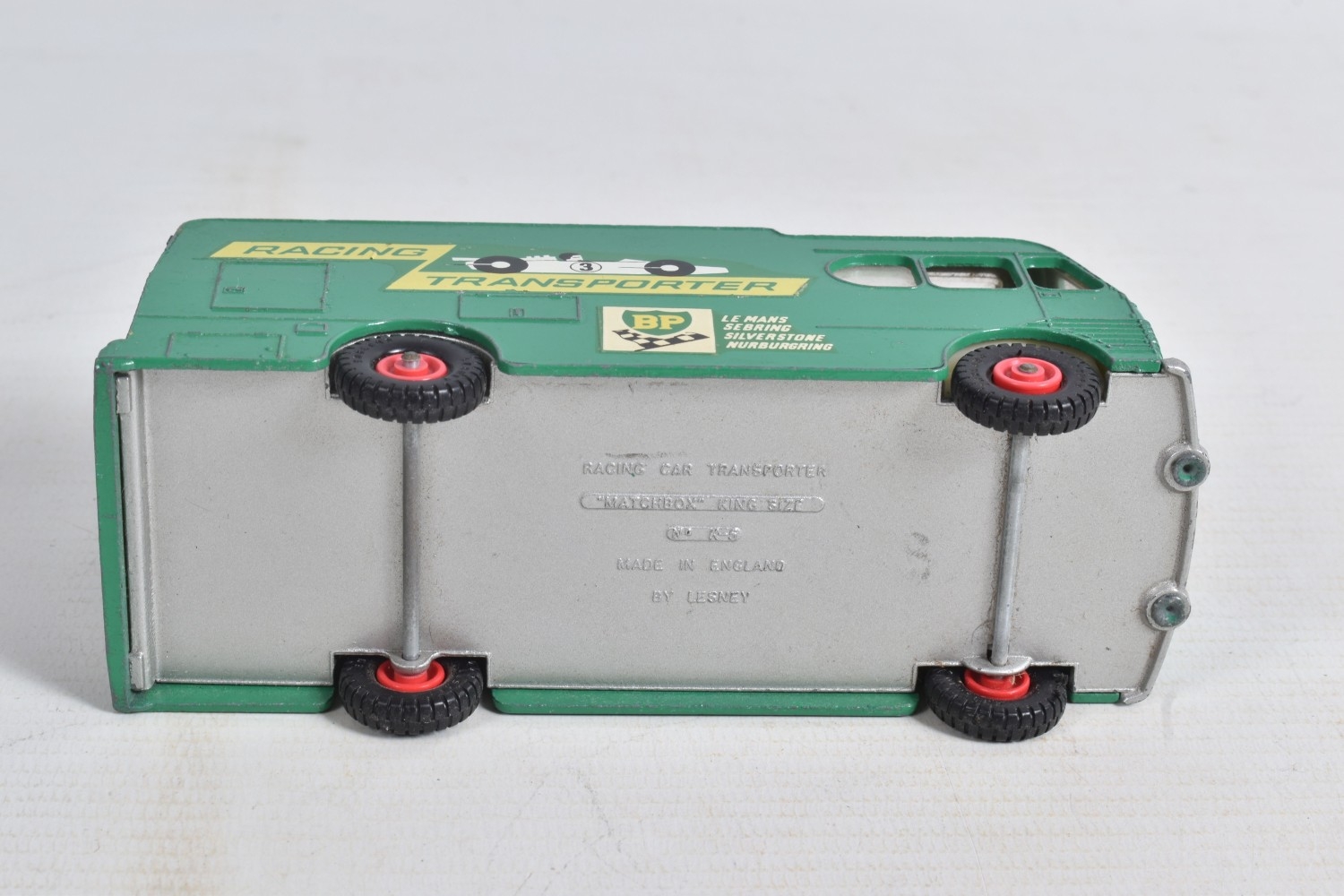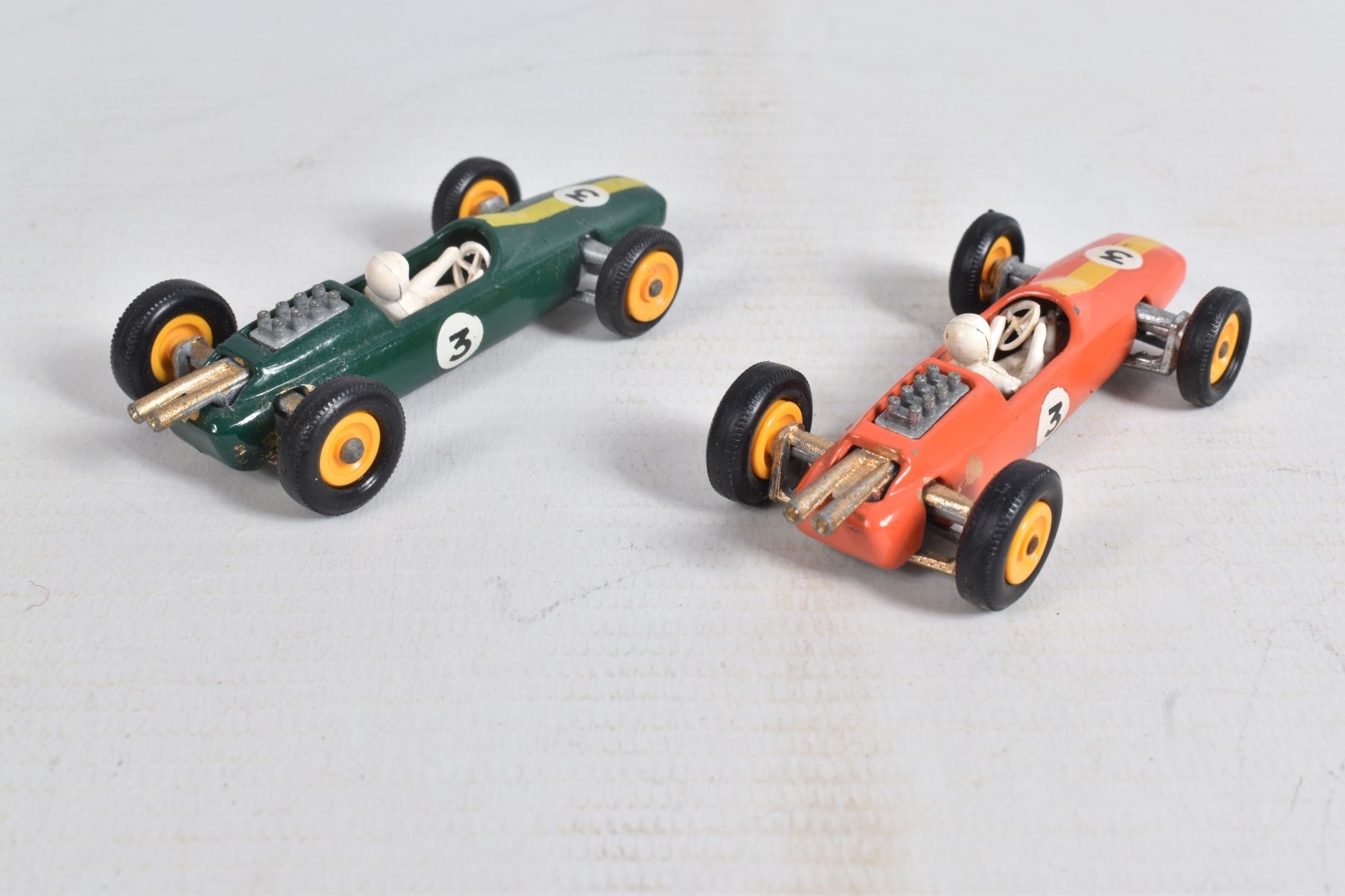 AN UNBOXED MATCHBOX GRAND PRIX RACE SET, No.G-4, complete correct contents, Dodge Wreck Truck, No.13, 2 x Lotus Racing Car, No.19, dark green and orange body versions both with yellow hubs, white plastic driver and RN3, 2 x Ford GT Racer, No.41, white and yellow body versions, both with yellow hubs, red interior and RN6, 2 x BRM Racing Car, No.52, blue and red body versions both with yellow hubs, white plastic driver and RN5, Cadillac Ambulance, No.54, Fire Pumper Truck, No.29, version with Denver decals, Major Pack No.M6/King Size No.K5 Racing Car Transporter, with card Race Track layout, all appear complete and in fairly good condition with some paint loss and wear, minor wear to decals, the red BRM appears to have had some re-touching to the paintwork, Ambulance missing Red Cross decal from one door, card layout appears largely complete but has some damage, wear and old repairs, no box