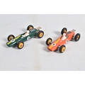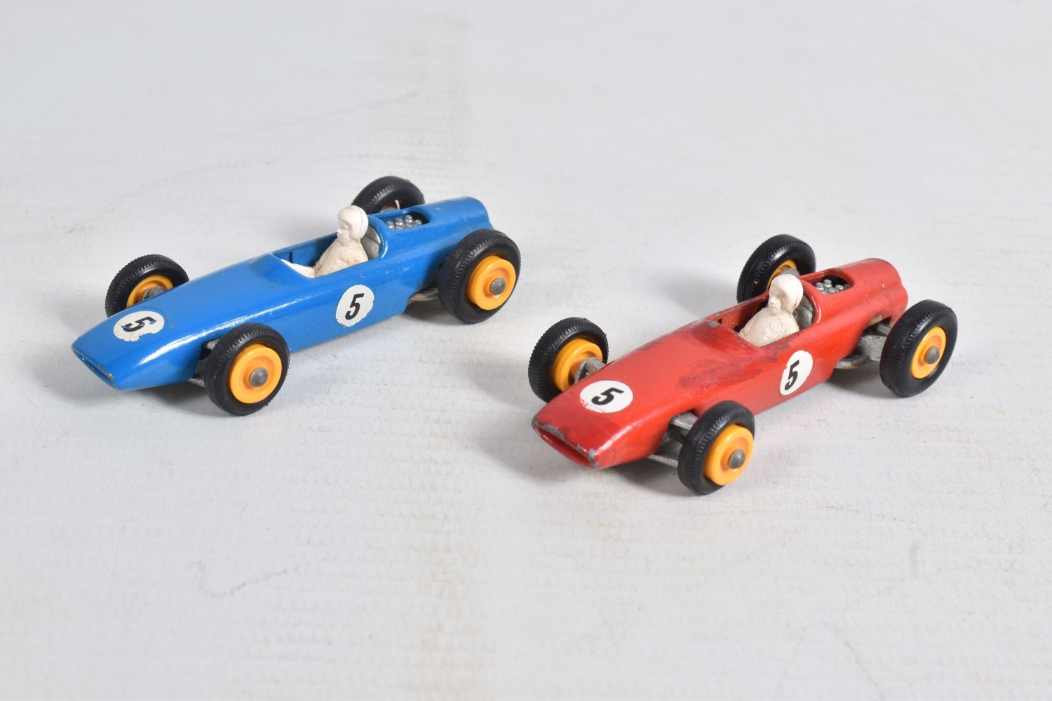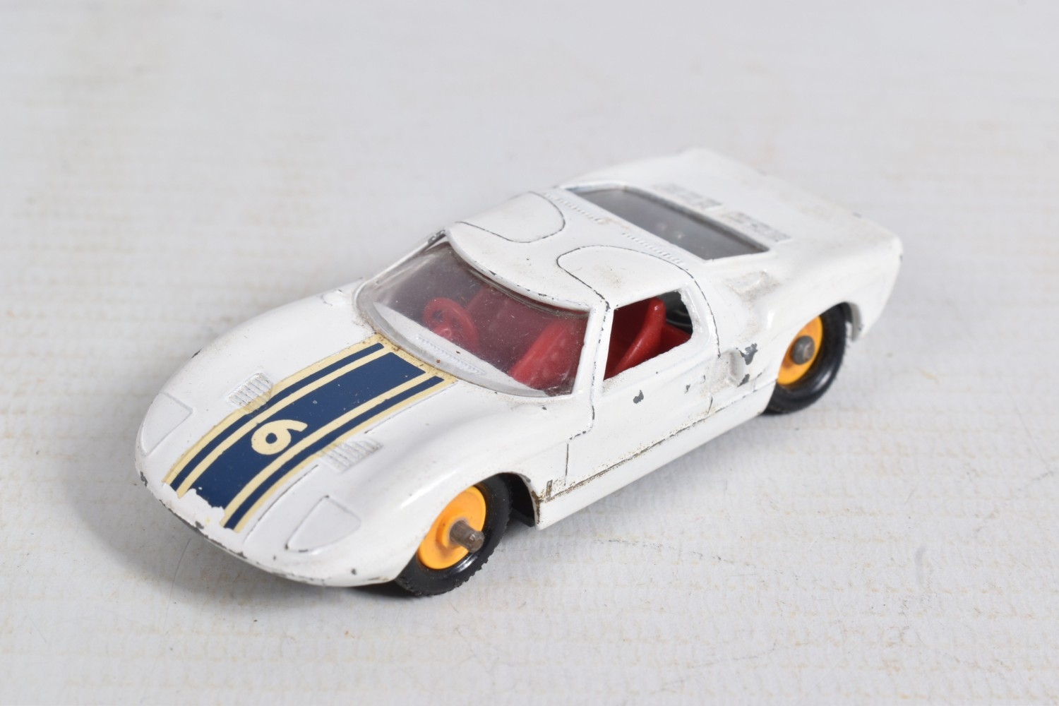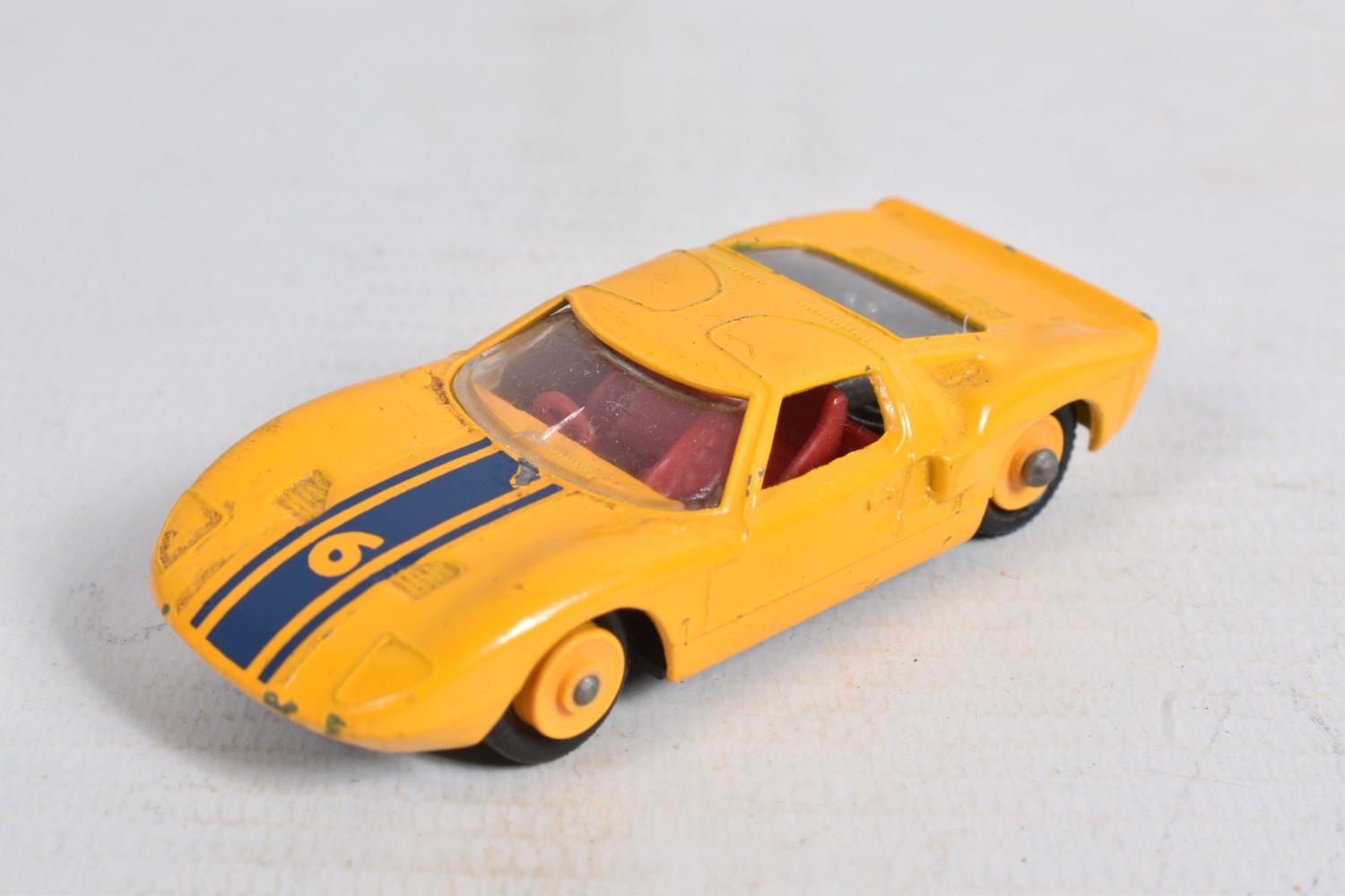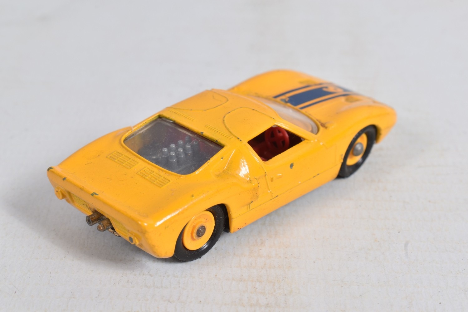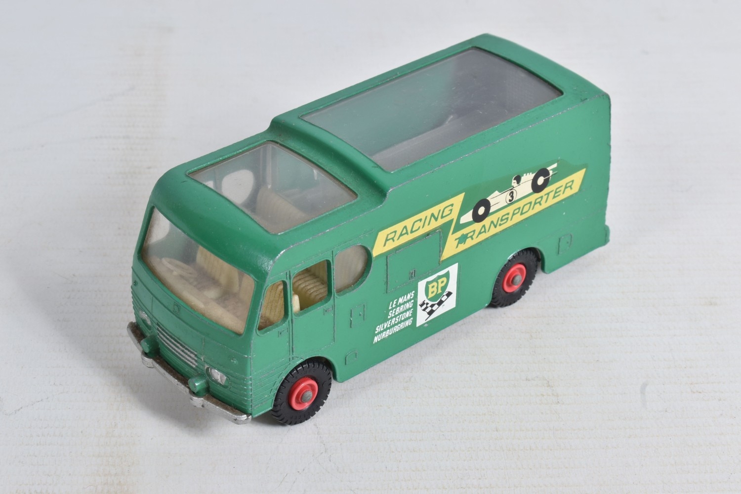AN UNBOXED MATCHBOX GRAND PRIX RACE SET, No.G-4, complete correct contents, Dodge Wreck Truck, No.13, 2 x Lotus Racing Car, No.19, dark green and orange body versions both with yellow hubs, white plastic driver and RN3, 2 x Ford GT Racer, No.41, white and yellow body versions, both with yellow hubs, red interior and RN6, 2 x BRM Racing Car, No.52, blue and red body versions both with yellow hubs, white plastic driver and RN5, Cadillac Ambulance, No.54, Fire Pumper Truck, No.29, version with Denver decals, Major Pack No.M6/King Size No.K5 Racing Car Transporter, with card Race Track layout, all appear complete and in fairly good condition with some paint loss and wear, minor wear to decals, the red BRM appears to have had some re-touching to the paintwork, Ambulance missing Red Cross decal from one door, card layout appears largely complete but has some damage, wear and old repairs, no box